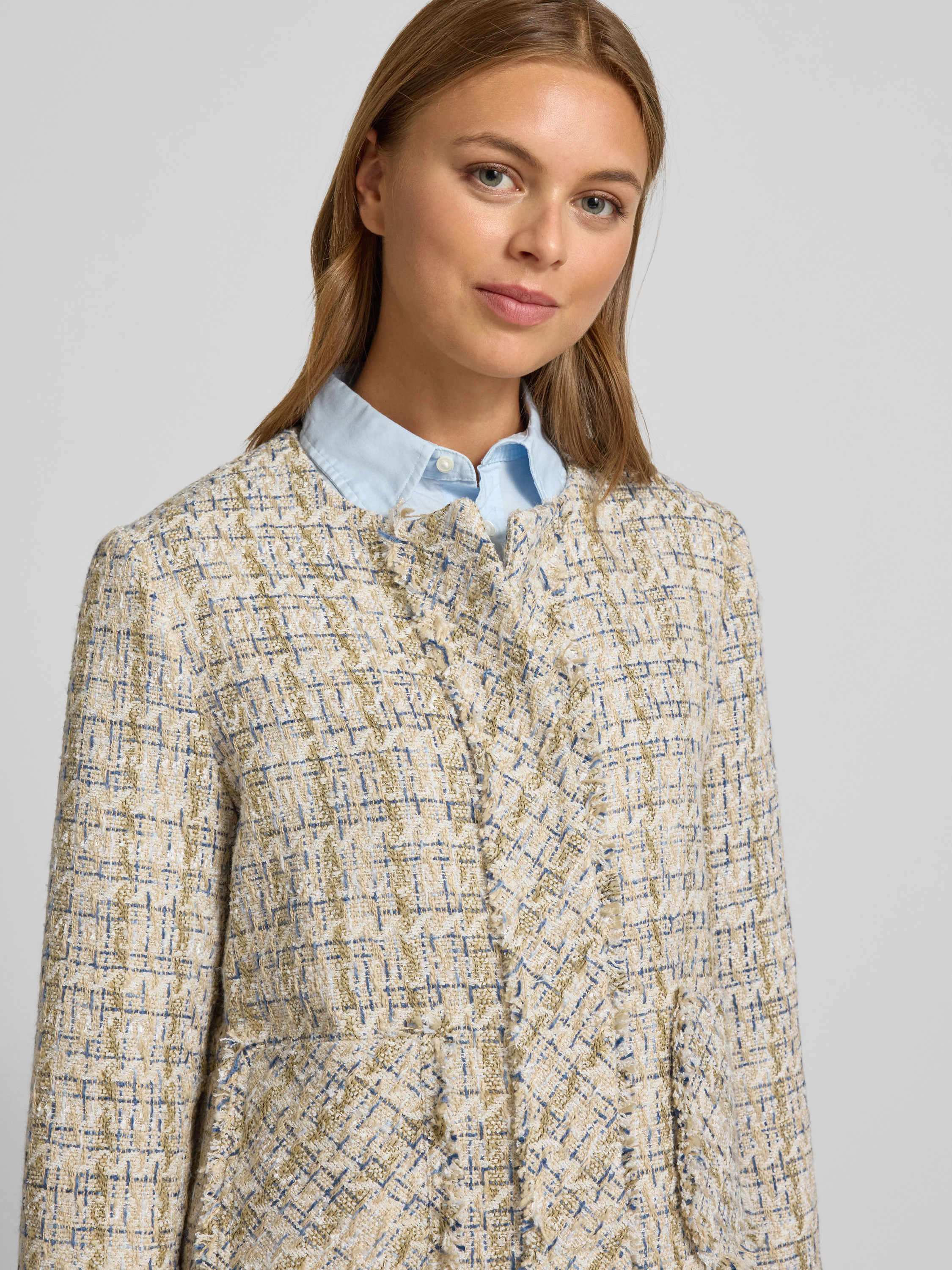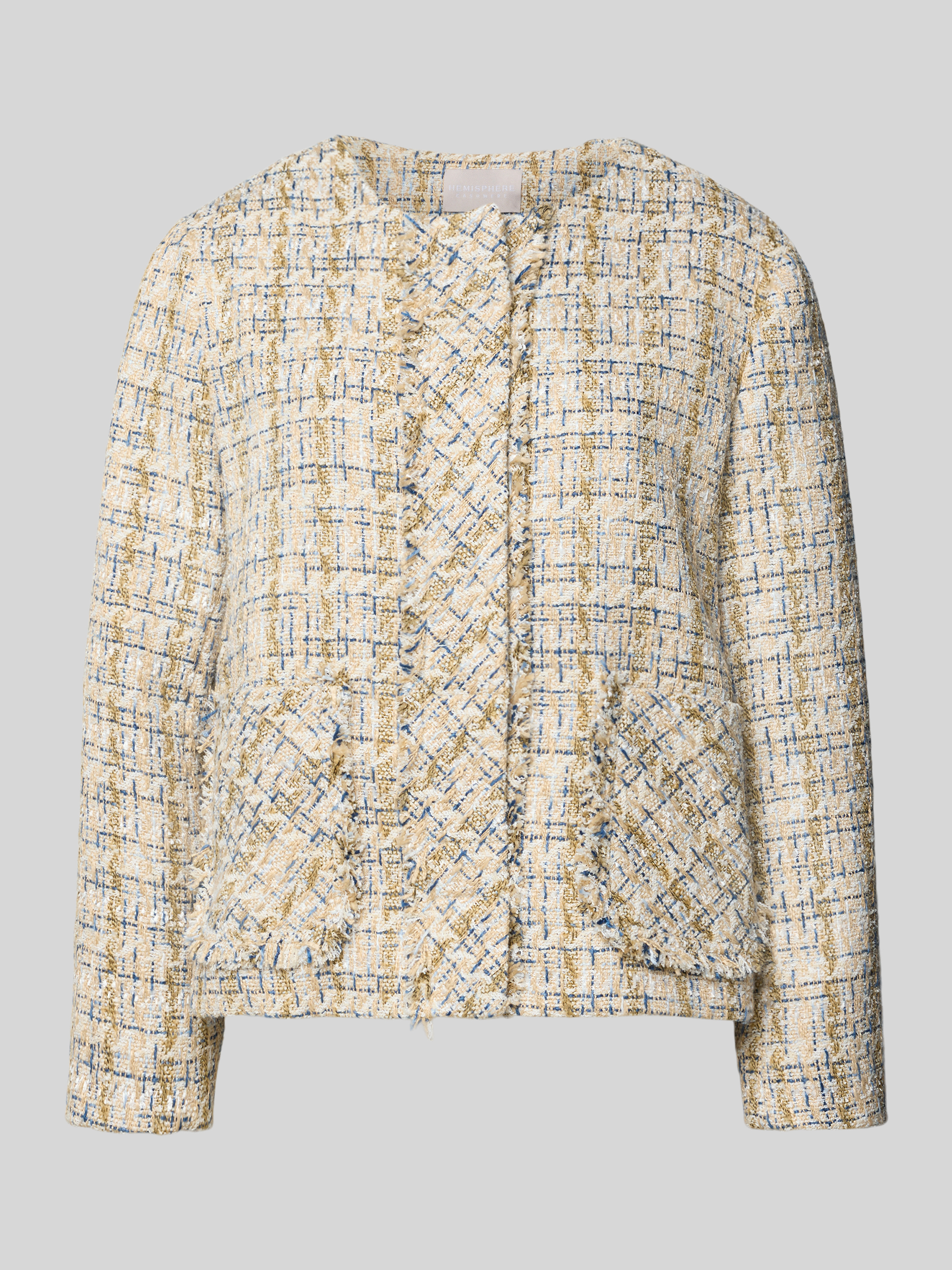 Der Blazer mit Eingrifftaschen von Hemisphere zeichnet sich durch seinen lockeren Schnitt und den klassischen Rundhalsausschnitt aus. Dank der verdeckten Knopfleiste entsteht ein zurückhaltender Look, während die praktischen Eingrifftaschen den Alltag angenehm erleichtern. So eignet sich das Modell vielseitig für verschiedene Anlässe.