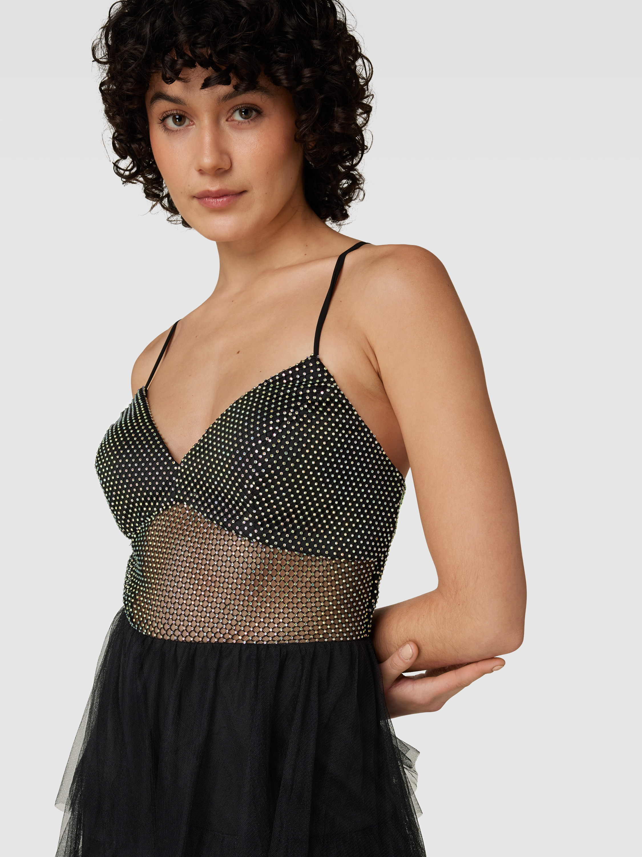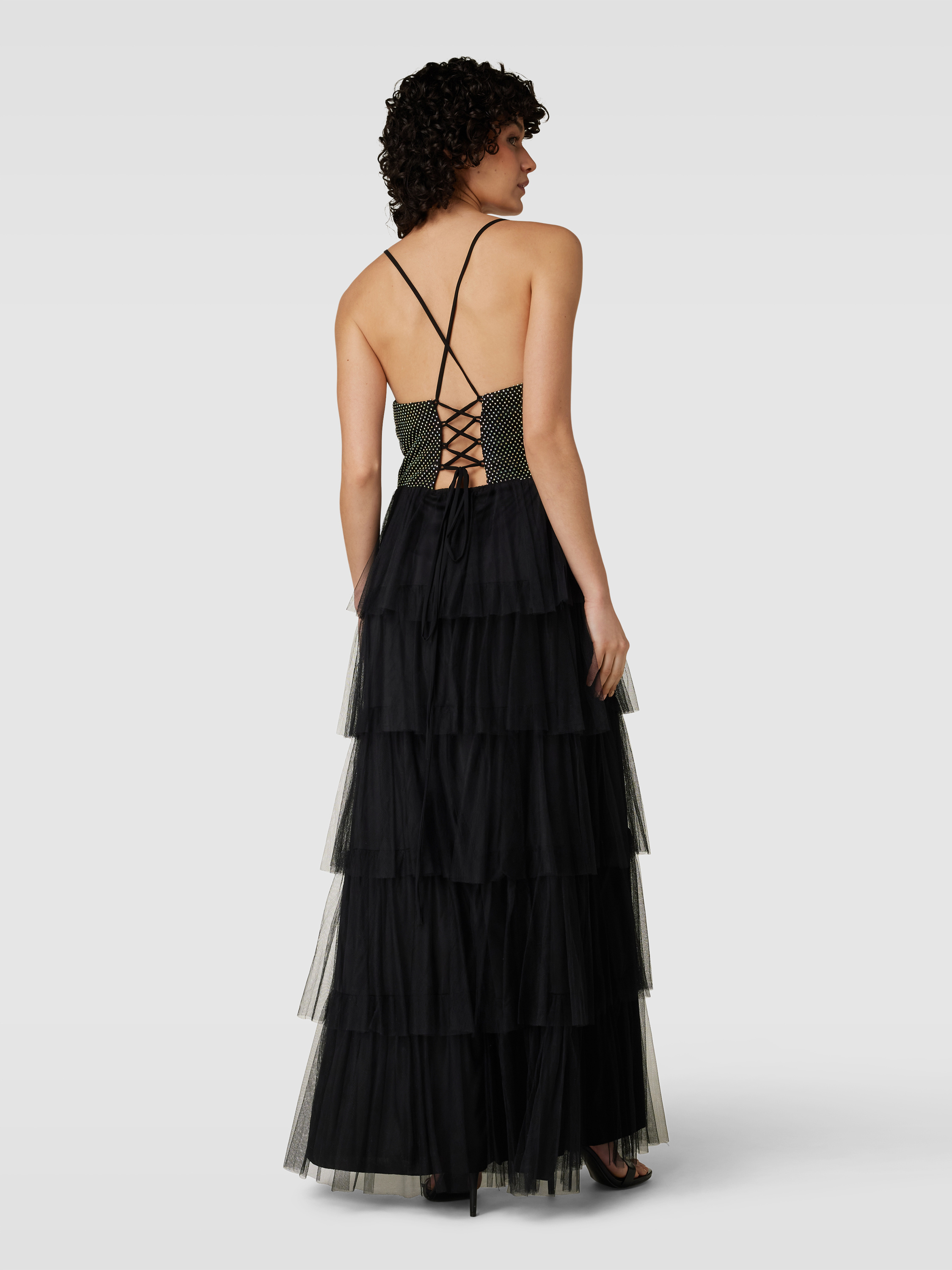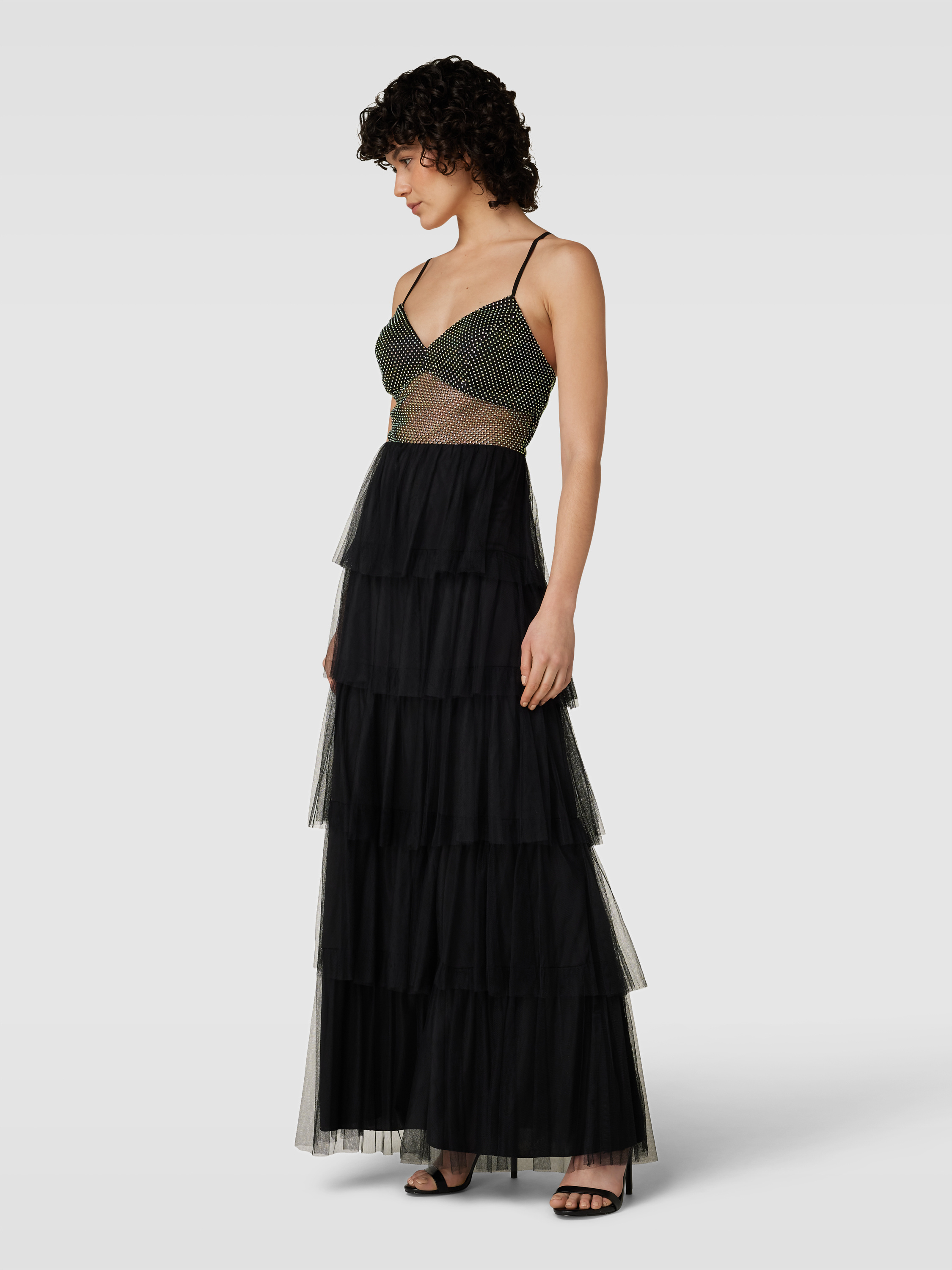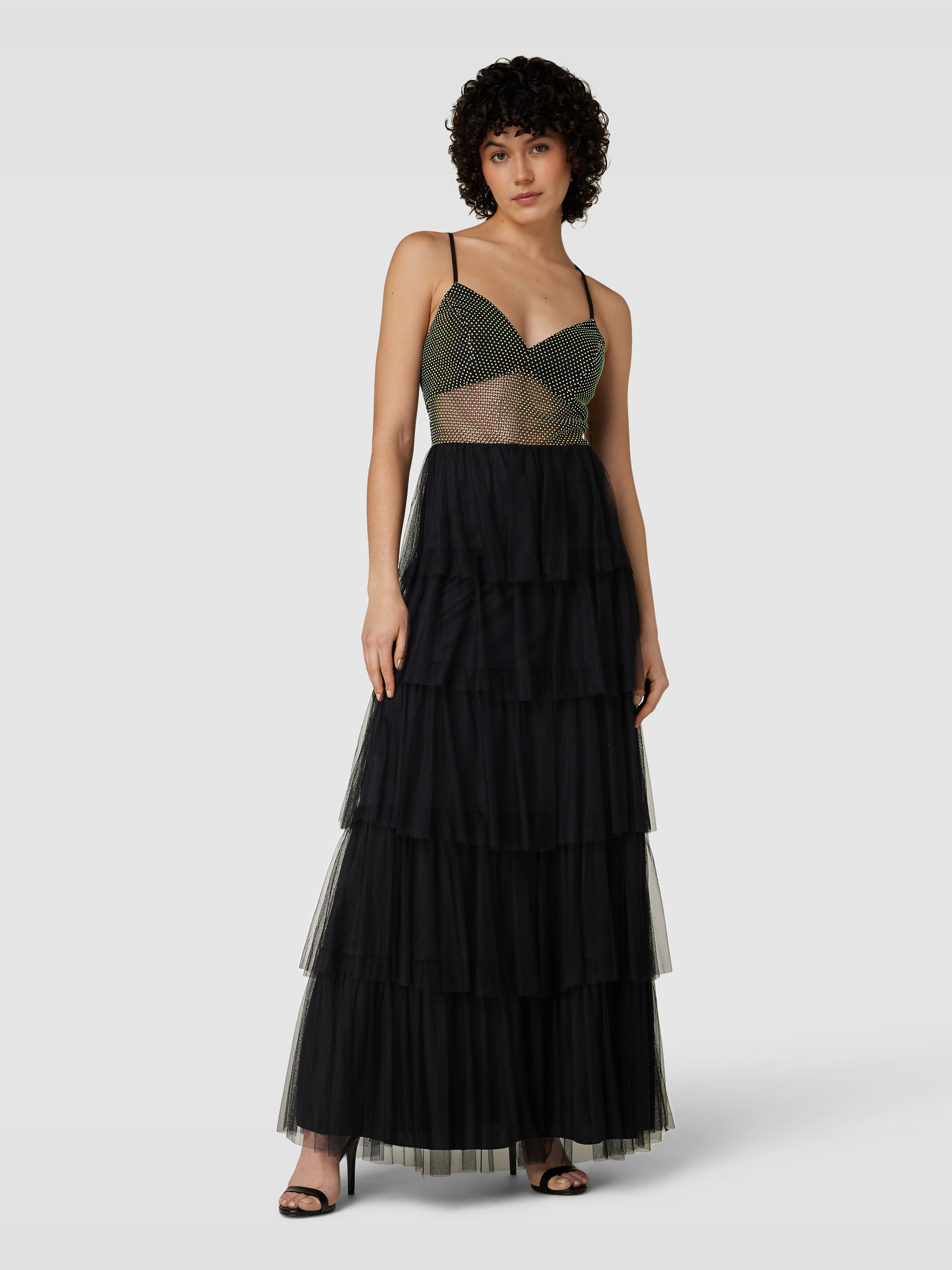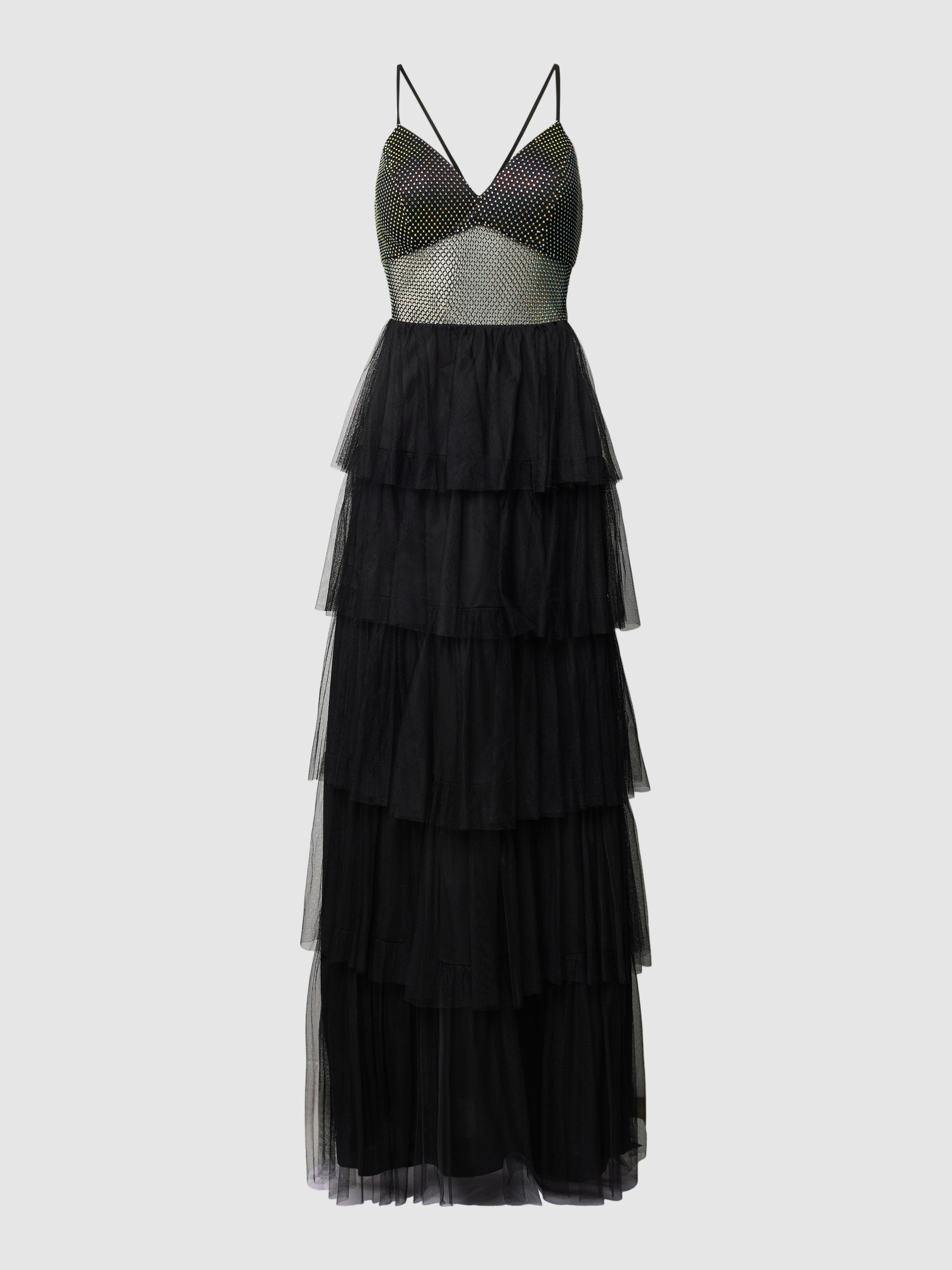 Das Abendkleid von Hey Kyla aus feinem Tüll umhüllt elegant die Silhouette und eignet sich ideal für festliche Anlässe. Der taillierte Schnitt und die Spaghettiträger betonen dezent die Figur, während der Stufen-Look für einen fließenden Fall sorgt. Ziersteinbesatz verleiht dem Maxikleid einen edlen Akzent.