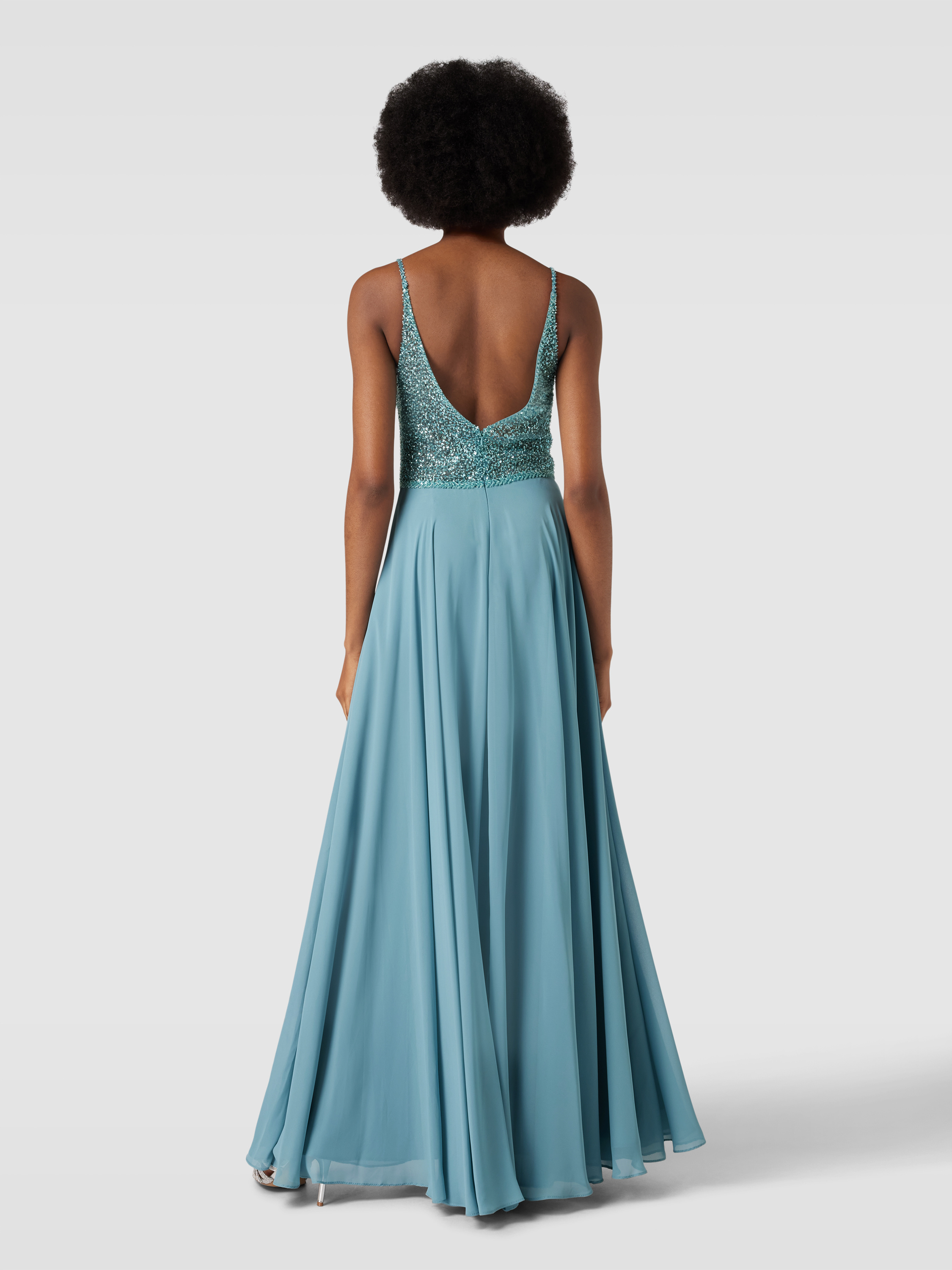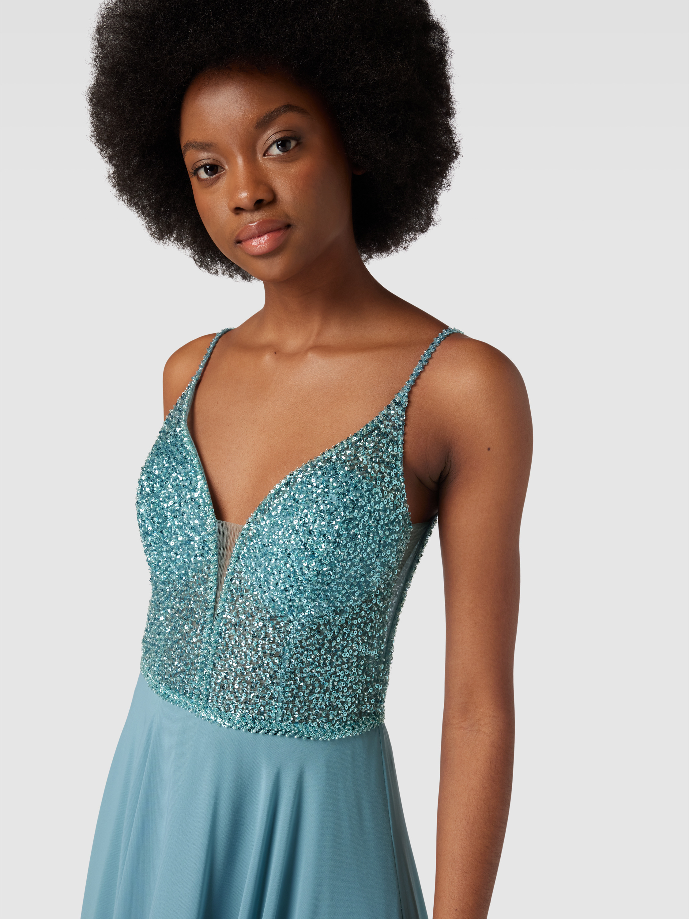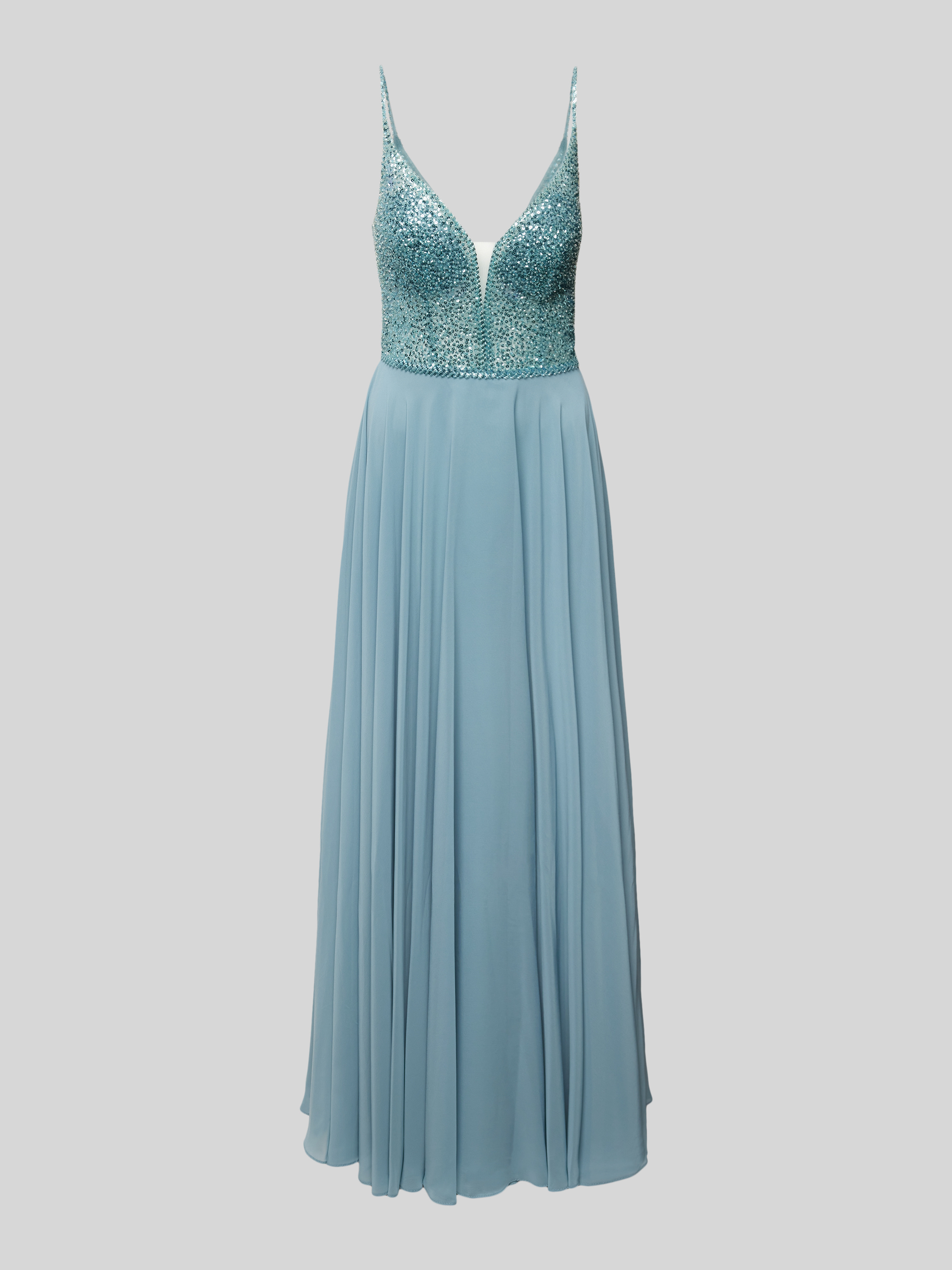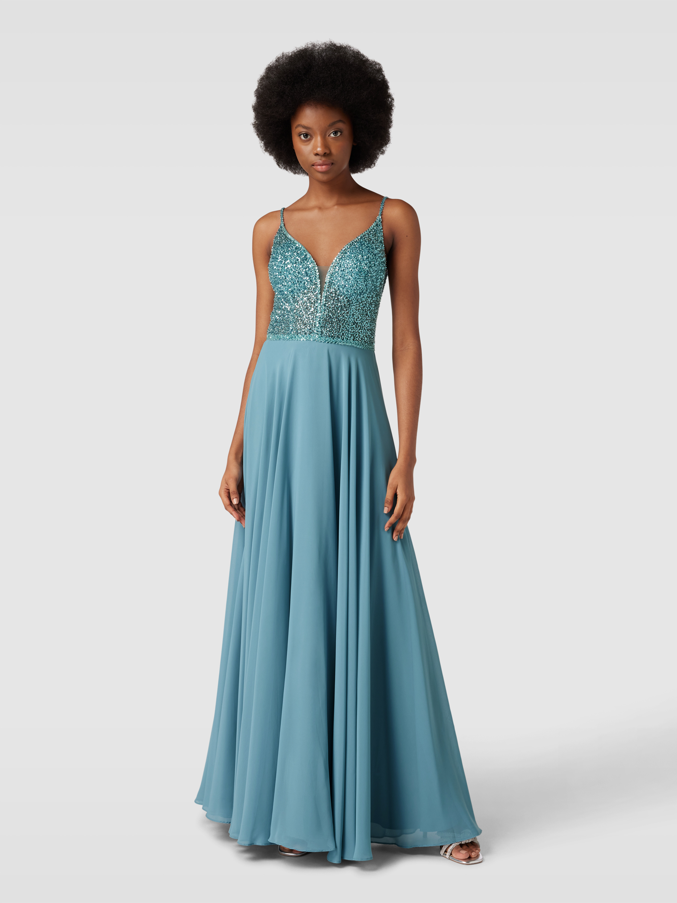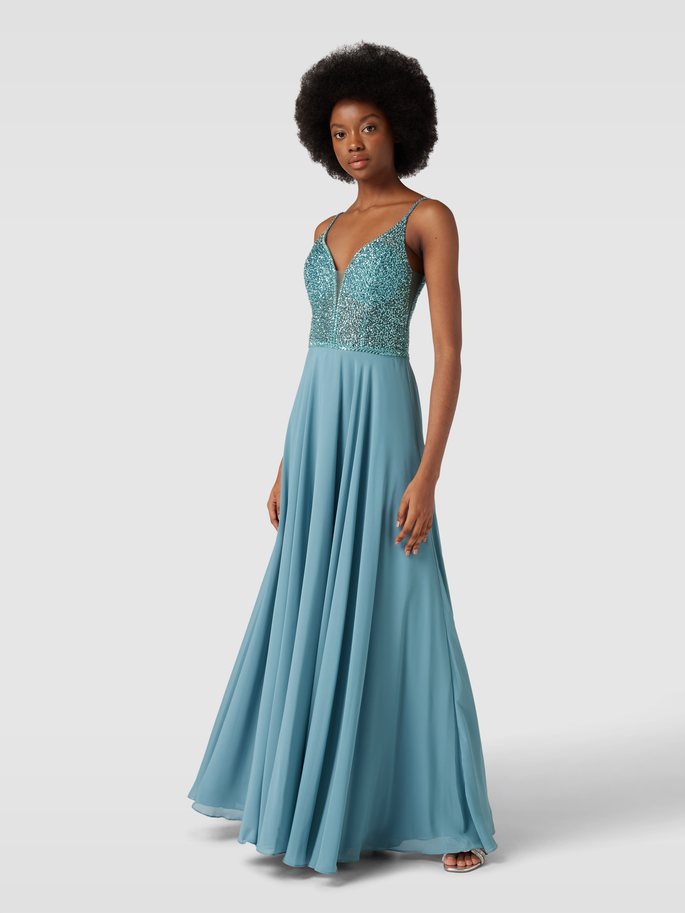 Das elegante Abendkleid von Hey Kyla zeichnet sich durch seinen fließenden Chiffonstoff und einen femininen, taillierten Schnitt aus. Der V-Ausschnitt und die funkelnden Pailletten verleihen dem Maxi-Kleid einen Hauch von Raffinesse. Ideal für besondere Anlässe geeignet.