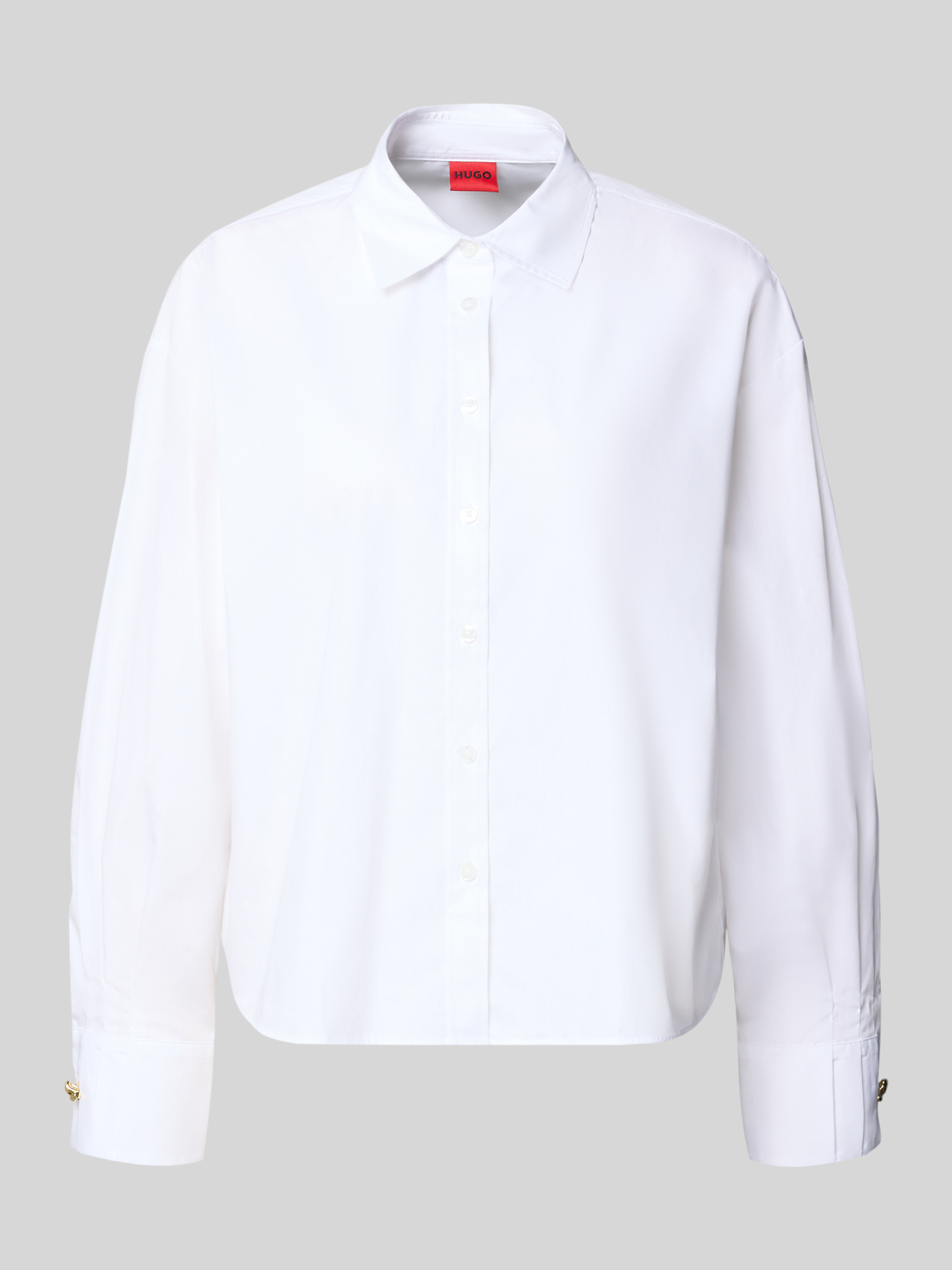 Die Damen Hemdbluse von HUGO, Modell Elma, zeigt sich in einer modernen Boxy Fit-Silhouette aus reiner Baumwolle. Durch den klassischen Hemdblusenkragen und die dezenten Label-Manschettenknöpfe entsteht ein vielseitiger Look, der sich unkompliziert in verschiedene Outfits integrieren lässt. Die doppelte Cacharel-Falte im Rücken sorgt für angenehme Bewegungsfreiheit und unterstreicht den entspannten Charakter.