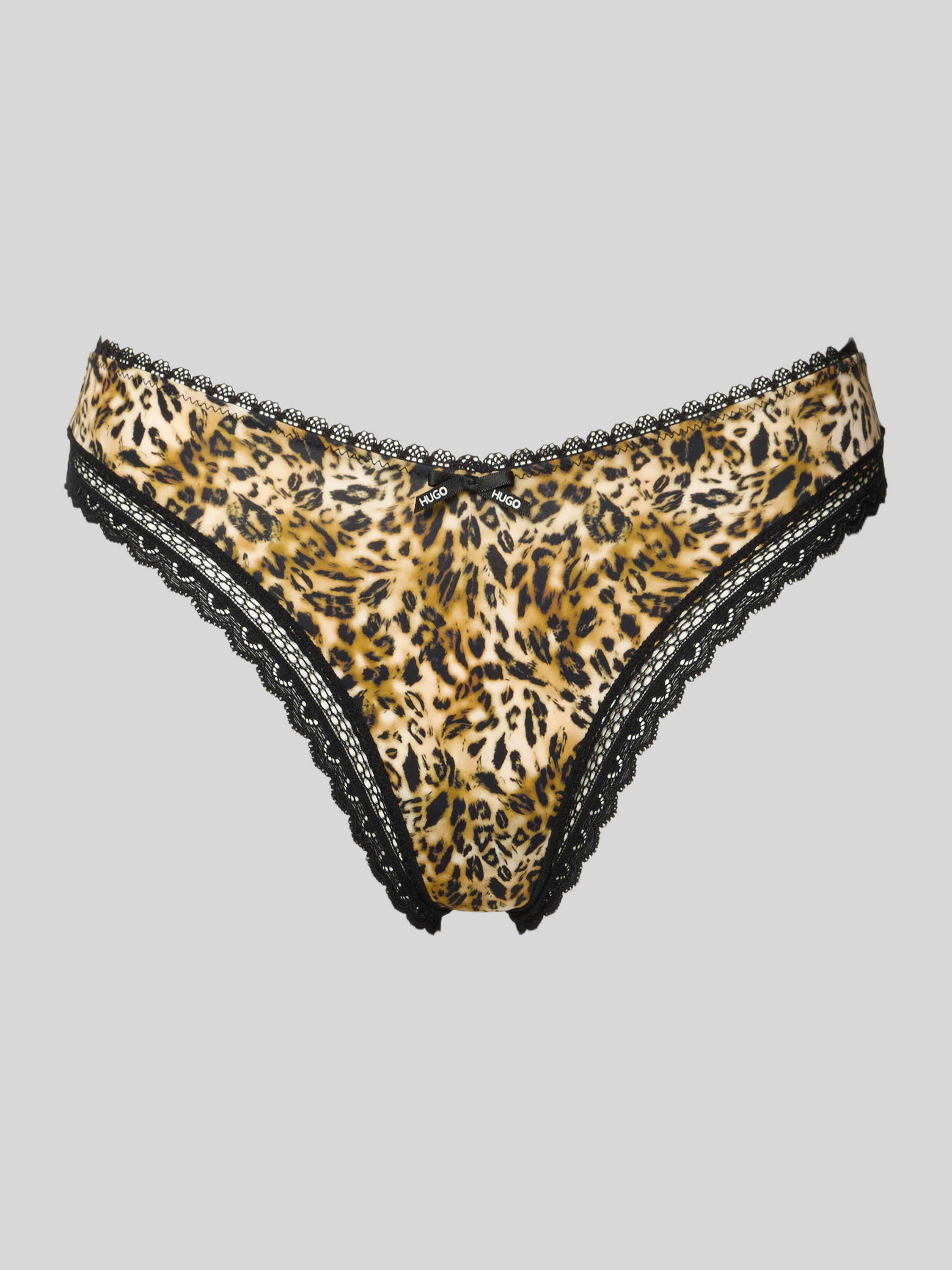 Der Damen String von HUGO, Modell 'Unique', zeigt ein markantes Allover-Muster im Animal Print und setzt mit einem feinen Label-Detail einen dezenten Akzent. Durch die String-Form mit Spitzenbesatz entsteht eine feminine Silhouette, die sich angenehm anpasst. So lässt sich im Alltag unbeschwerte Bewegungsfreiheit genießen.