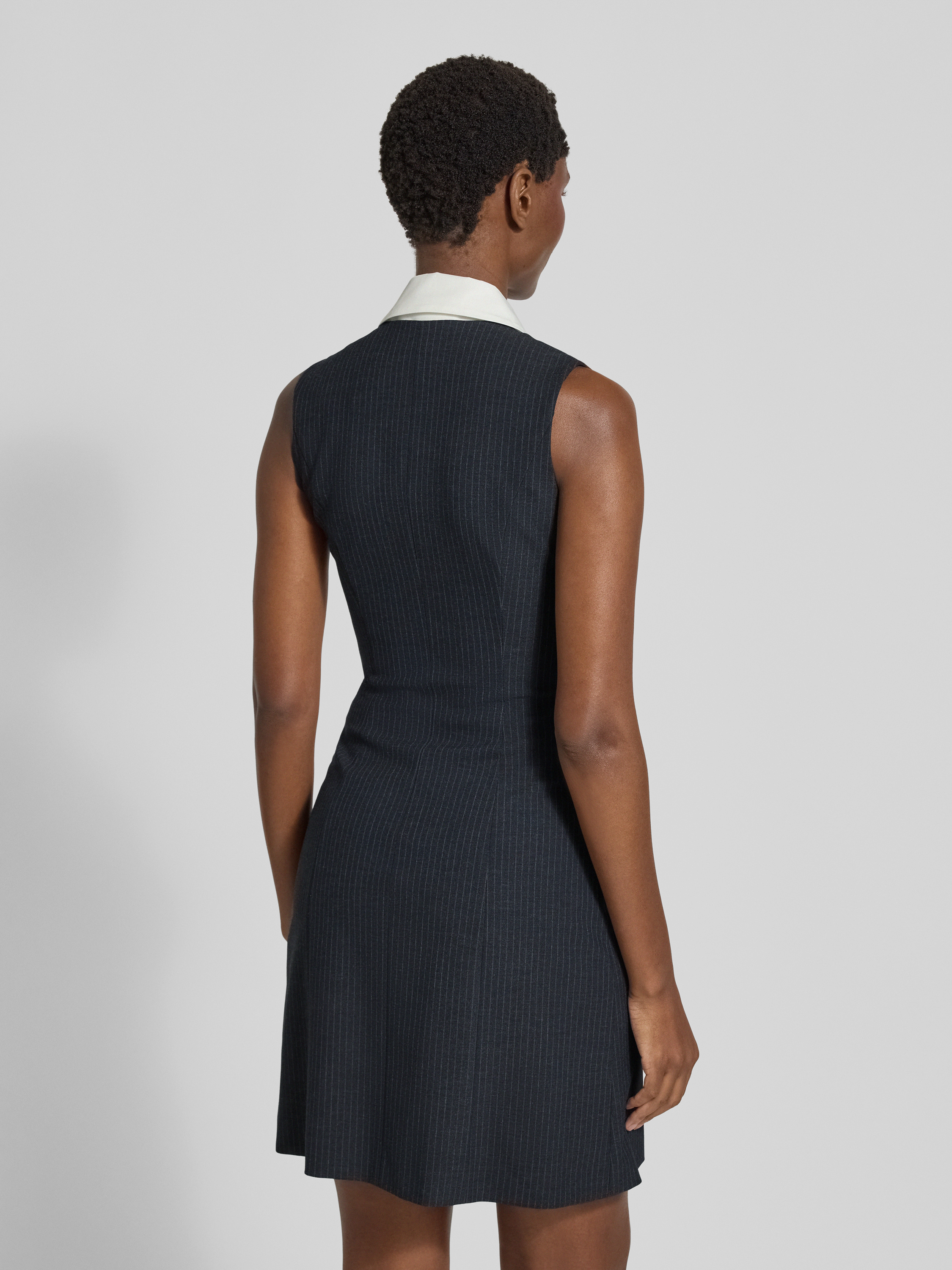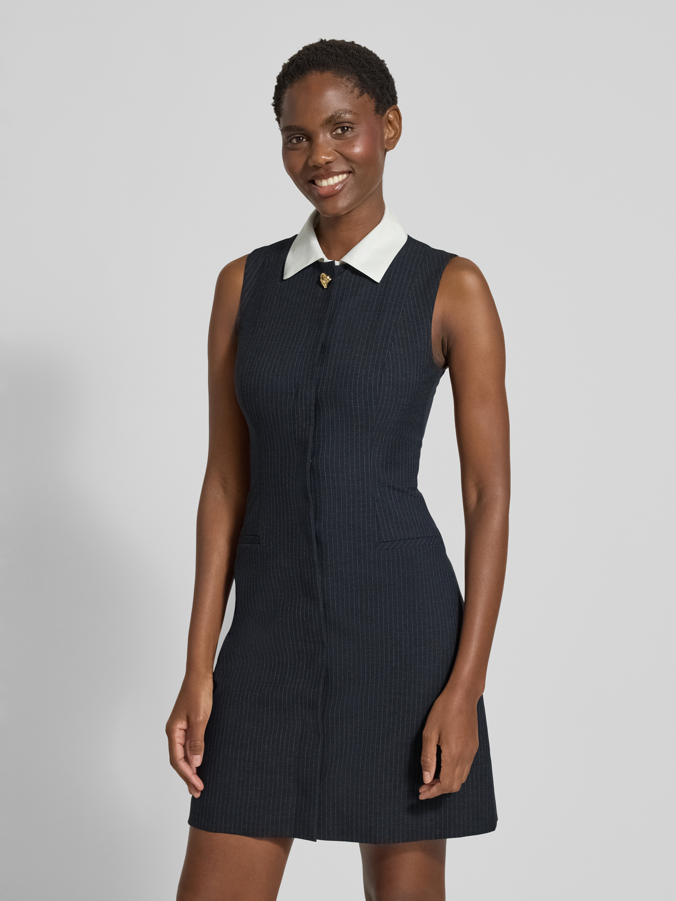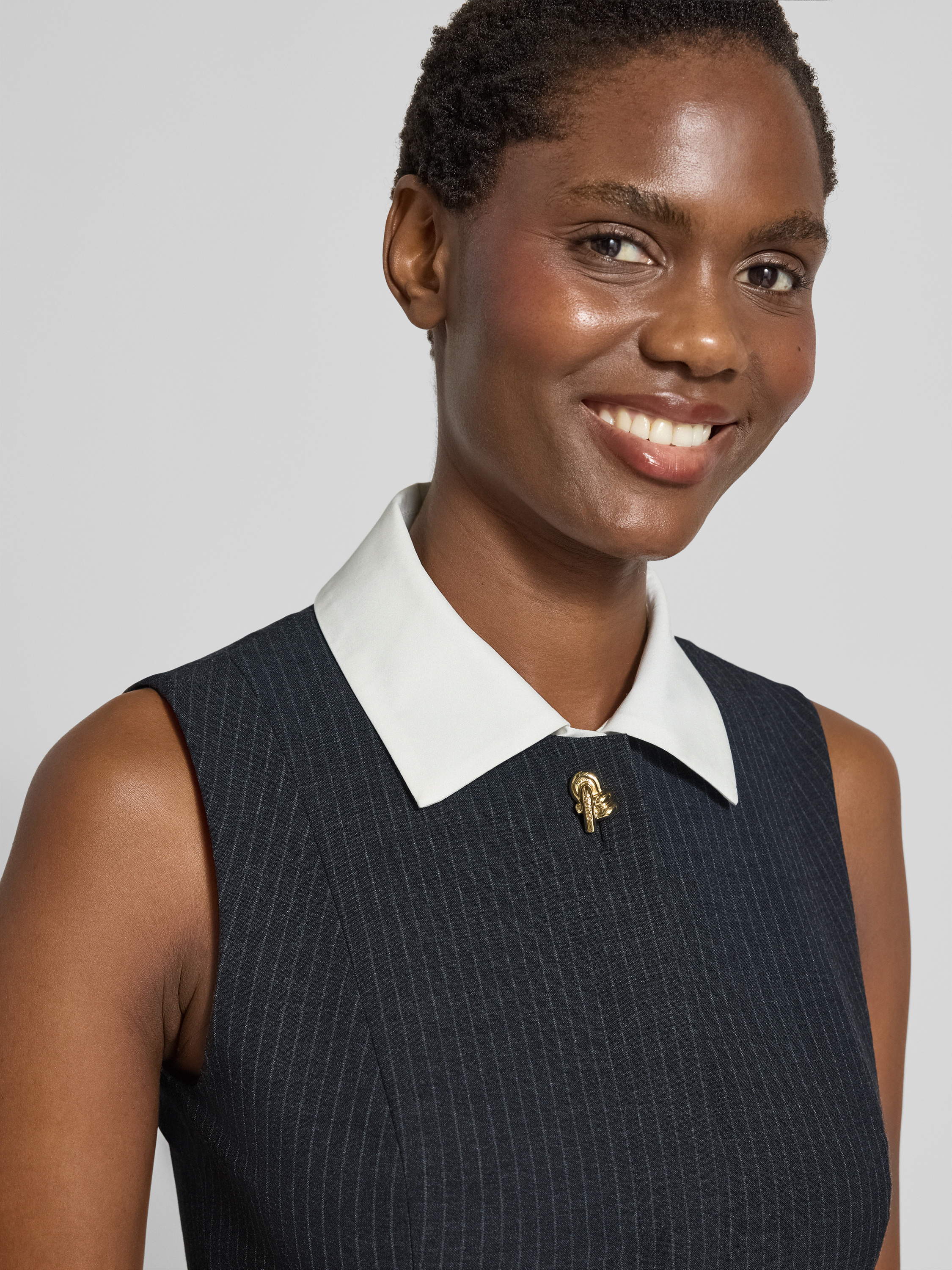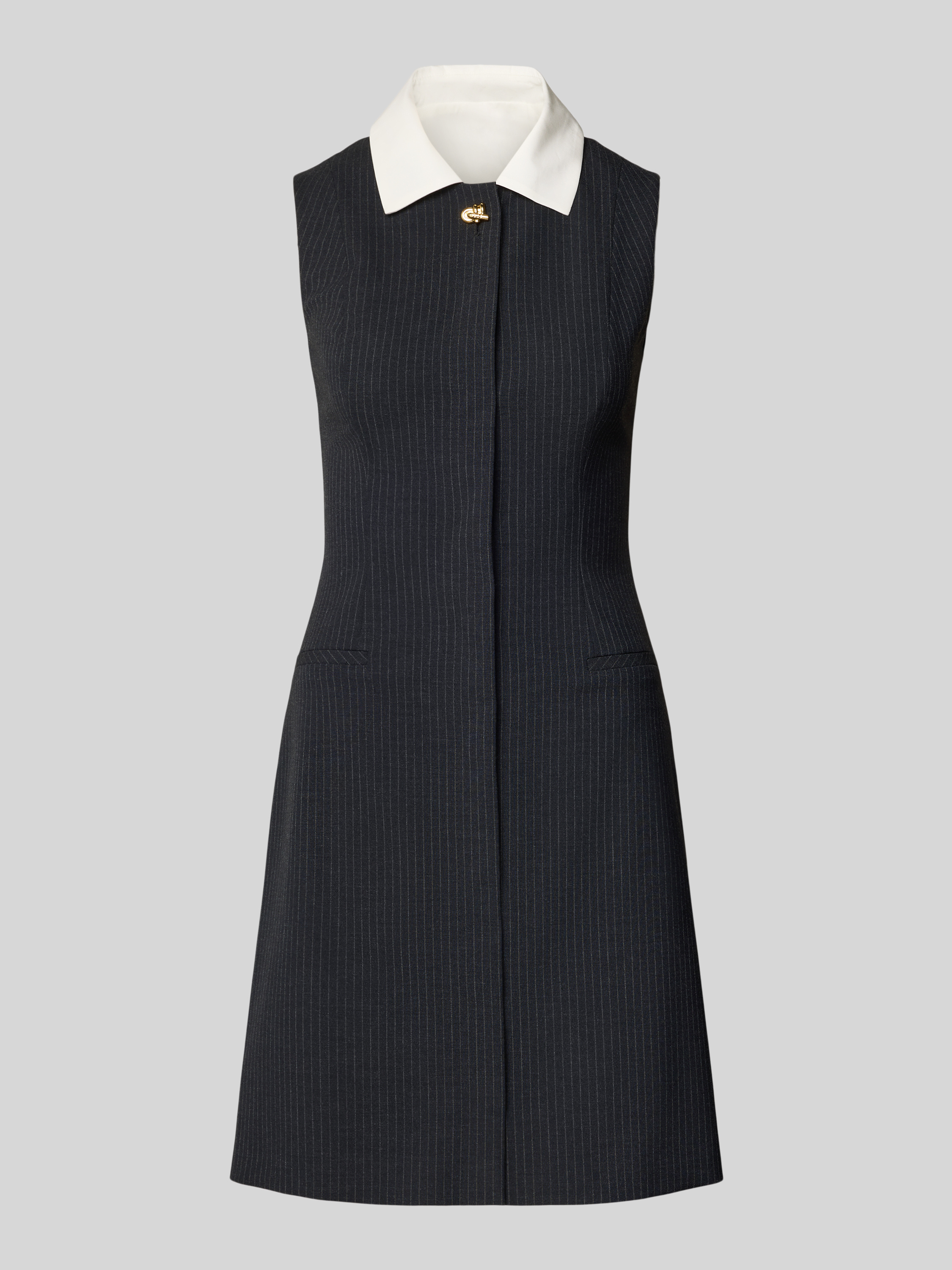 Das eng anliegende Etuikleid mit Hemdkragen Modell 'Kaledoni' von HUGO präsentiert sich mit einem klaren Nadelstreifenmuster und betont durch seine knielange, figurnahe Passform eine elegante Silhouette. Paspeltaschen unterstreichen die dezente Linienführung, während der hochgeschlossene Ausschnitt einen klassischen Akzent setzt. Ohne Ärmel eignet sich dieses Kleid für verschiedenste Anlässe.