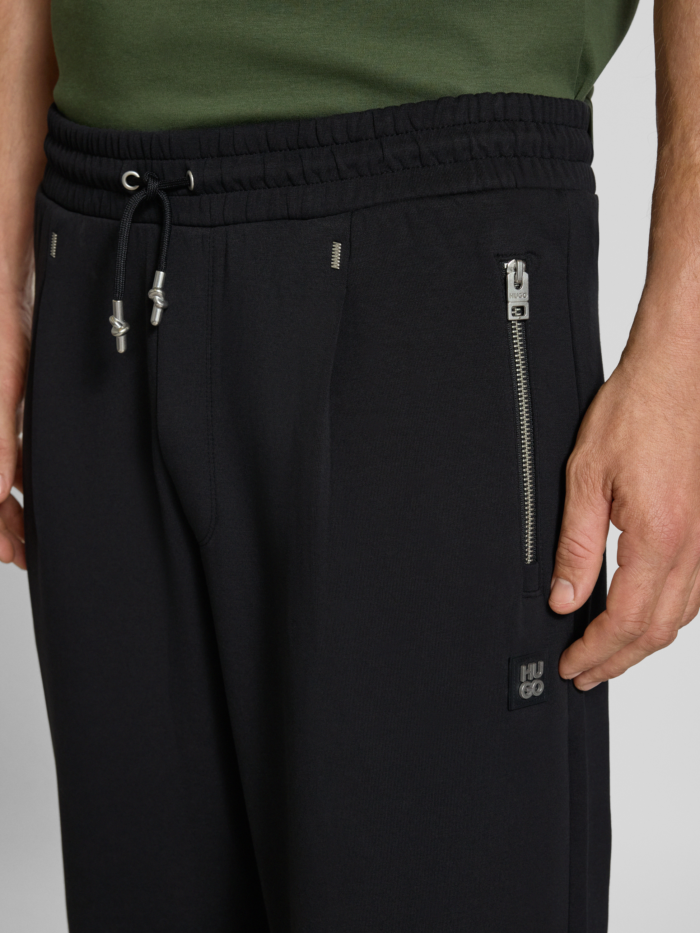 Die Sweatpants 'Dargen' von HUGO kombinieren einen lockeren Schnitt mit einem komfortablen Baumwoll-Mix und Stretch-Anteil. Der elastische Bund mit Kordelzug sorgt für individuellen Tragekomfort, während die seitlichen Reißverschlusstaschen eine praktische Aufbewahrungsmöglichkeit bieten. Ideal für entspannte Tage oder sportliche Aktivitäten.