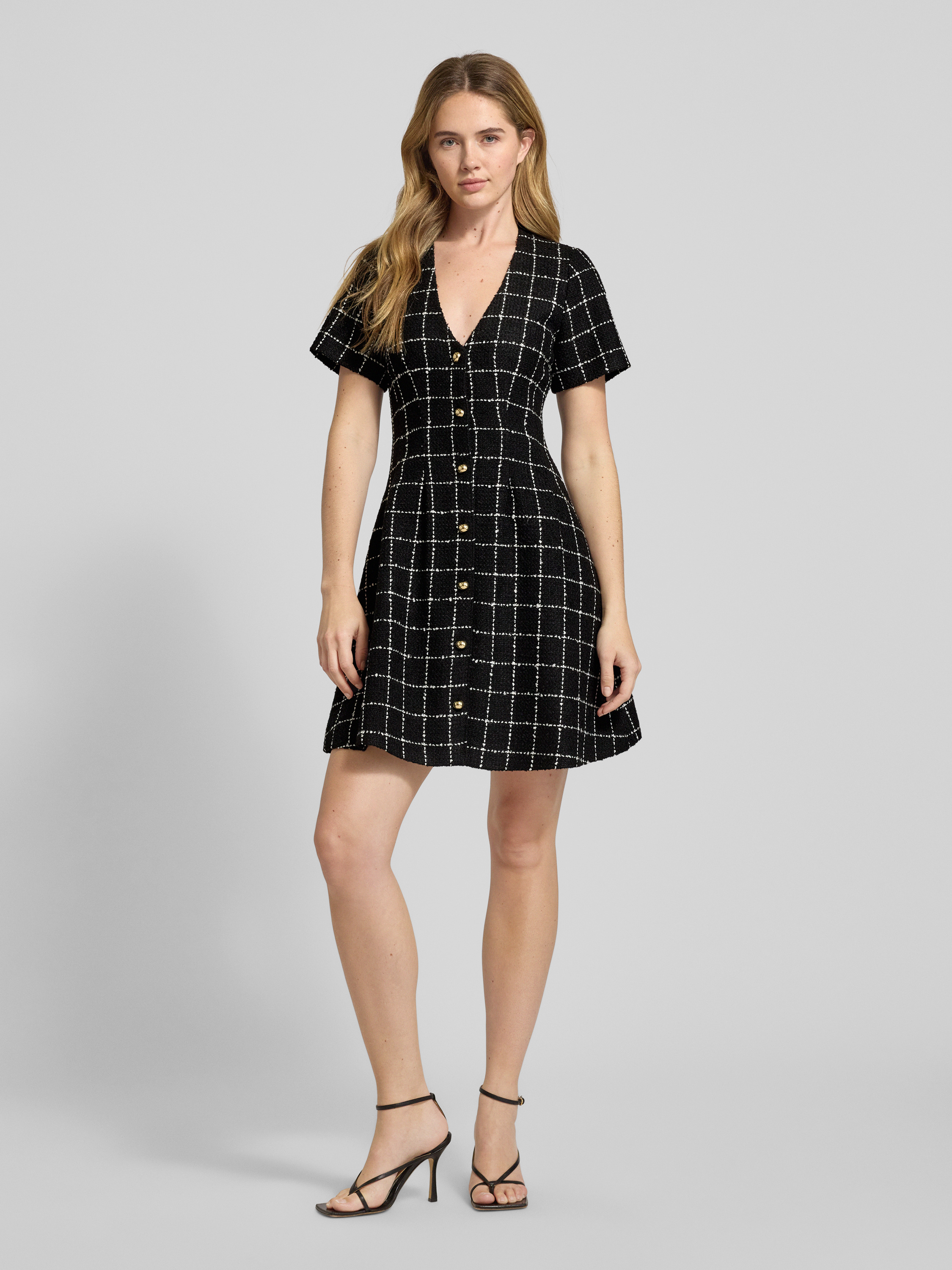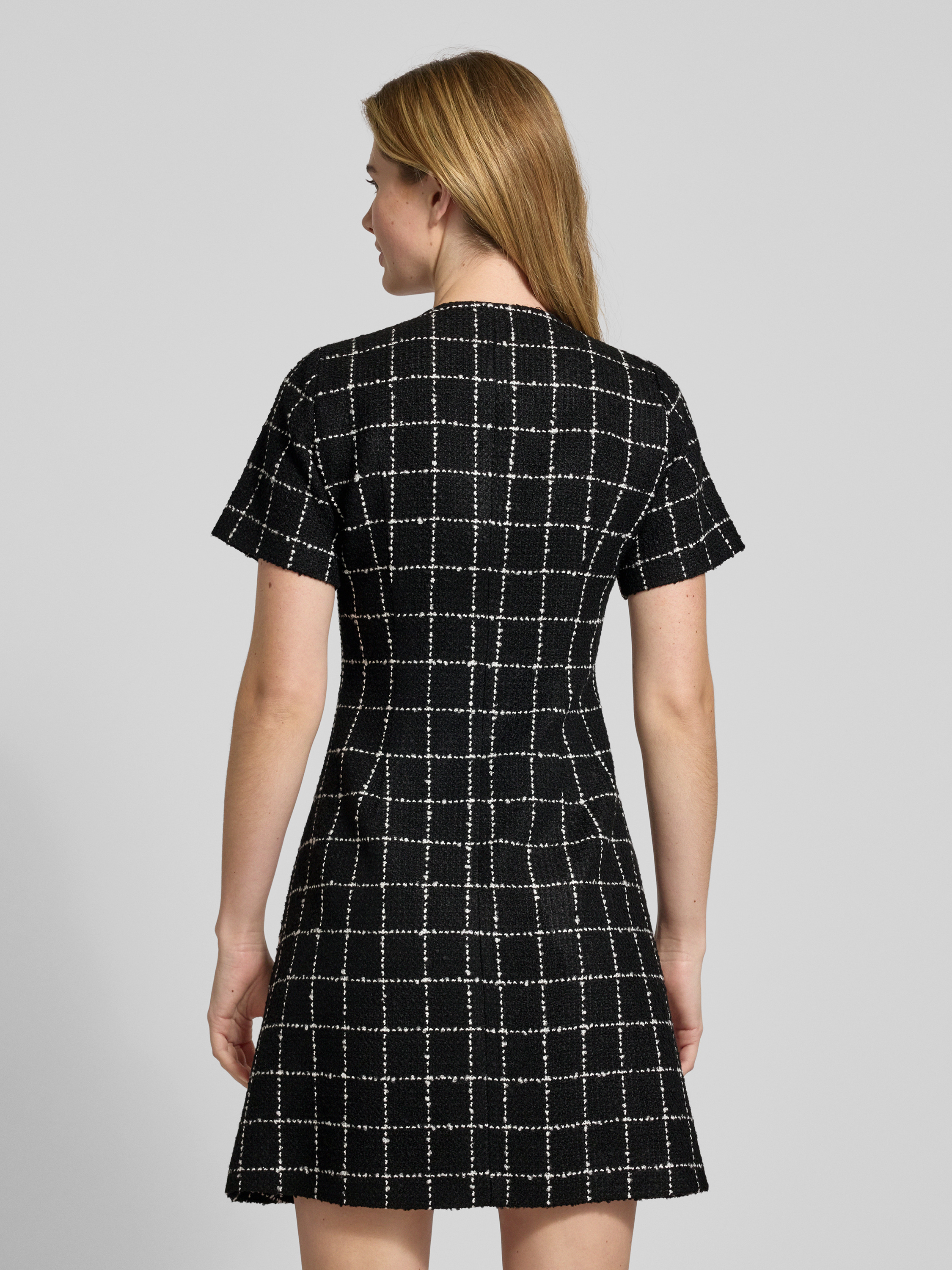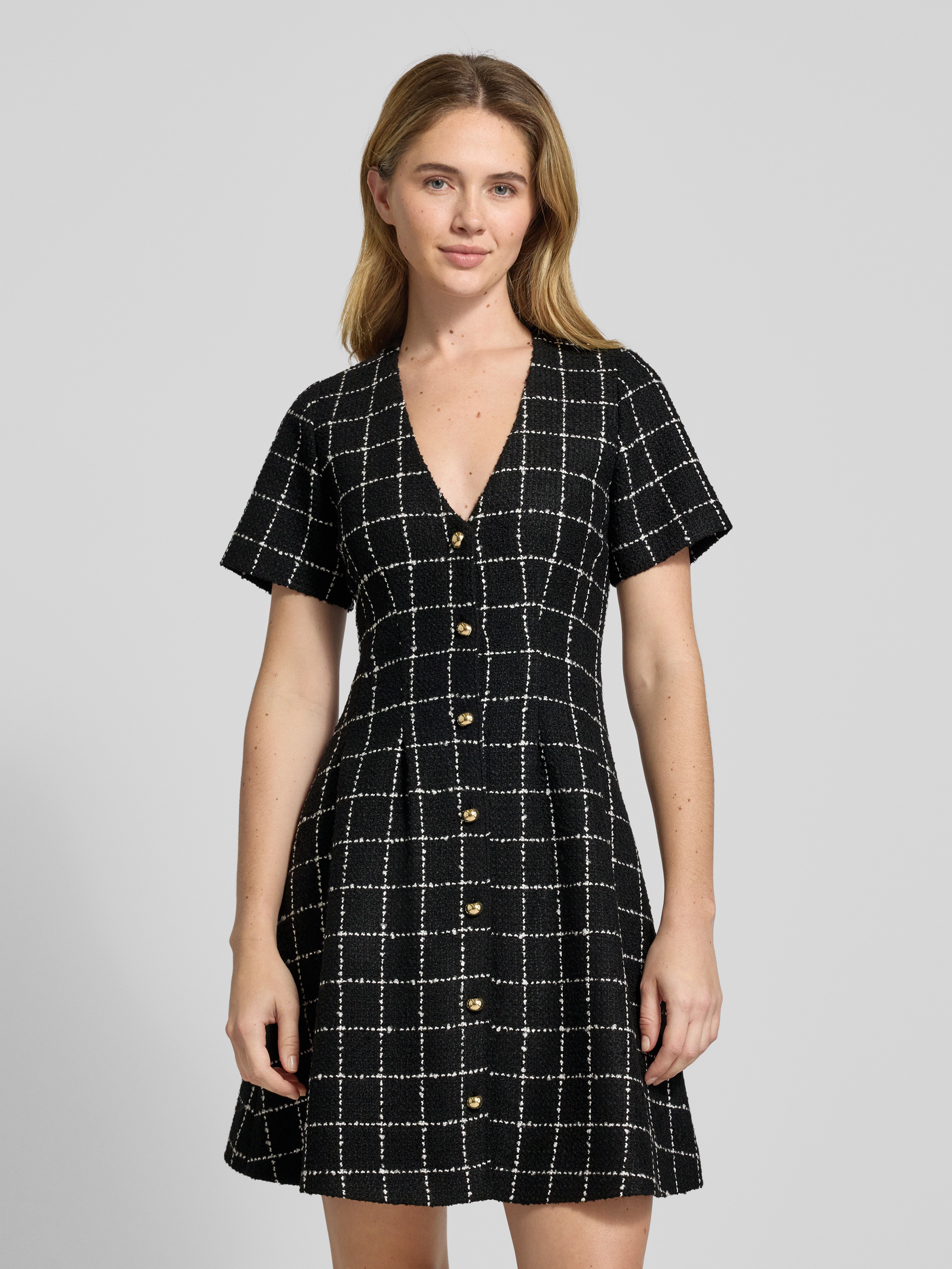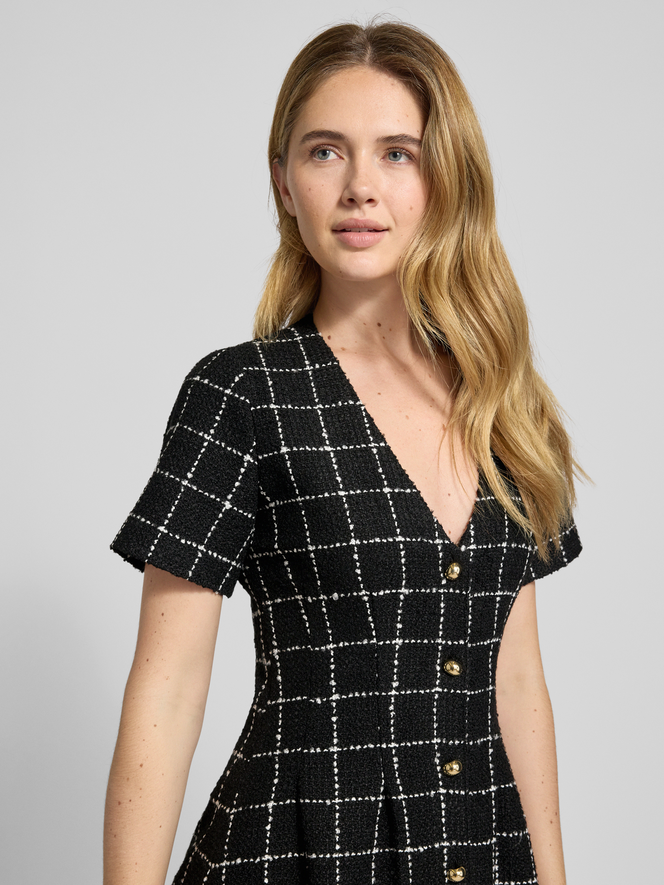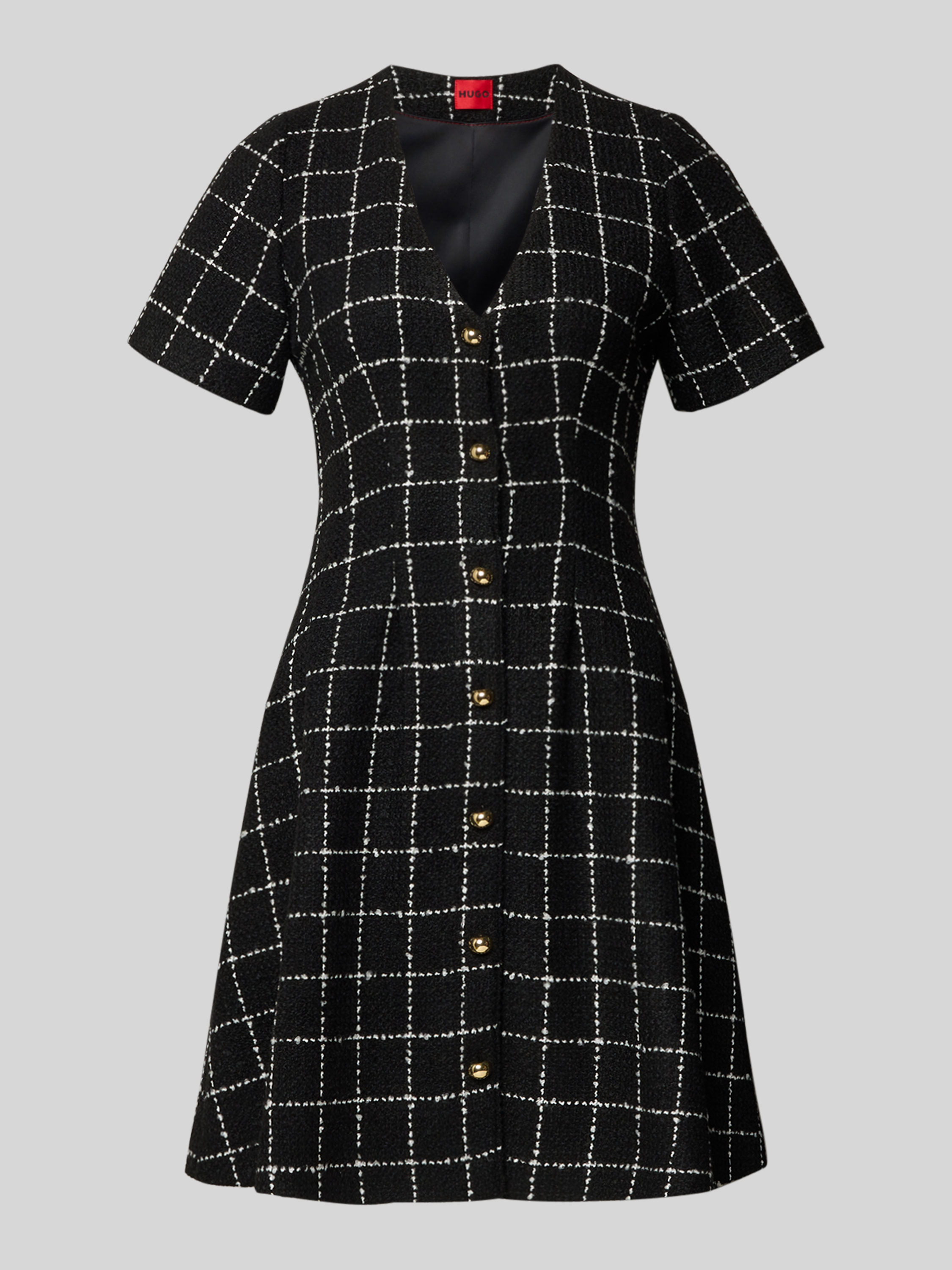 Das Damen Etuikleid von HUGO, Modell 'KIKLA', fällt durch das Gitterkaro-Muster und die taillierte Passform angenehm auf. Bouclé als Materialverarbeitung sorgt für eine strukturierte Optik, während der V-Ausschnitt und die knielange Länge vielseitige Kombinationsmöglichkeiten eröffnen. So erhält man einen unkomplizierten Begleiter für viele Gelegenheiten.