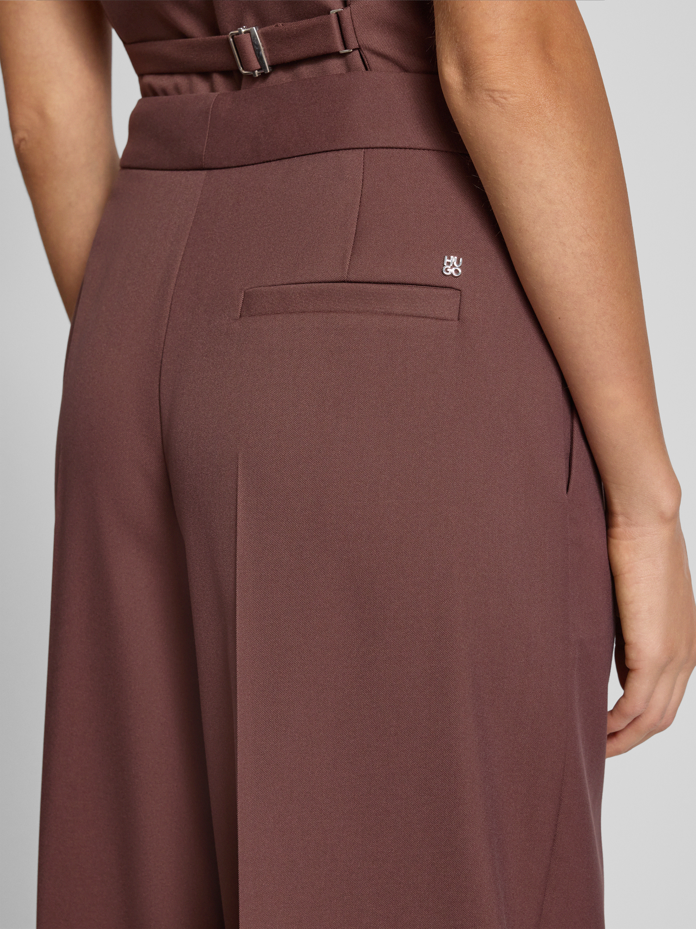 Die weite Hose von HUGO, Modell Horesa, fällt durch ihre fließende Silhouette und den unifarbenen Look angenehm auf. Dank der Wide-Leg-Passform sitzt sie locker und sorgt den ganzen Tag für ein entspanntes Tragegefühl. Dezente Bügelfalten und eine kleine Logo-Applikation runden das Design ab.