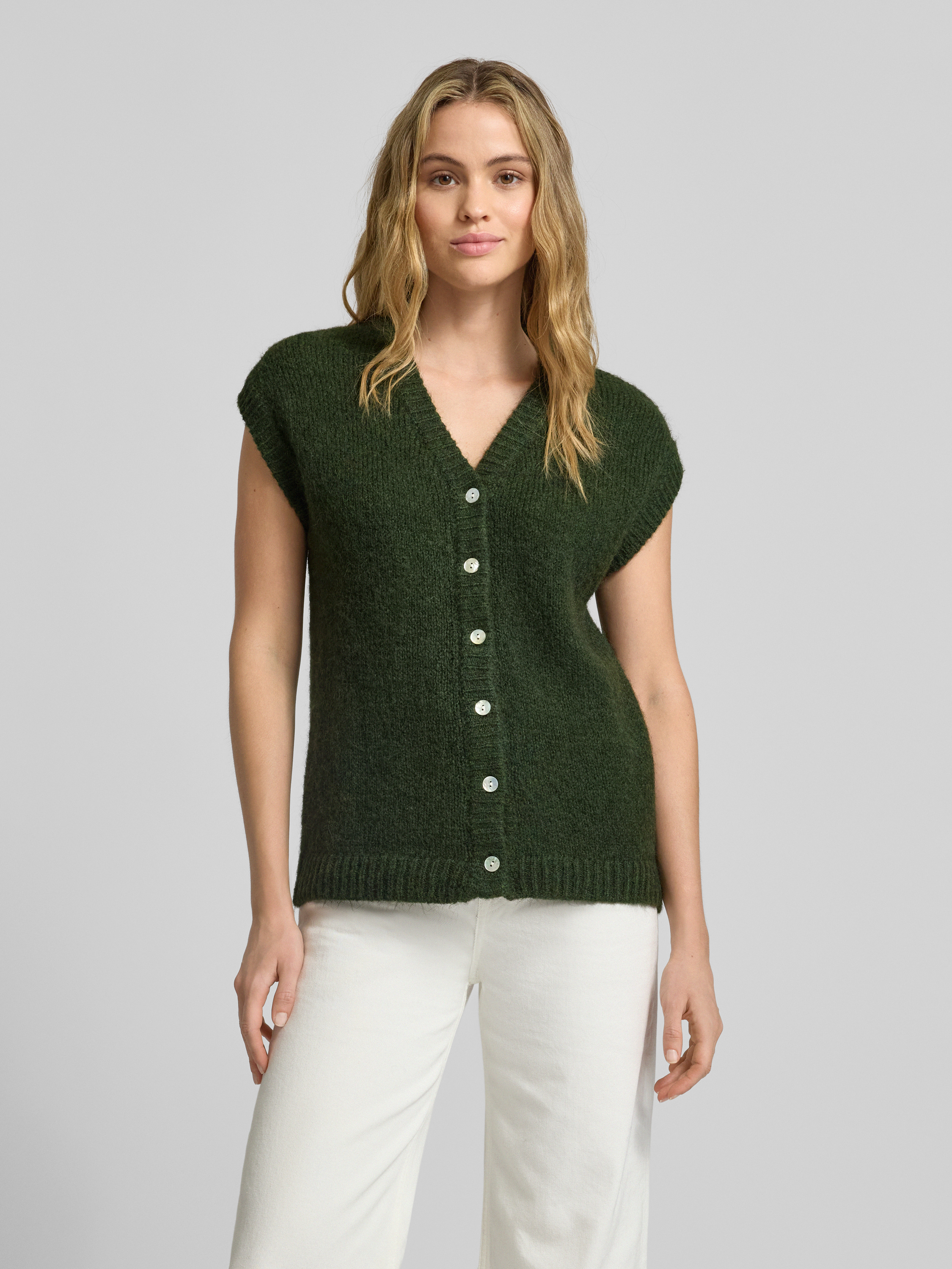 Die Damen Strickweste von ICHI, Modell 'BELABLUE', kombiniert einen klassischen V-Ausschnitt mit einem angenehm zu tragenden Regular Fit. Dank des Woll-Anteils fühlt sich das Material weich an und sorgt für ein angenehmes Tragegefühl. Durch die dezente Knopfleiste lässt sich das Modell vielseitig kombinieren.