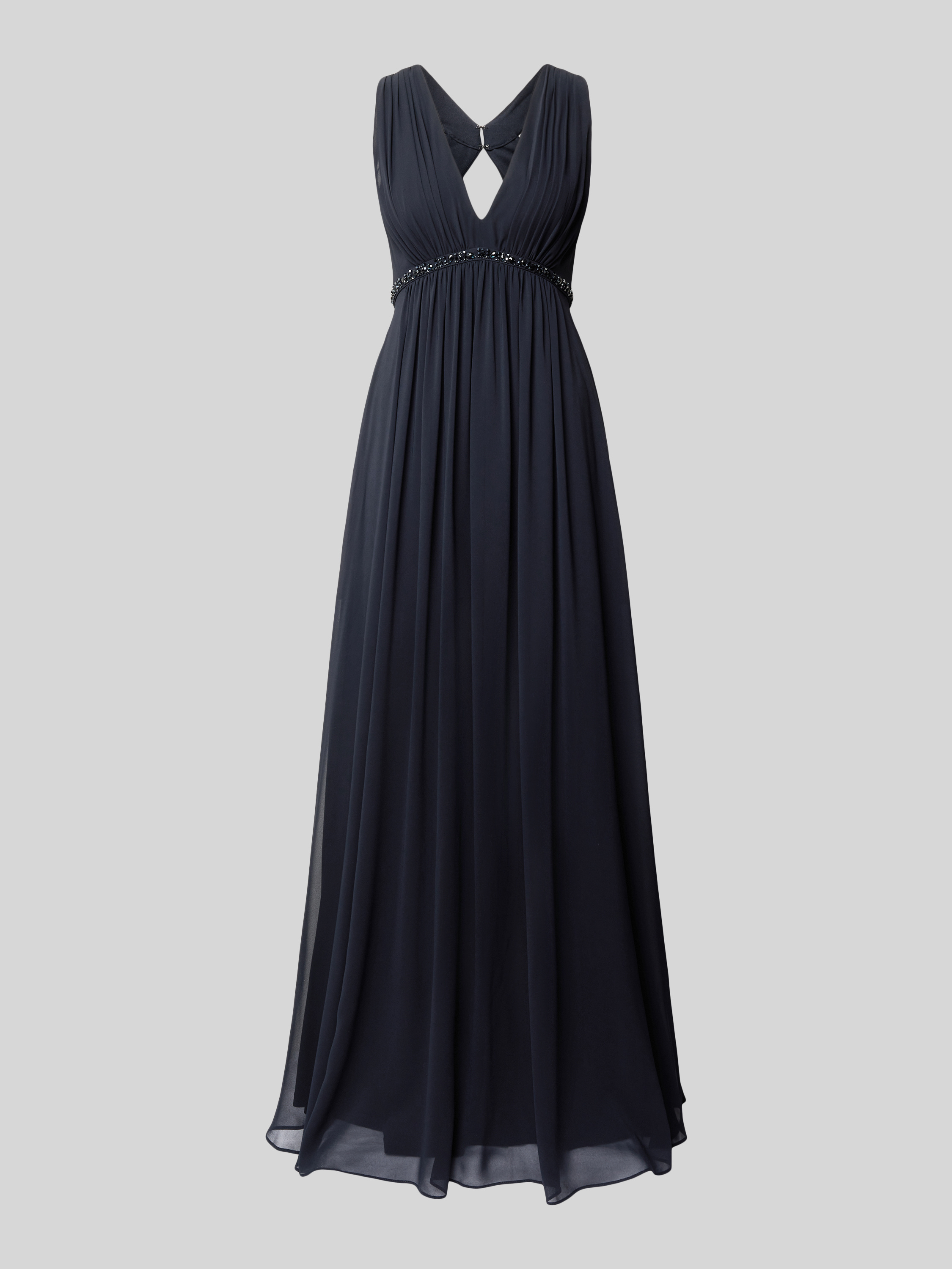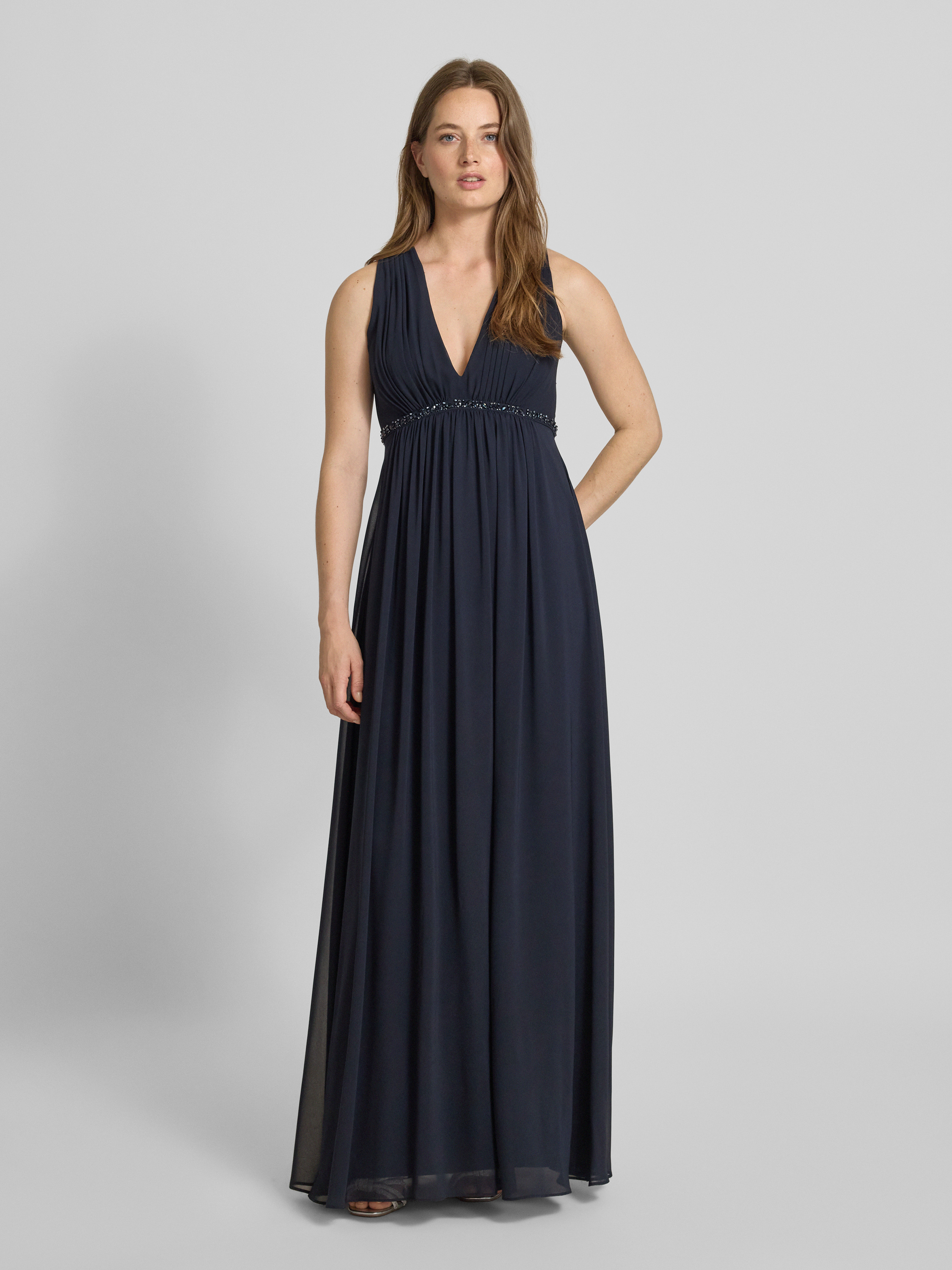 Das Abendkleid von Jake*s Cocktail in eleganter A-Linie bietet durch seinen raffinierten V-Ausschnitt und den funkelnden Ziersteinbesatz einen stilvollen Auftritt. Die sanften Raffungen verleihen dem Maxikleid eine fließende Silhouette, die sich für besondere Anlässe eignet.