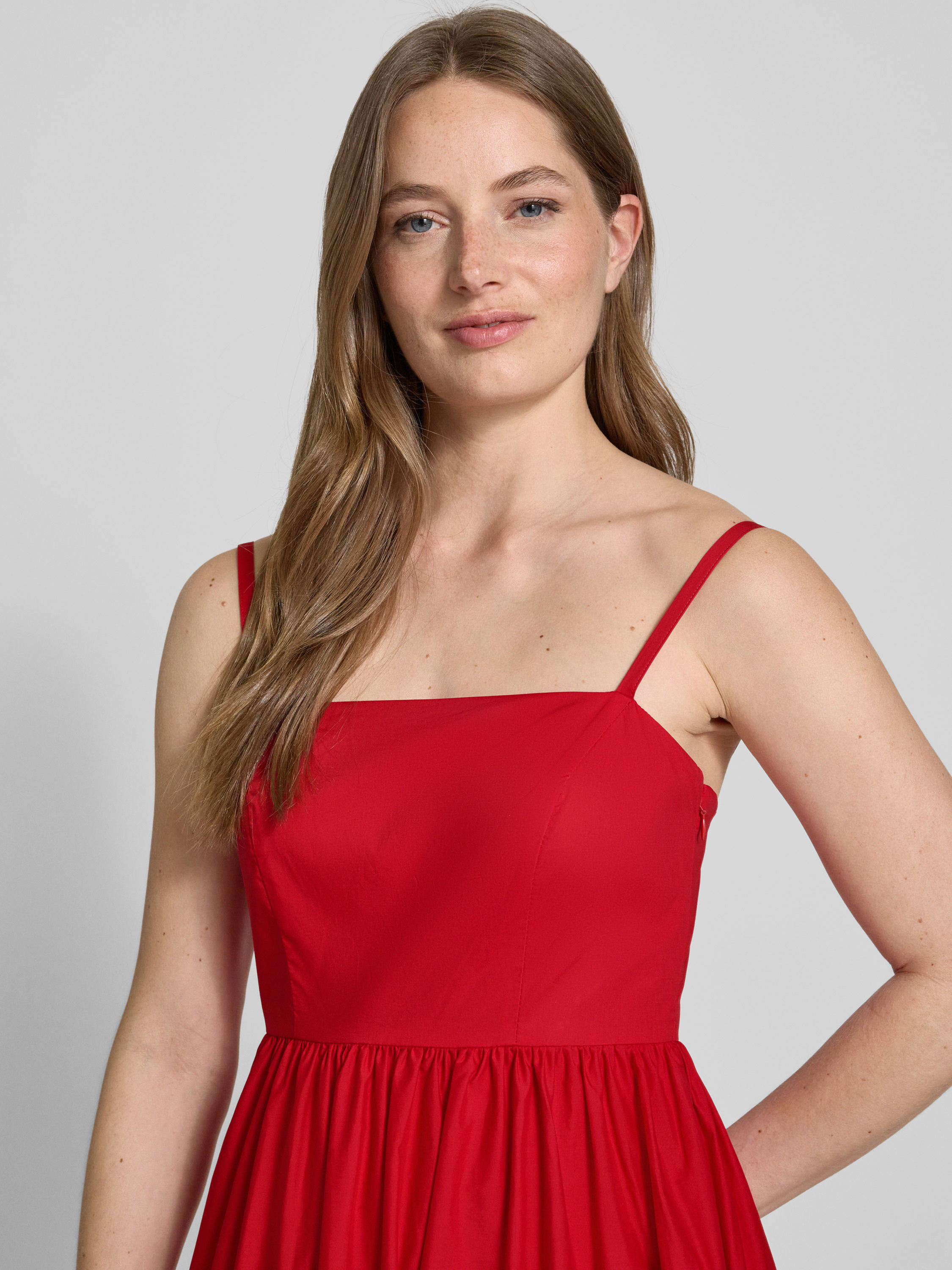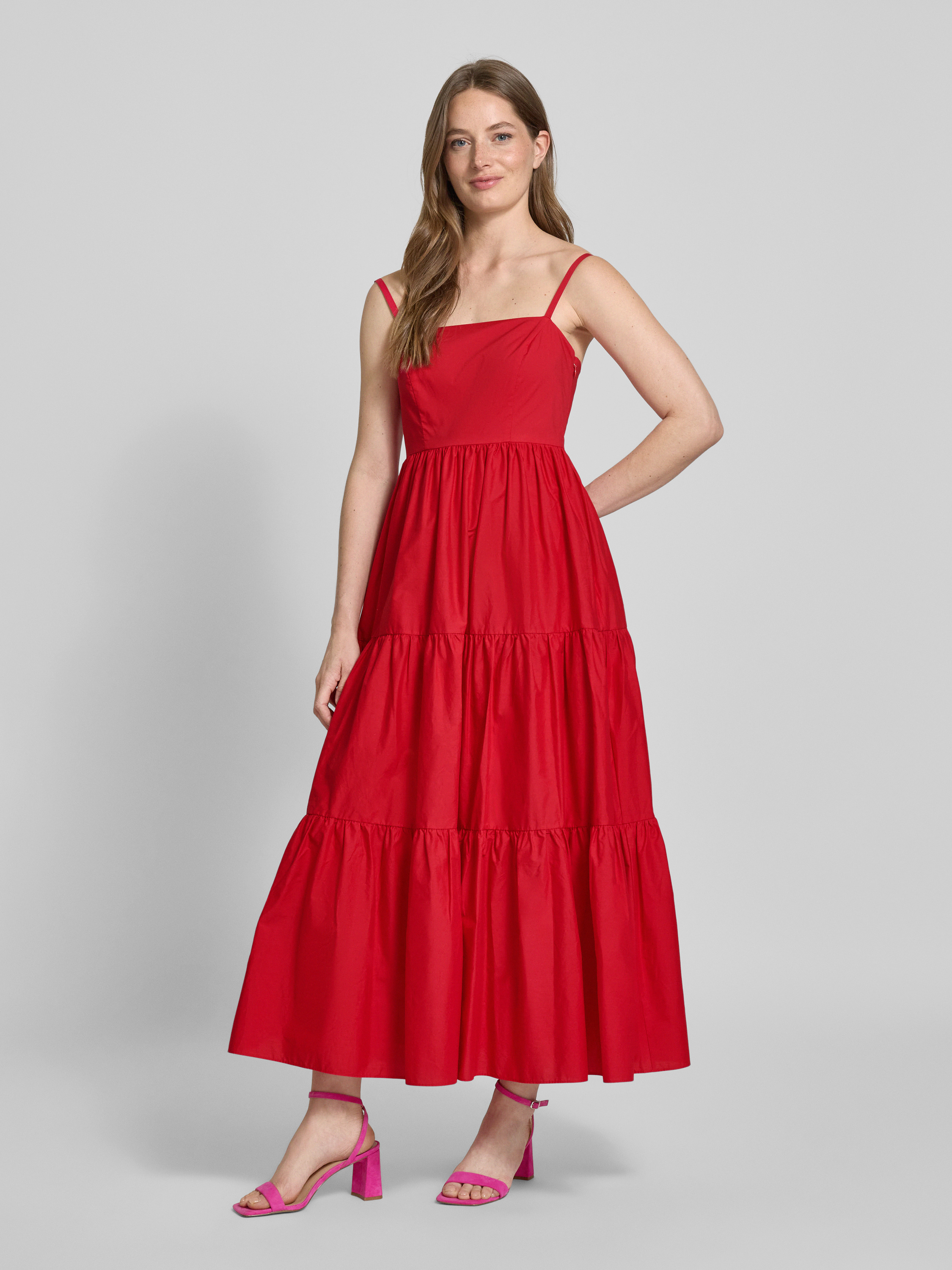 Das Damenkleid von Jake*s Cocktail fällt durch seine fließende A-Linie angenehm locker und sorgt mit dem Stufen-Look für eine verspielte Optik. Gefertigt aus reiner Baumwolle, fühlt es sich auf der Haut leicht an. Dank verstellbarer Träger passt sich das Midikleid flexibel an.