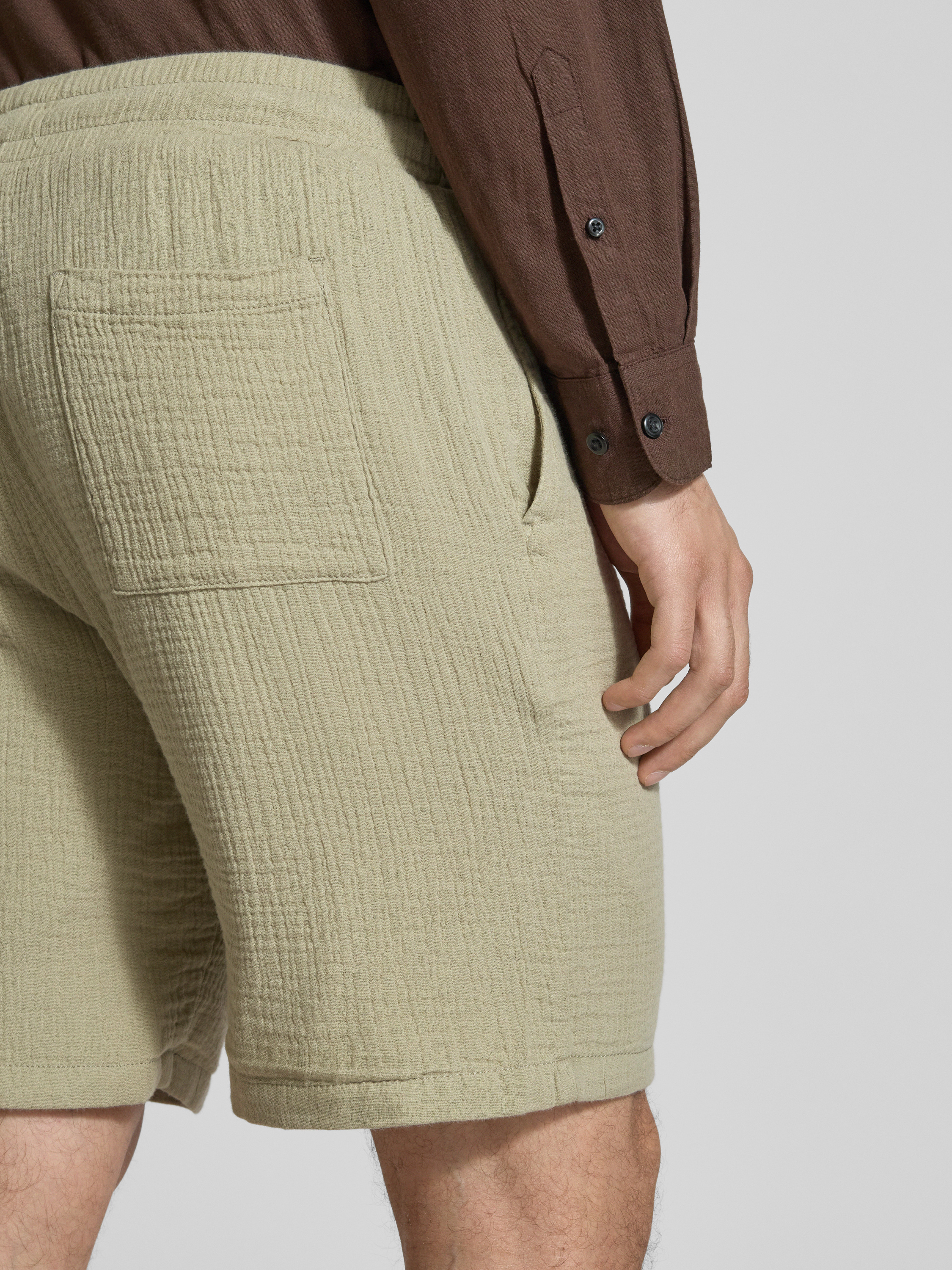 Die Regular Fit Shorts von JAKE*S STUDIO MEN aus reiner Baumwolle bieten dank ihrer lockeren Passform und dem elastischen Bund mit Tunnelzug optimalen Tragekomfort. Das strukturierte Muster verleiht den Shorts eine interessante Textur, die sowohl stilvoll als auch vielseitig kombinierbar ist. Ideal für entspannte Freizeitaktivitäten.