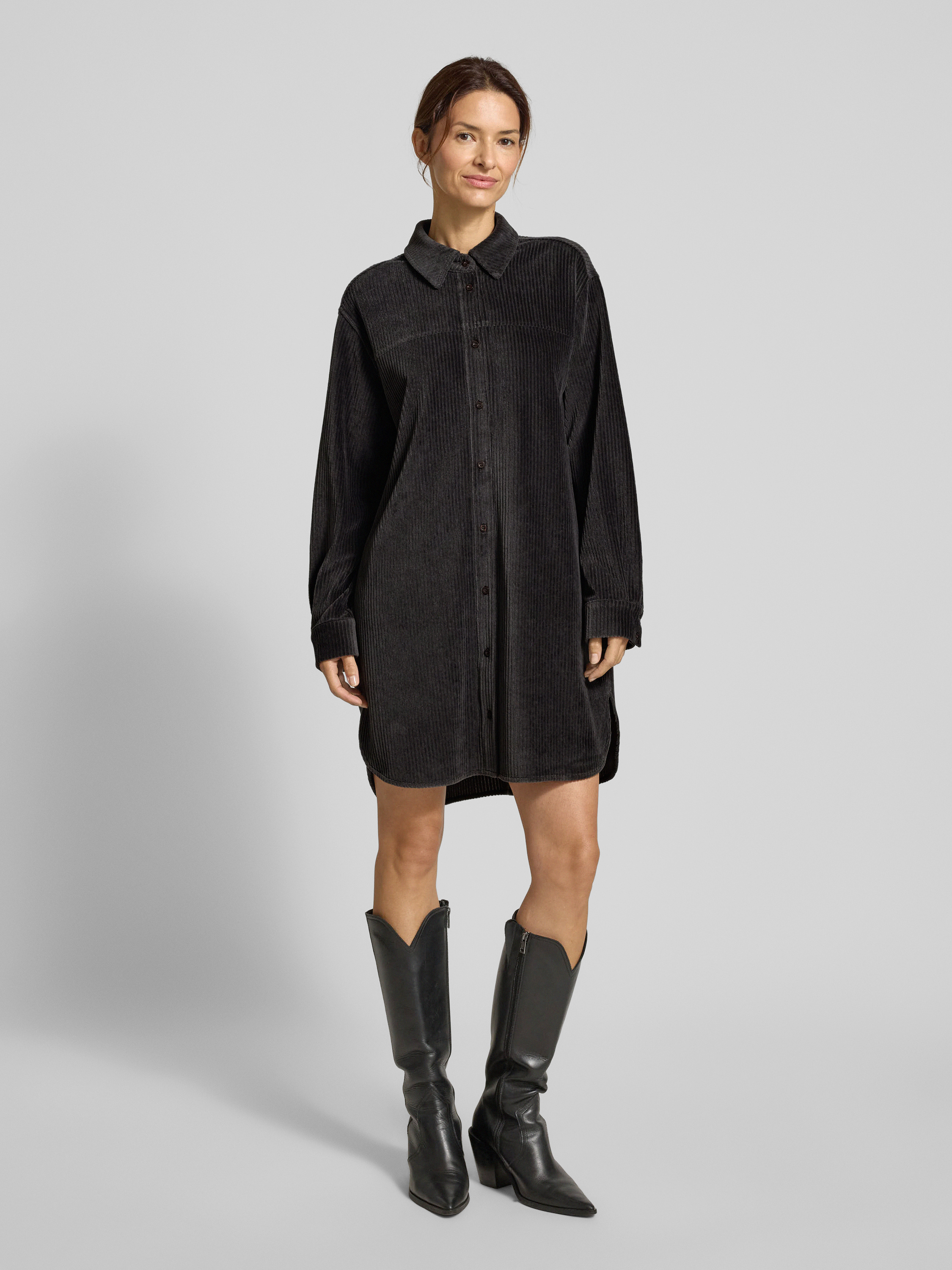 Das Damenkleid von JAKE*S STUDIO WOMAN zeigt sich in einer entspannten Passform und erinnert mit seinem Umlegekragen an klassische Hemdblusen. Der elastische Baumwoll-Mix sorgt für angenehmen Tragekomfort, während die Cord-Optik einen besonderen Akzent setzt. Durch das langärmelige Design entsteht ein vielseitiger Alltagsbegleiter.
