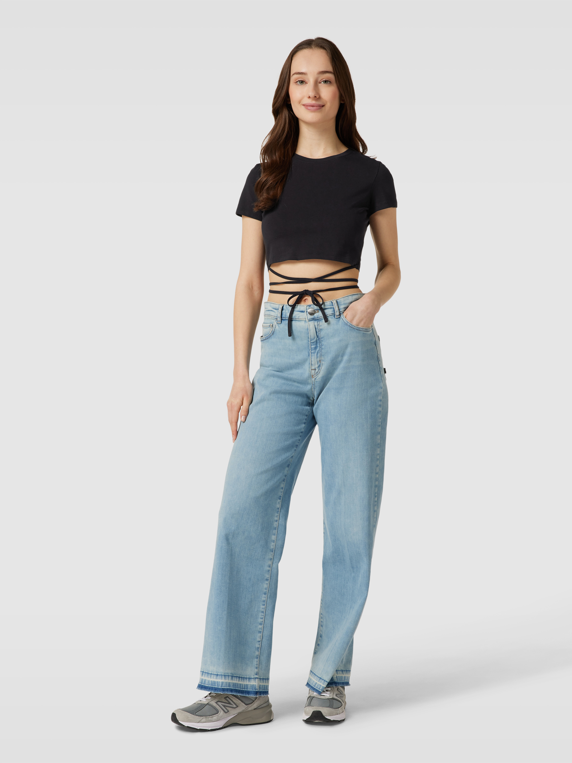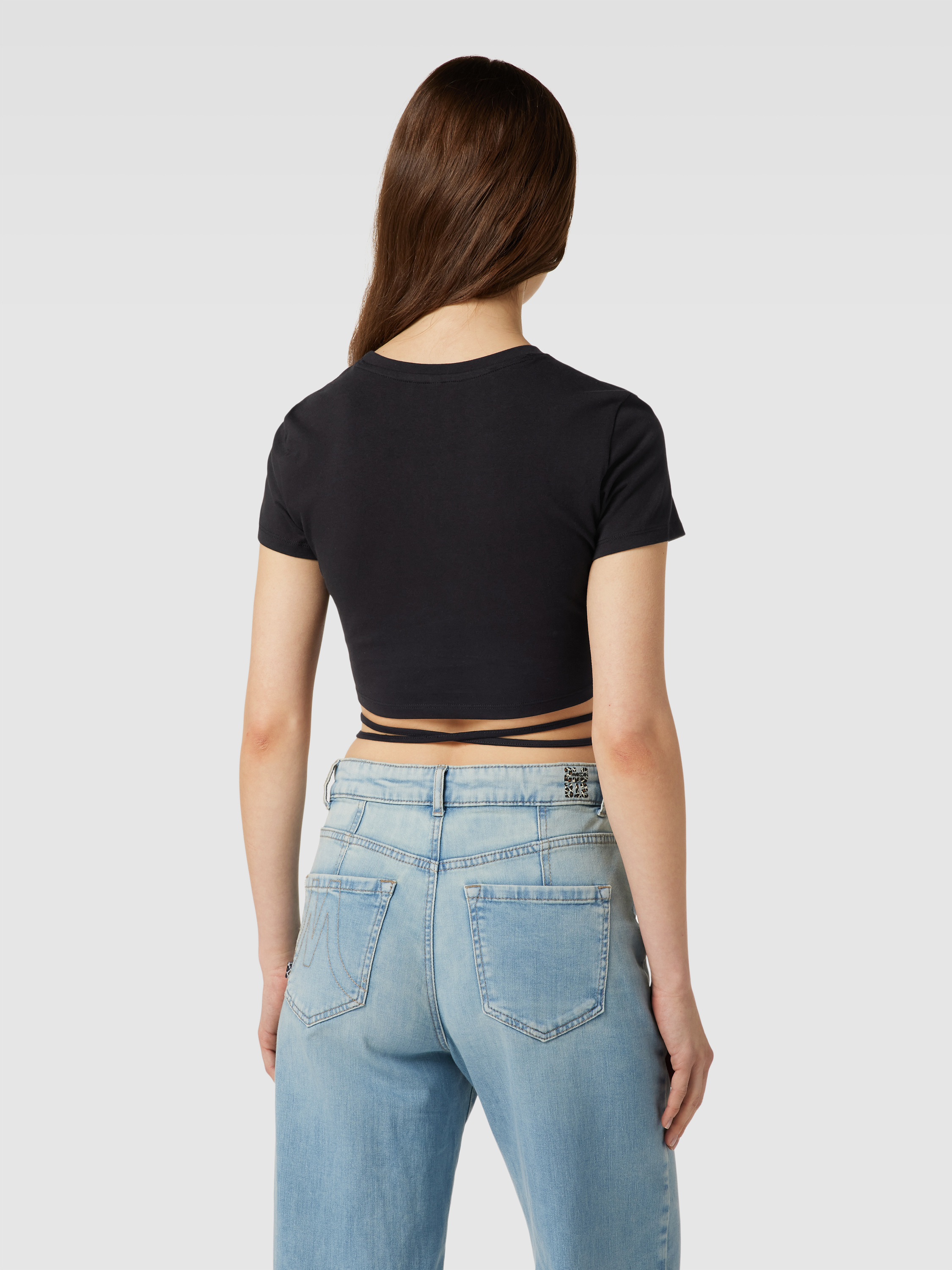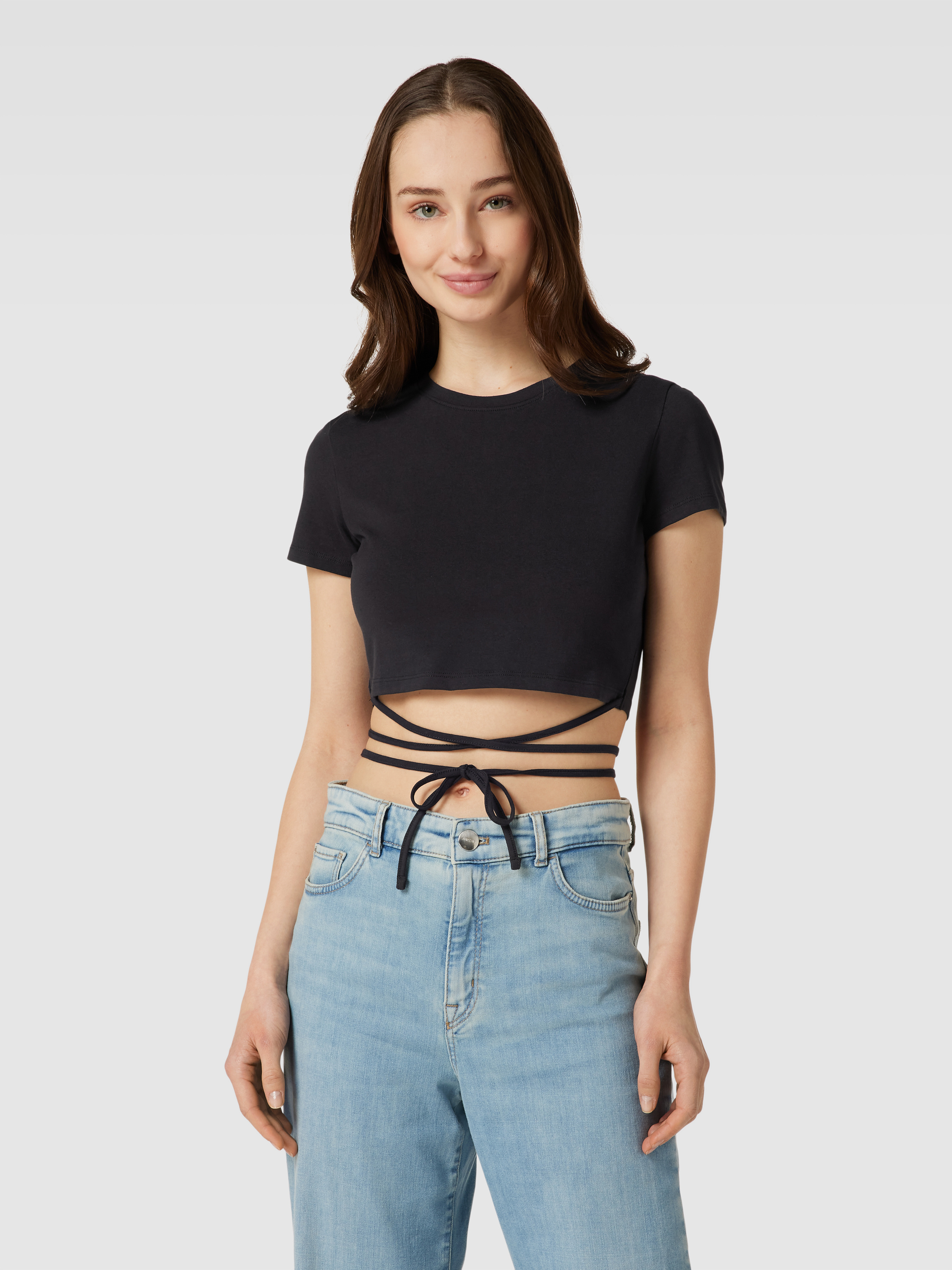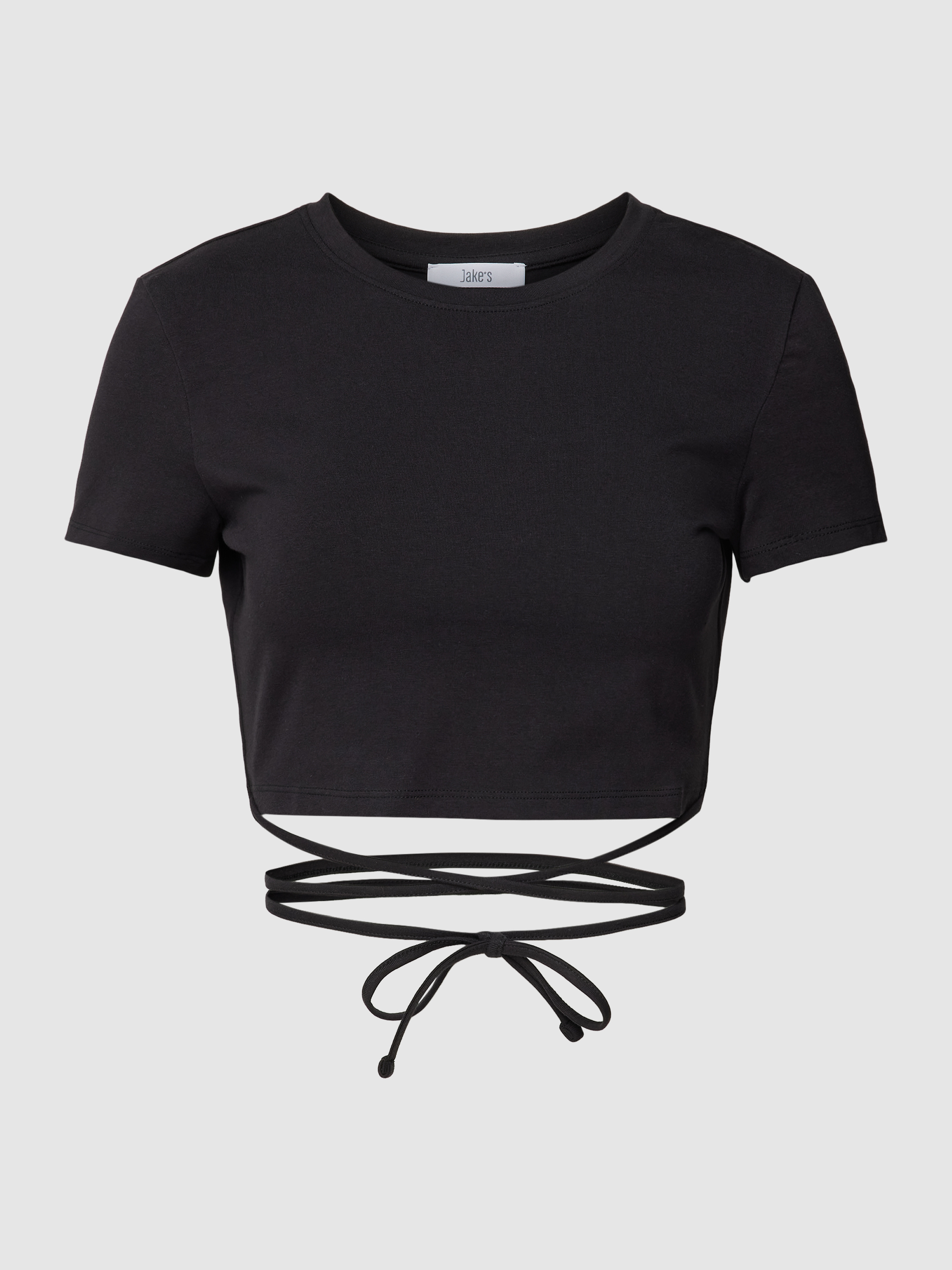 Das Cropped T-Shirt von Jake*s Casual kombiniert einen Baumwoll-Elasthan-Mix mit einem legeren Regular Fit, der für Bewegungsfreiheit sorgt. Das unifarbene Design wird durch ein charmantes Schleifen-Detail akzentuiert. Der gerippte Rundhalsausschnitt rundet das modische Gesamtbild harmonisch ab.