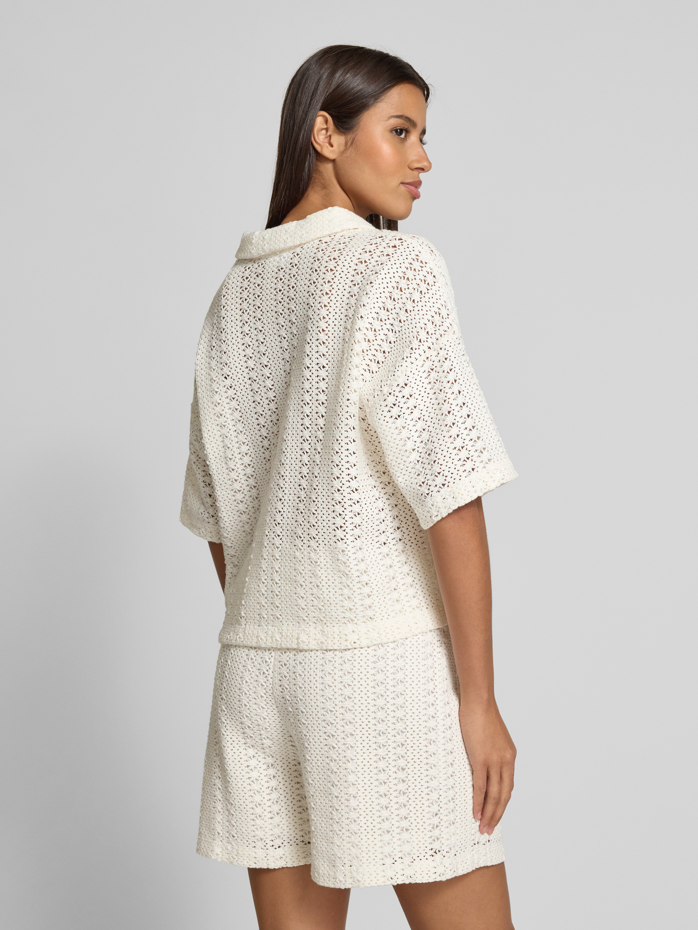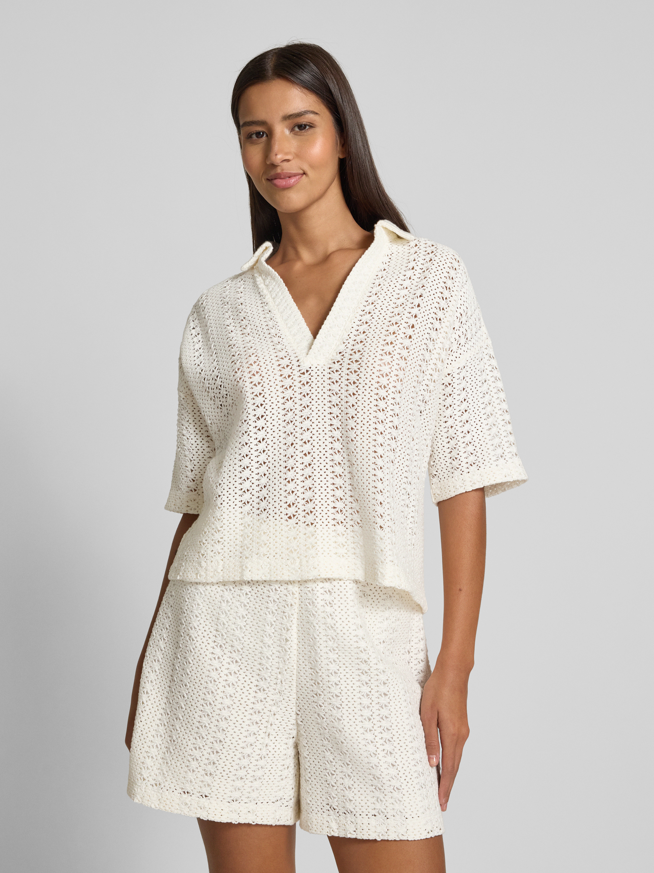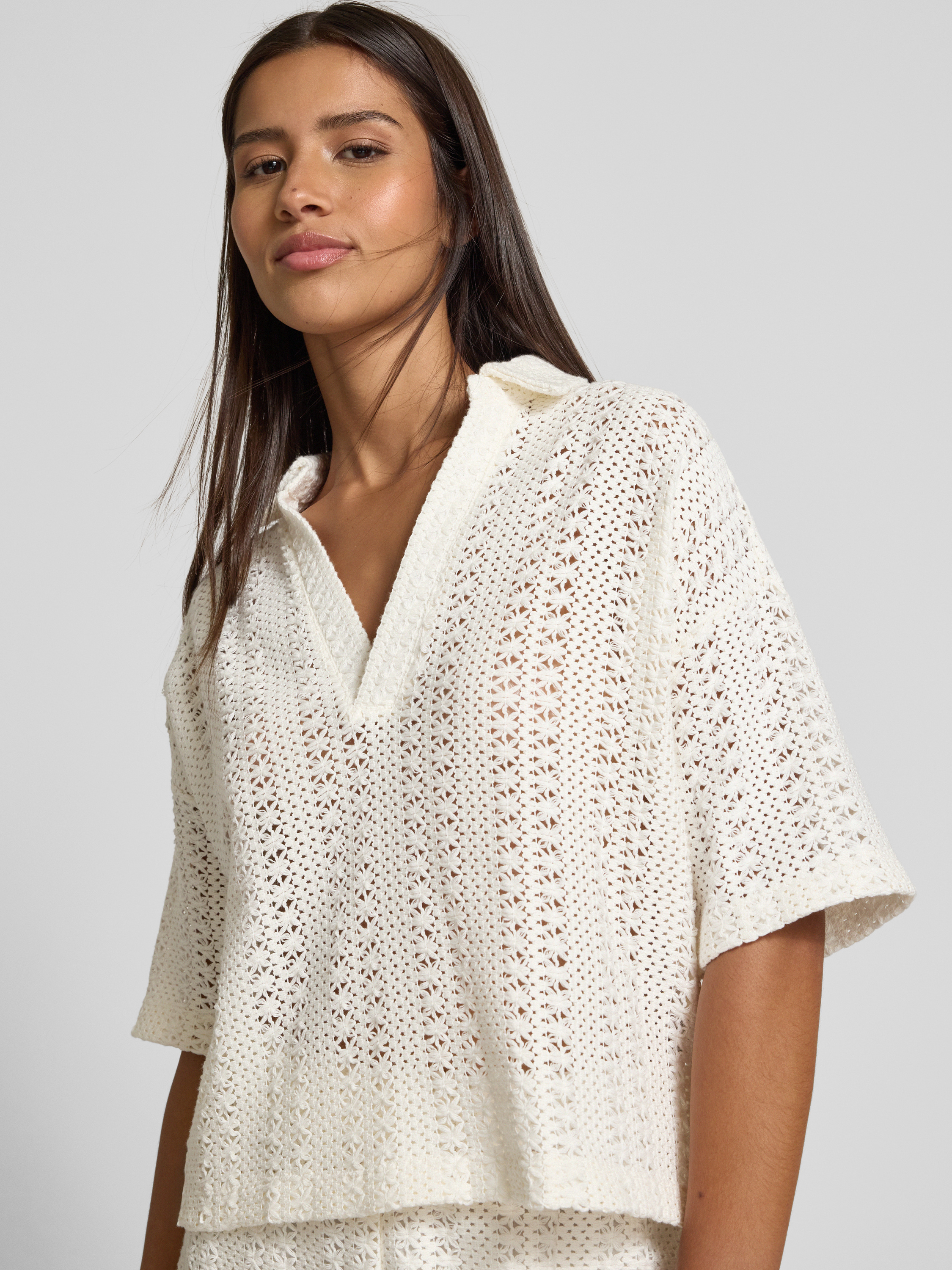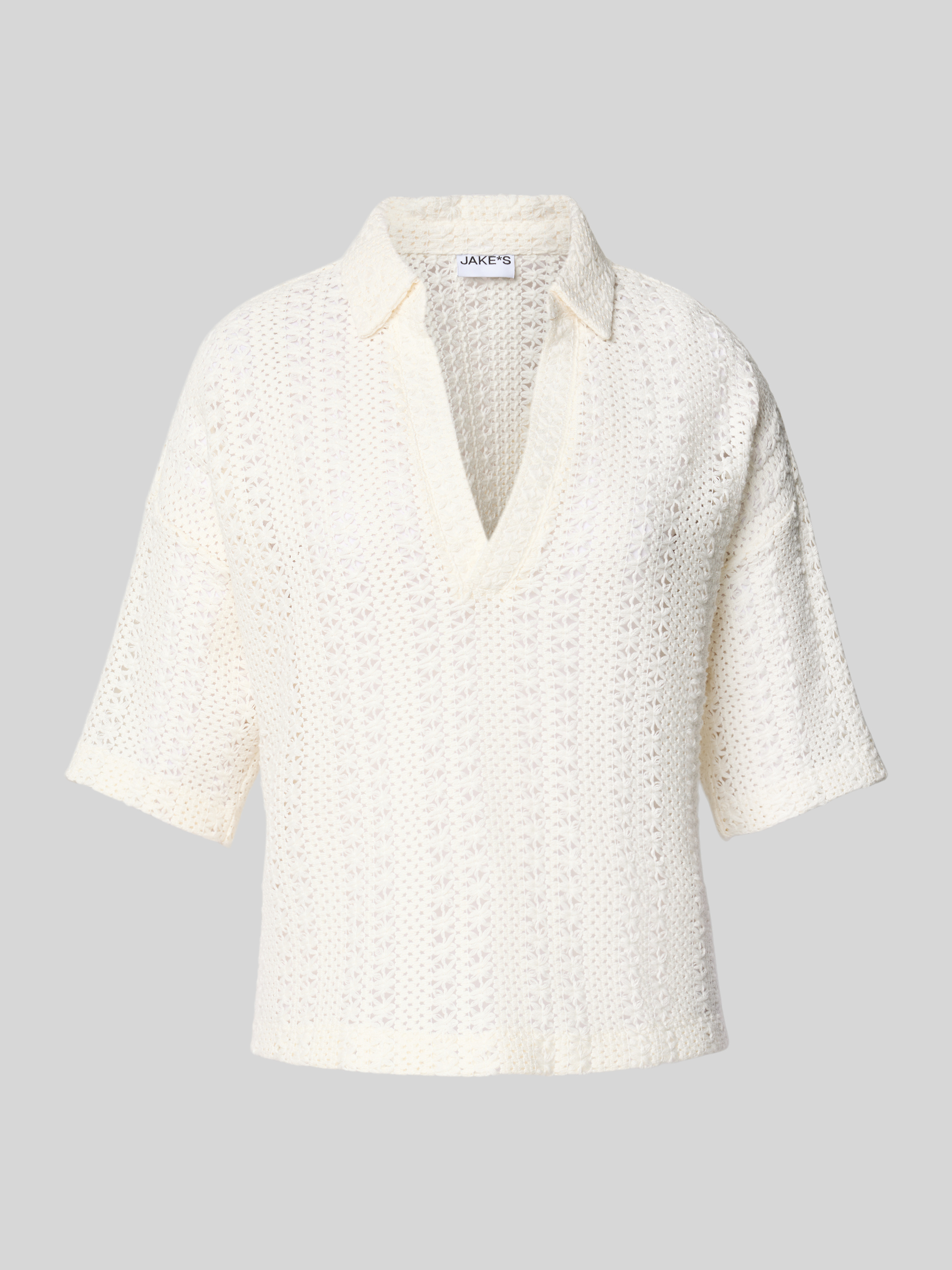 Das Damen T-Shirt von Jake*s Casual kombiniert einen lockeren Schnitt mit einem charmanten Polokragen und einem V-Ausschnitt. Der Baumwoll-Mix sorgt für ein angenehmes Tragegefühl, während die dezente Lochstickerei eine besondere Note verleiht. Die 3/4-Ärmel bieten vielseitige Stylingmöglichkeiten.