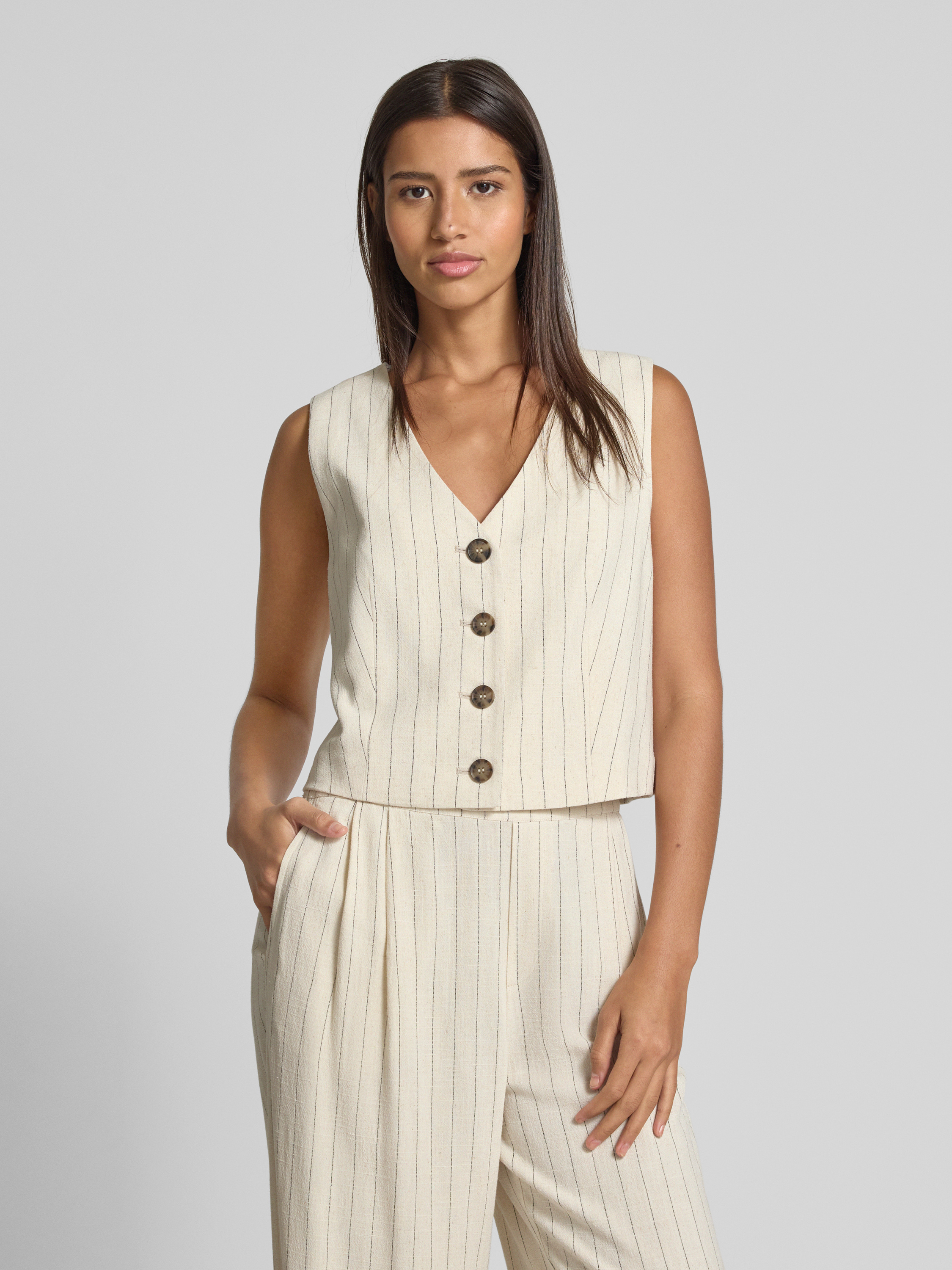 Die Weste von Jake*s Casual kombiniert einen Viskose-Mix mit einem Hauch von Leinen, was für ein angenehmes Tragegefühl sorgt. Ihr gerader Schnitt und der V-Ausschnitt verleihen ein zeitloses Design. Diese Kombination eignet sich ideal für lässige und stilvolle Outfits.