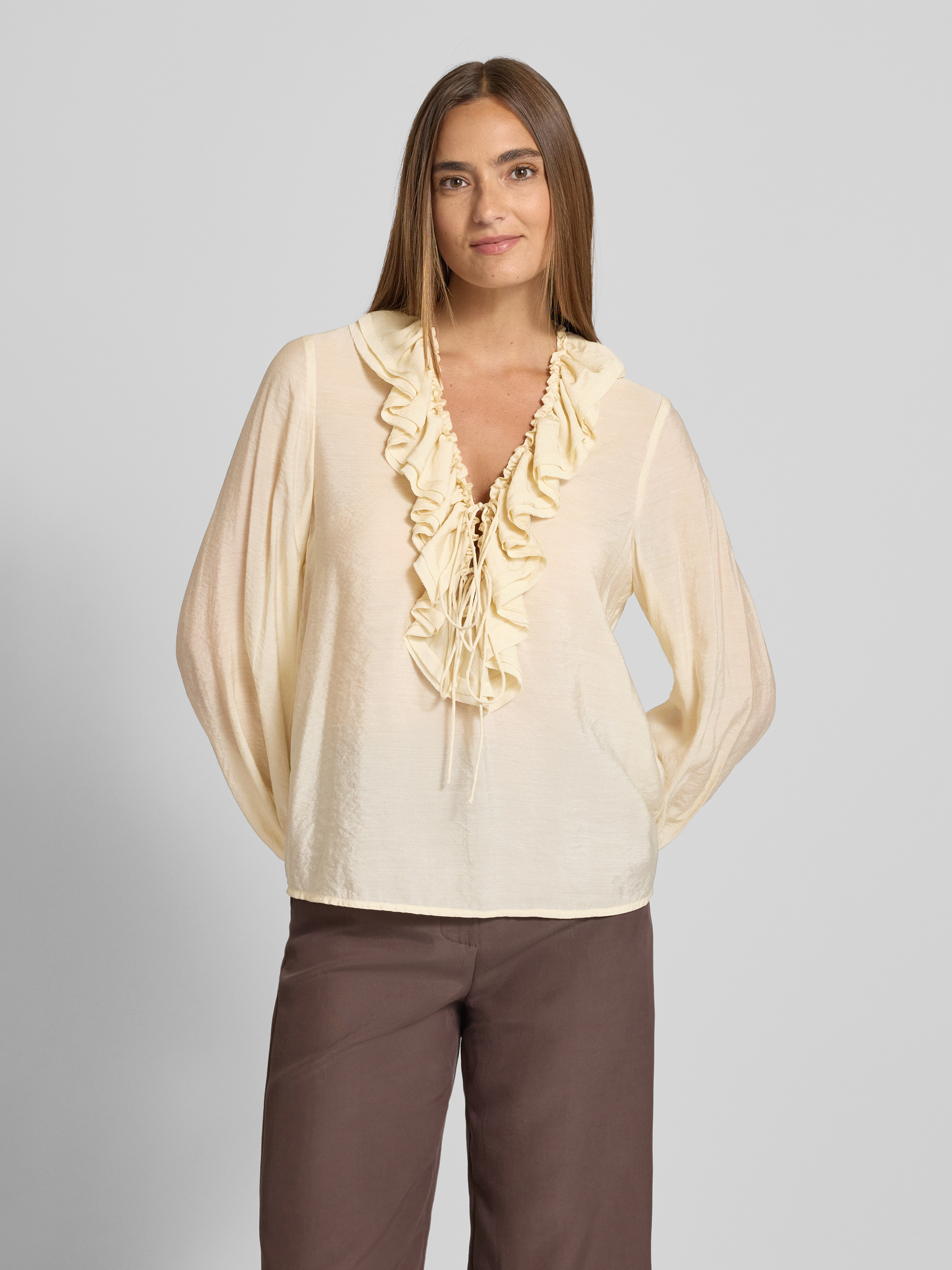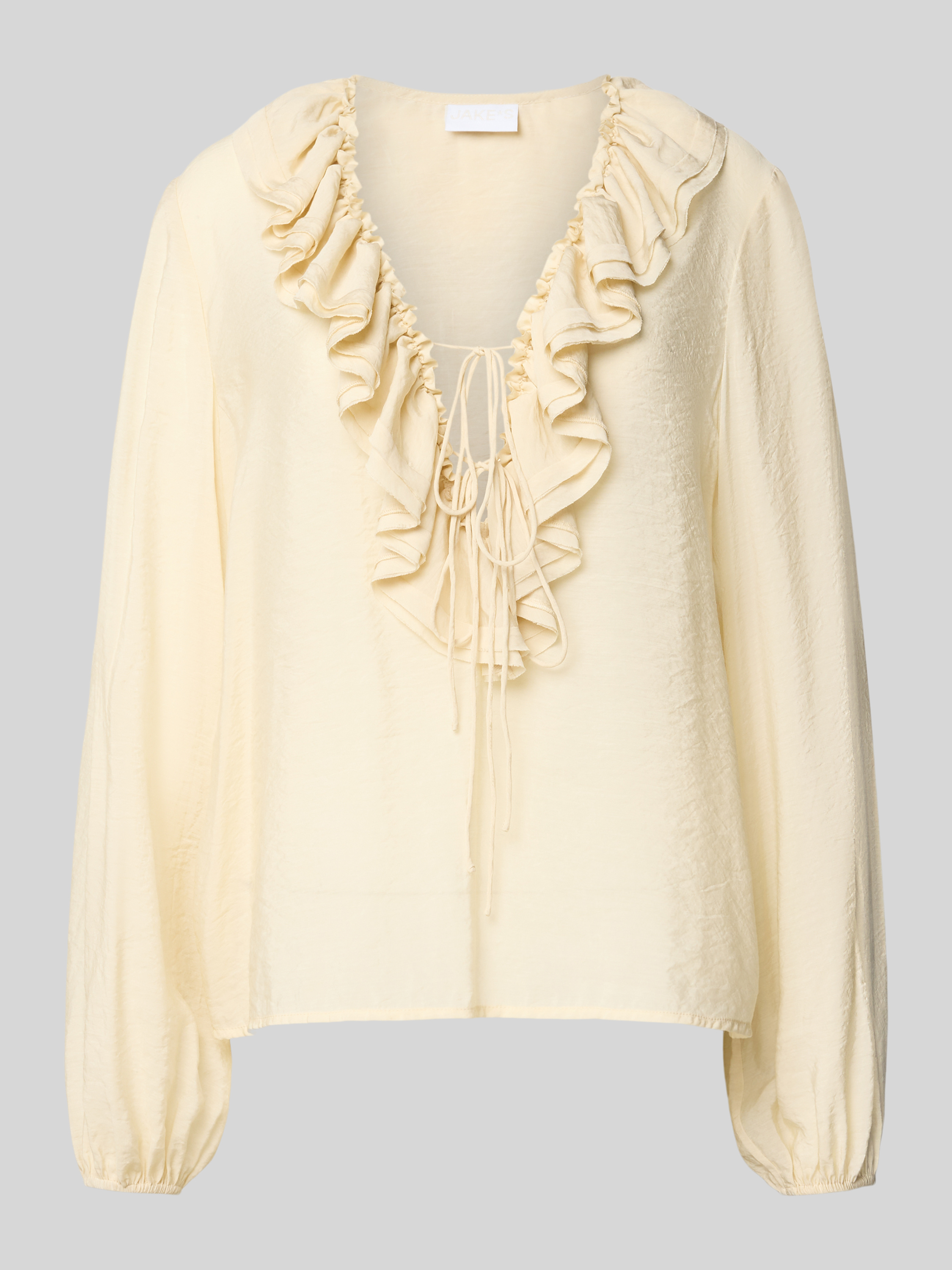 Die Damenbluse von Jake*s Collection fällt durch ihren lockeren Schnitt angenehm leicht und lässt sich vielseitig kombinieren. Dank des V-Ausschnitts und dem feinen Schleifen-Detail entsteht ein entspanntes Gesamtbild, das Bewegung zulässt. Volants setzen dezente Akzente und unterstreichen die luftige Ausstrahlung.