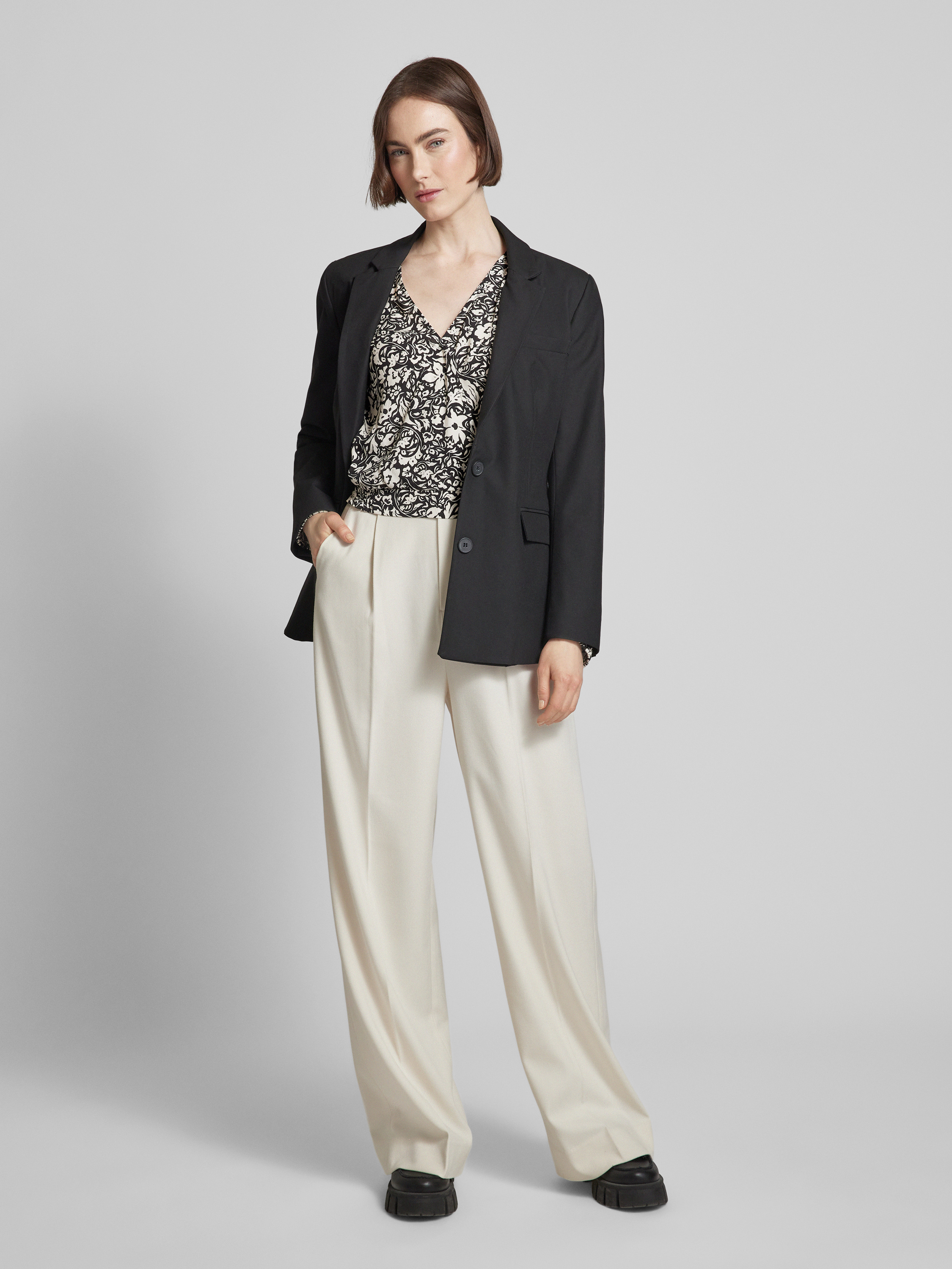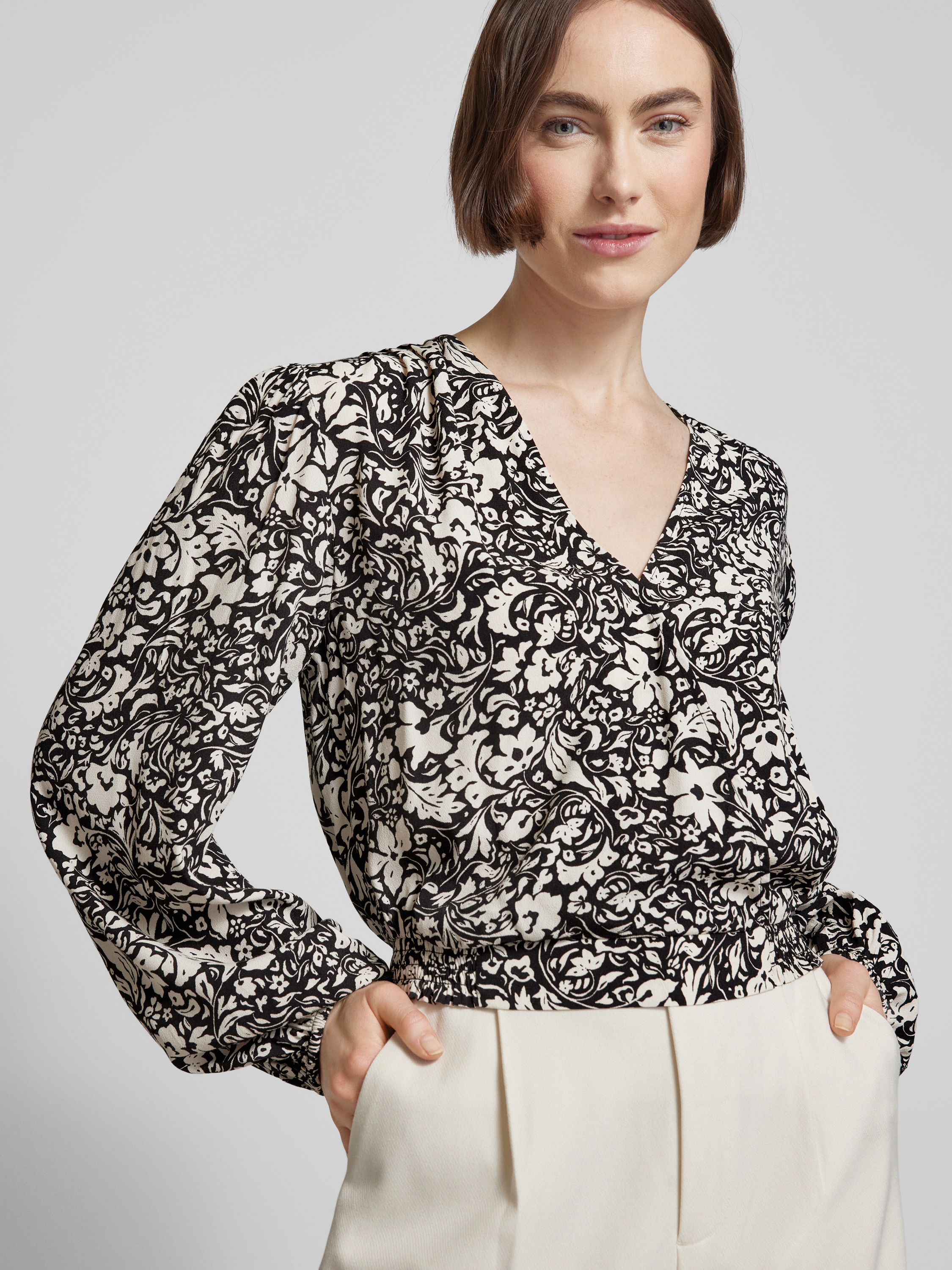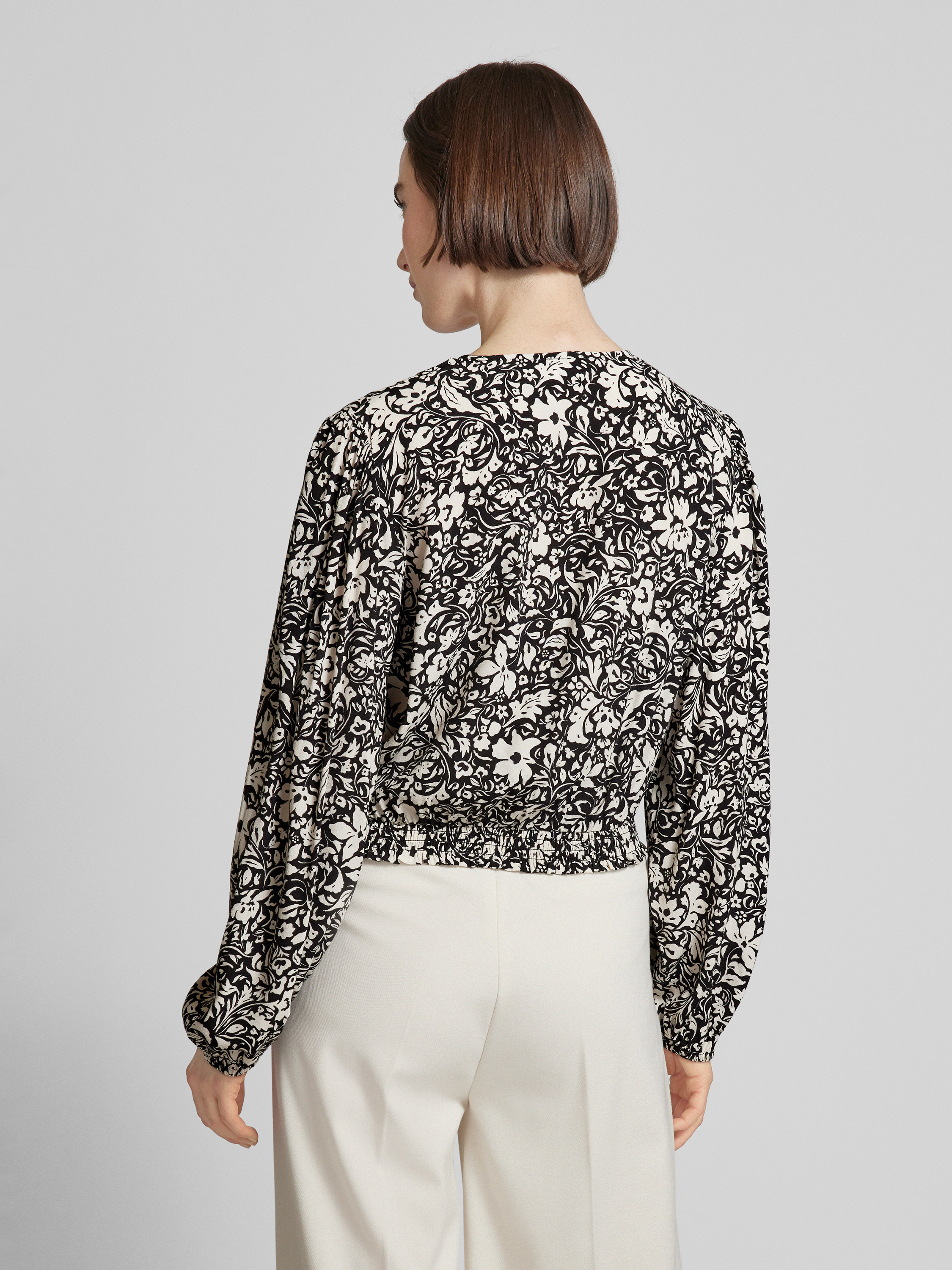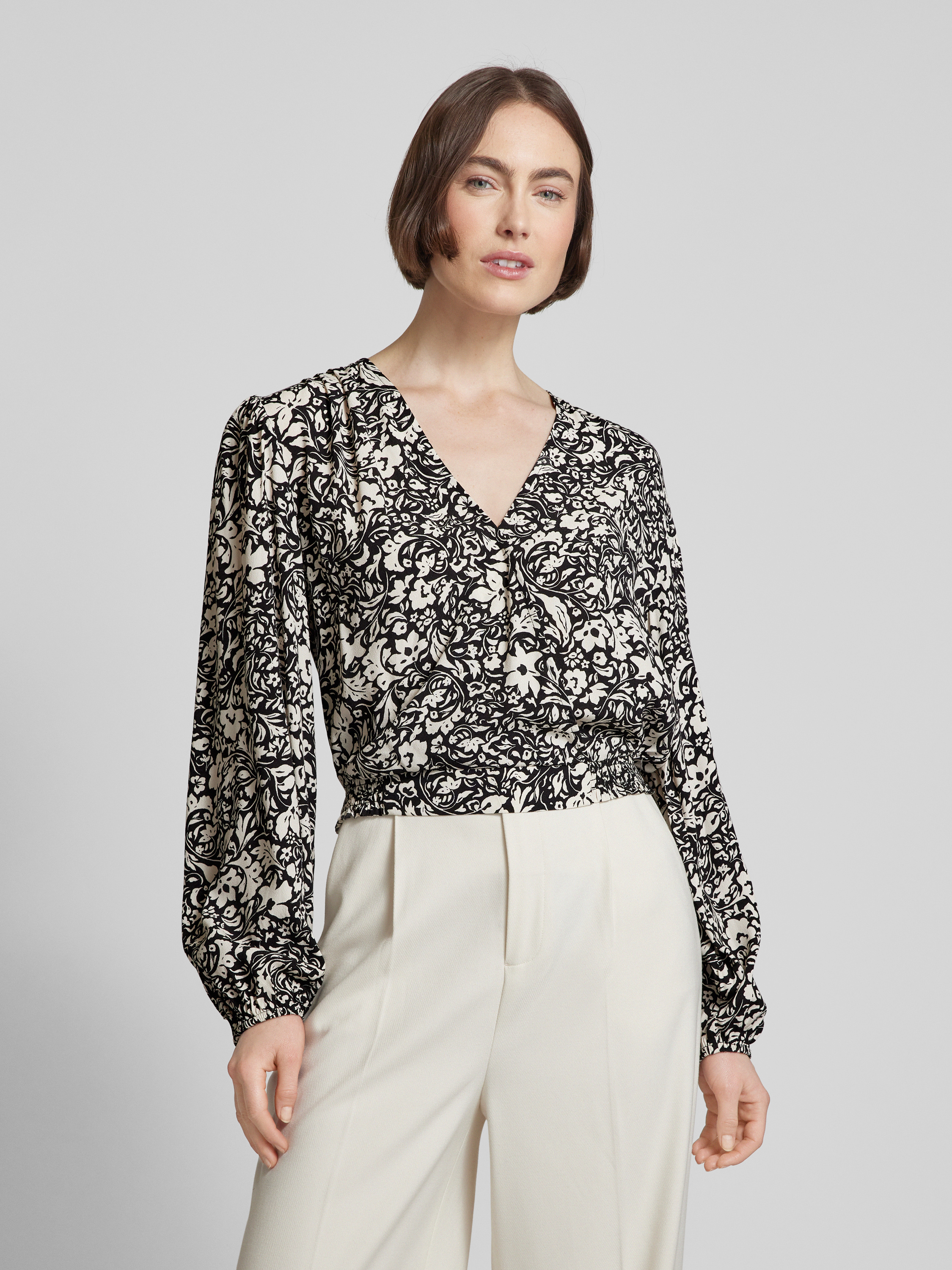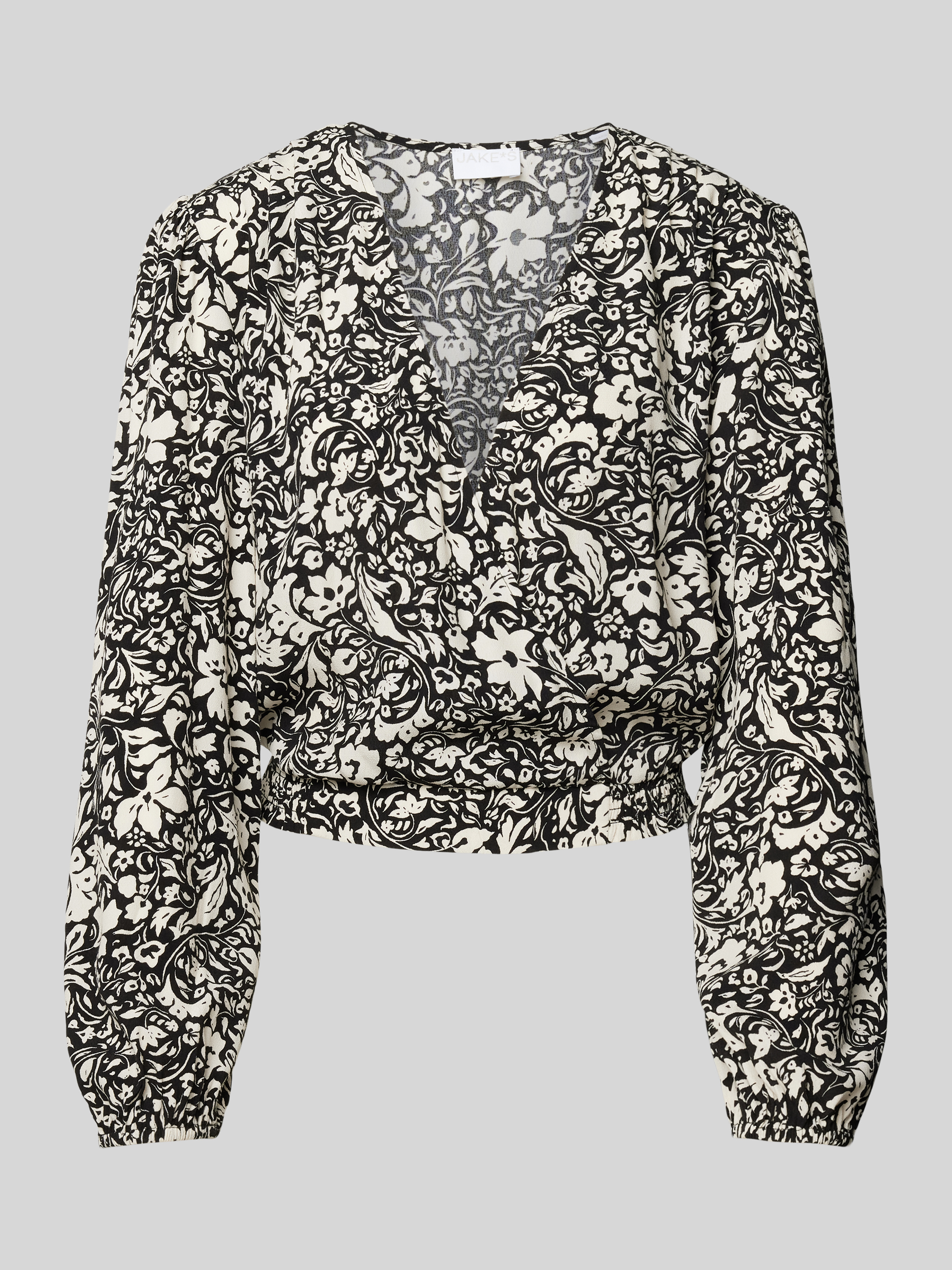 Die Cropped Bluse von Jake*s Collection vereint florale Eleganz mit einer modernen Wickel-Optik. Hergestellt aus reiner Viskose, bietet sie eine leichte und luftige Passform. Der V-Ausschnitt und der elastische Bund sorgen für eine angenehme Silhouette und vielseitige Kombinationsmöglichkeiten.