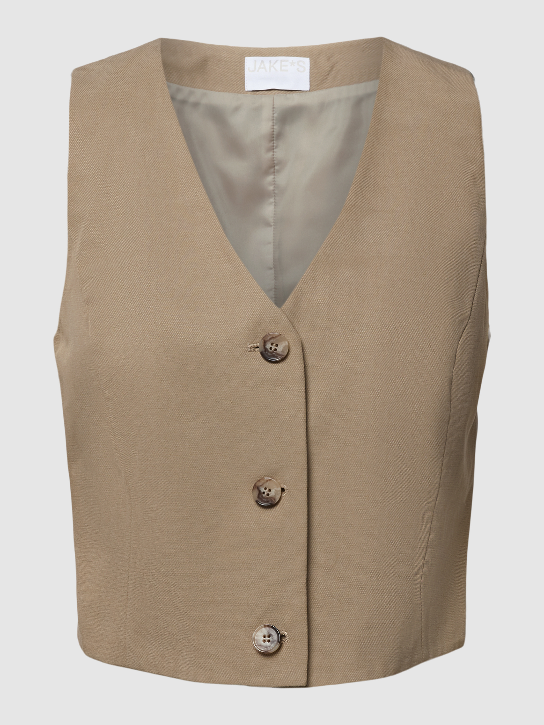Die Damen Weste von Jake*s Collection kombiniert einen angenehm leichten Baumwoll-Leinen-Mix mit einem Hauch von Viskose, der für ein luftiges Tragegefühl sorgt. Der Regular Fit und der klassische V-Ausschnitt machen sie vielseitig einsetzbar. Ideal für lässige bis elegante Anlässe.