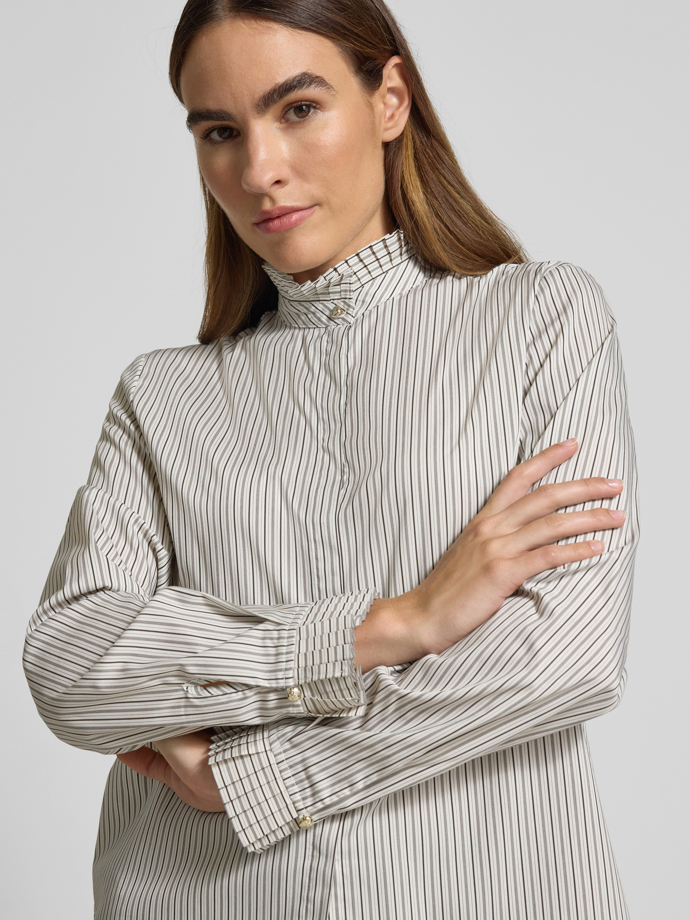 Die Damen Hemdbluse von JOOP! Modell 'Blaer' fällt durch ihren lockeren Schnitt angenehm leicht und lässt Bewegungsfreiheit zu, während der Viskose-Mix mit Stretch-Anteil für ein komfortables Tragegefühl sorgt. Ein Stehkragen verleiht dem Design eine moderne Note. Durch die verdeckte Knopfleiste entsteht ein ruhiges Gesamtbild, das vielseitig kombinierbar bleibt.