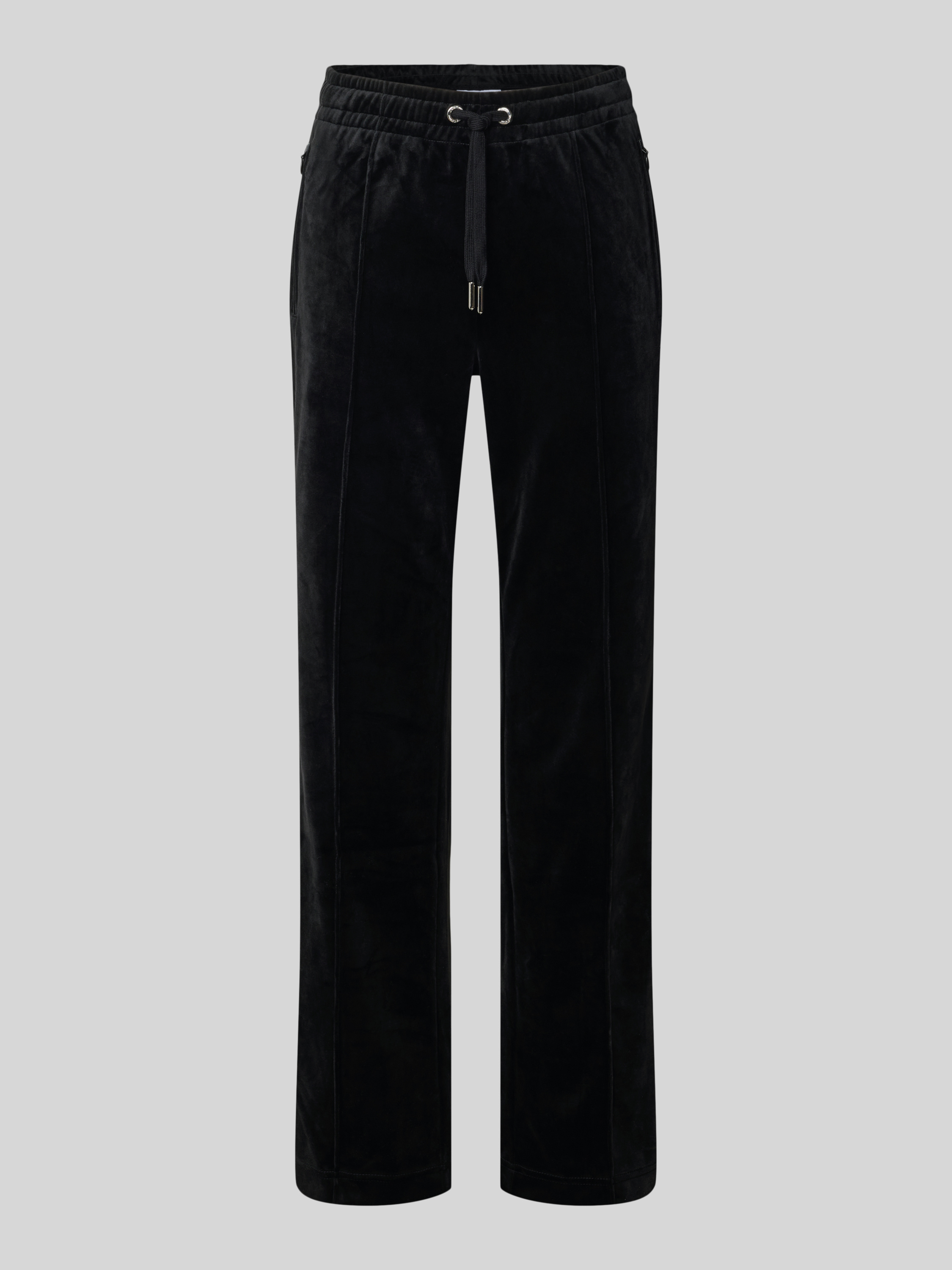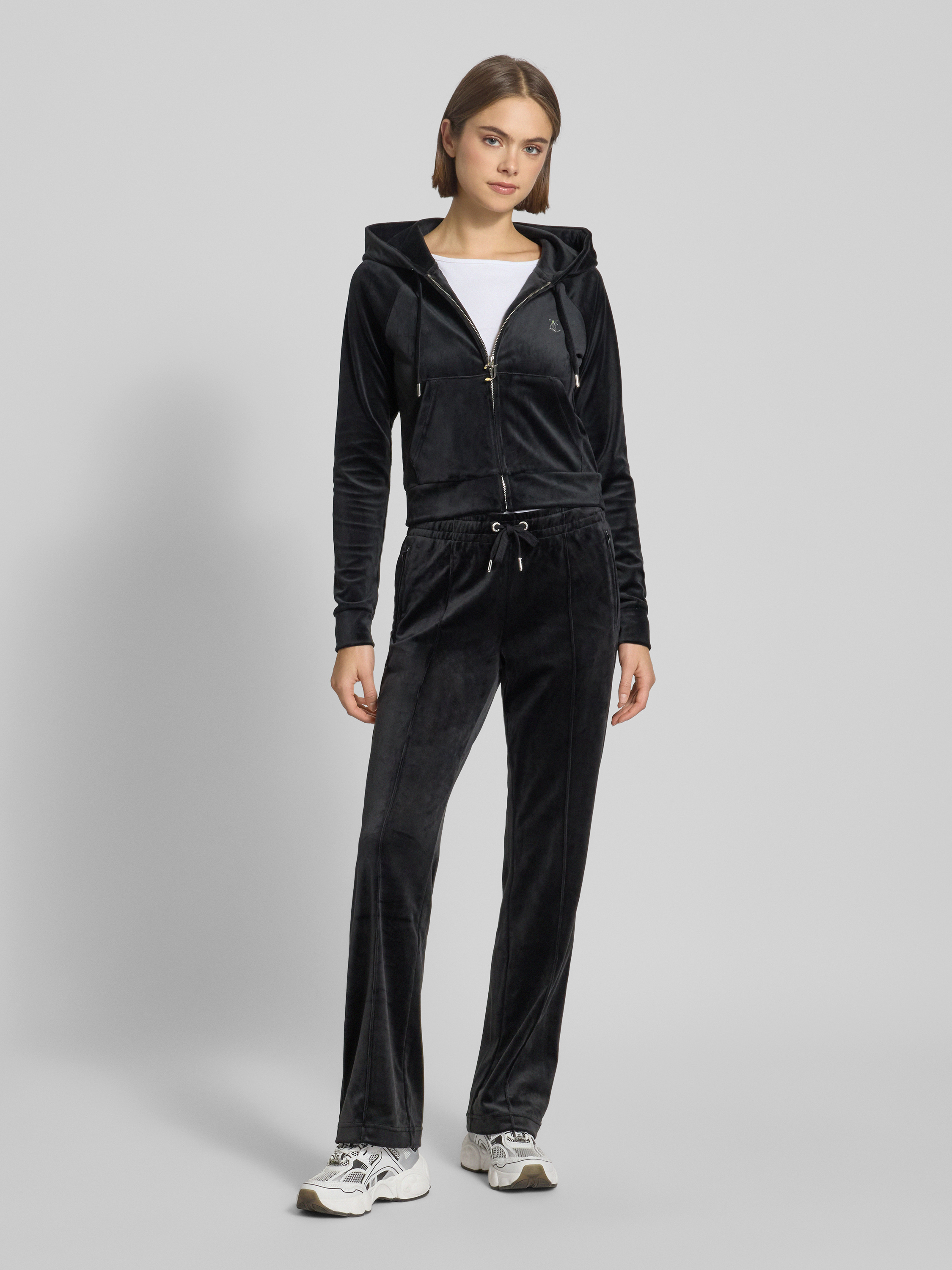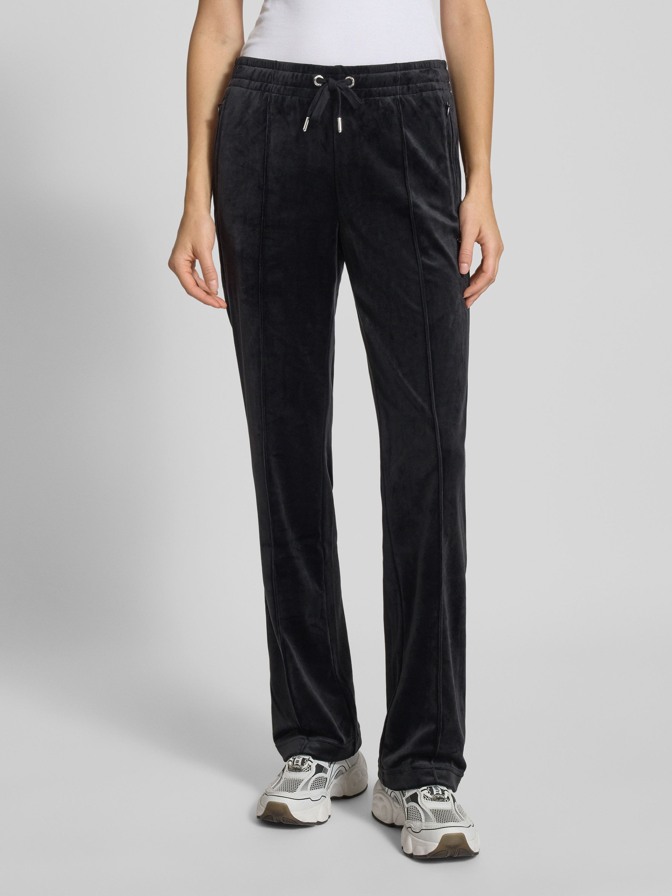 Die Damen Track Pants von Juicy Couture im Modell 'TINA' punkten mit einem Material-Mix samt Stretch-Anteil, wodurch Bewegungsfreiheit im Alltag ermöglicht wird. Durch den geraden Schnitt und den elastischen Bund mit Kordelzug passt sich die Hose angenehm an verschiedene Bedürfnisse an. Reißverschlusstaschen bieten Platz für Kleinigkeiten, sodass unterwegs alles griffbereit bleibt.