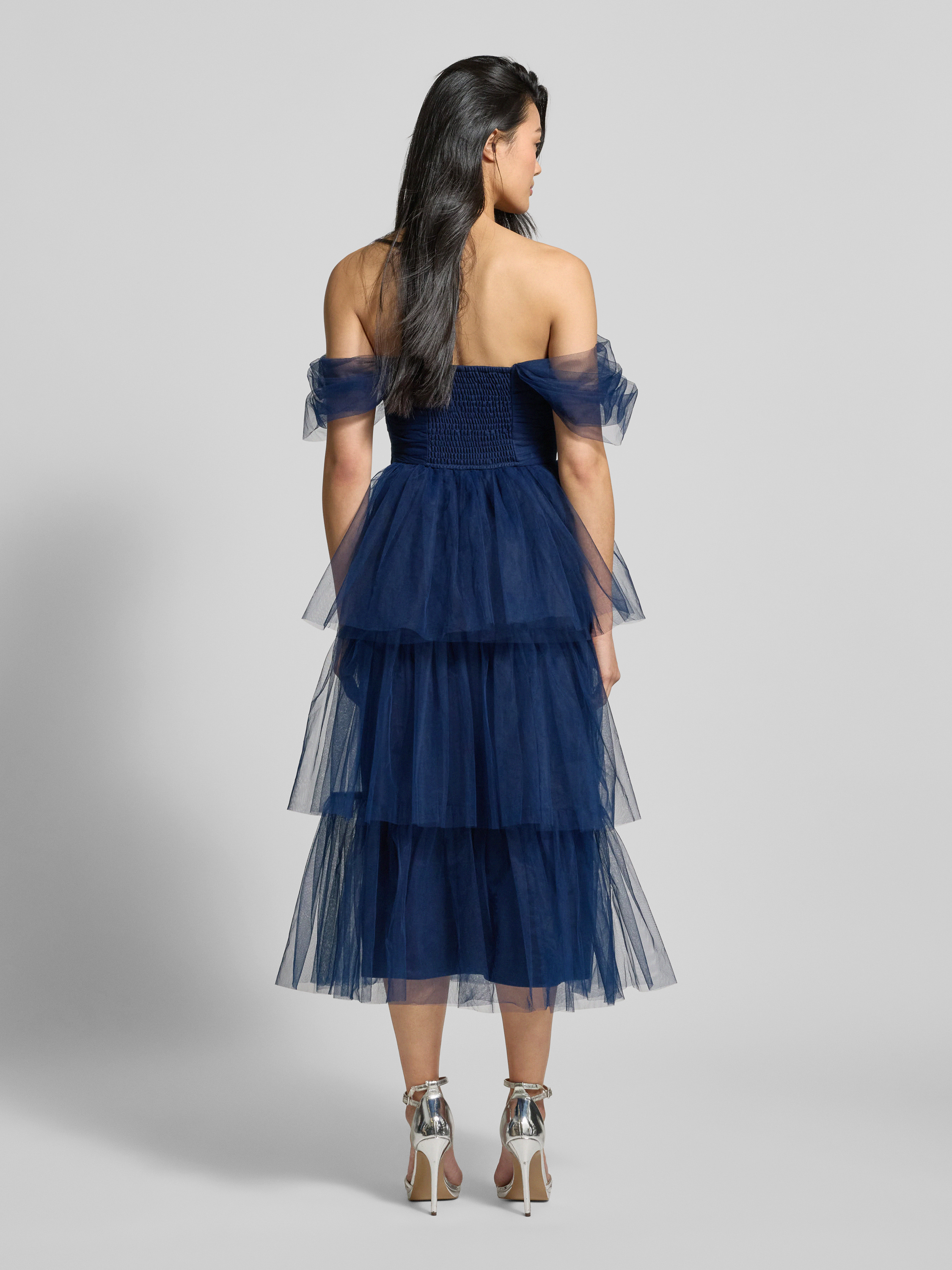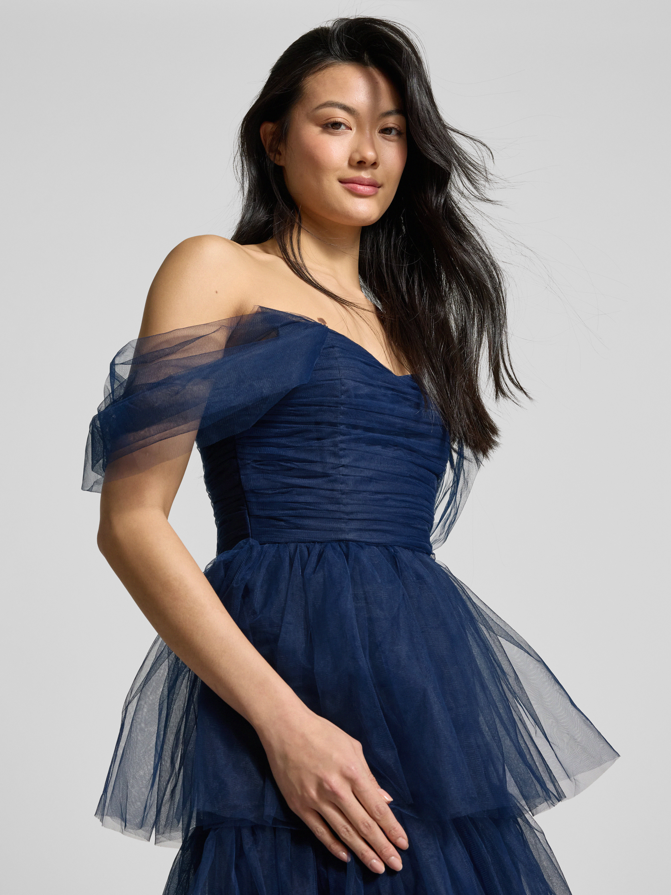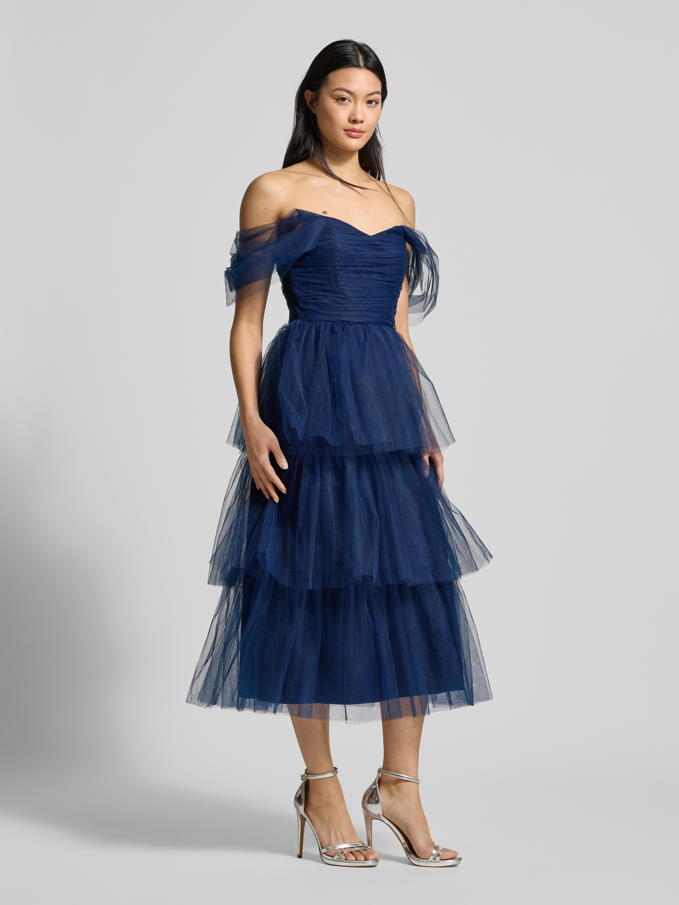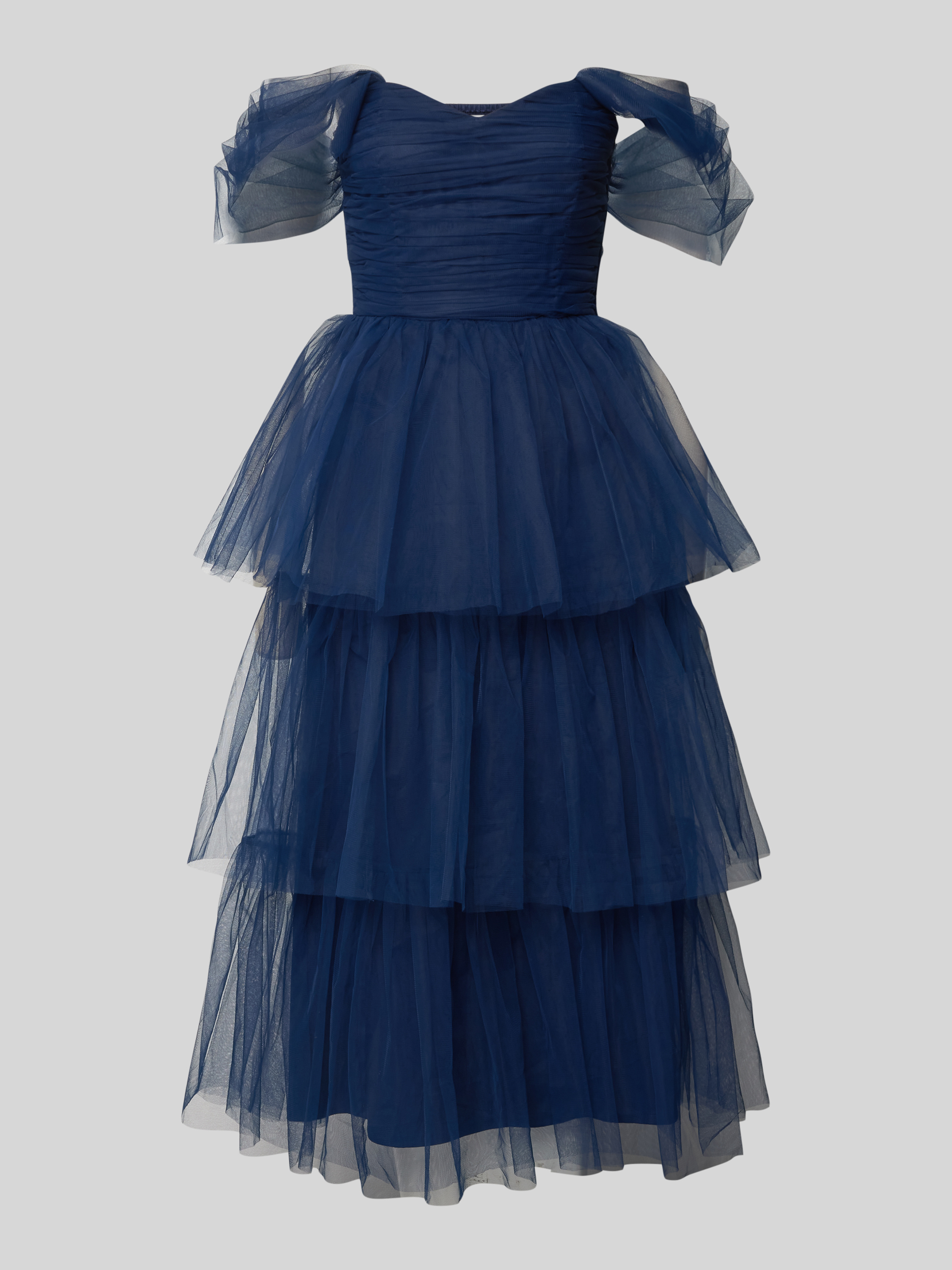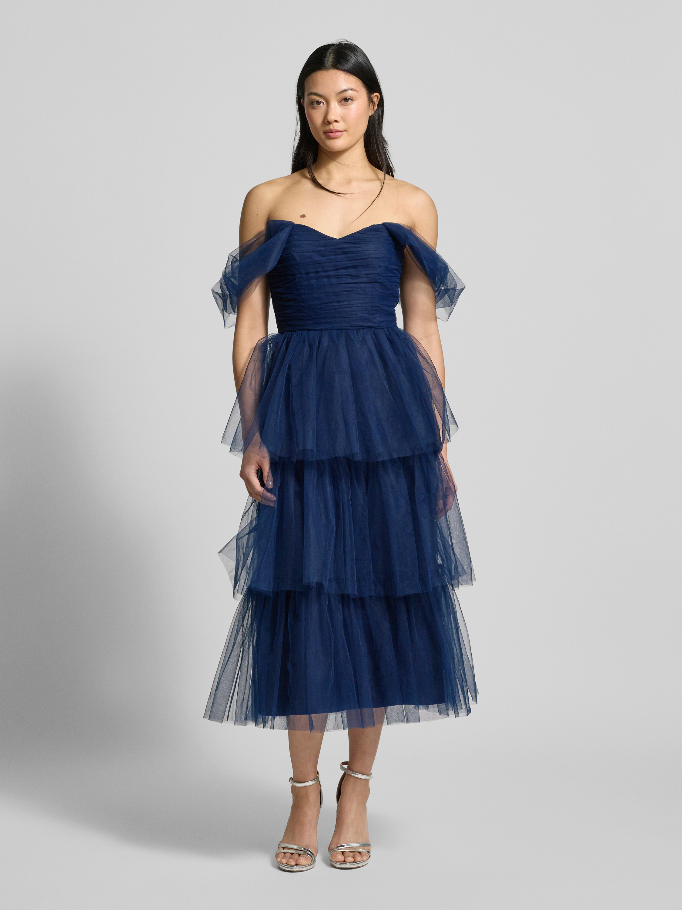 Das Abendkleid im Stufen-Look von Lace & Beads kombiniert eleganten Tüll mit einer taillierten Passform und einem schmeichelhaften Off-Shoulder-Design. Der Herz-Ausschnitt und die angedeuteten Ärmel aus Tüll verleihen dem Kleid eine zarte Note, während die Taillenpasse für eine harmonische Silhouette sorgt. Ideal für besondere Anlässe.