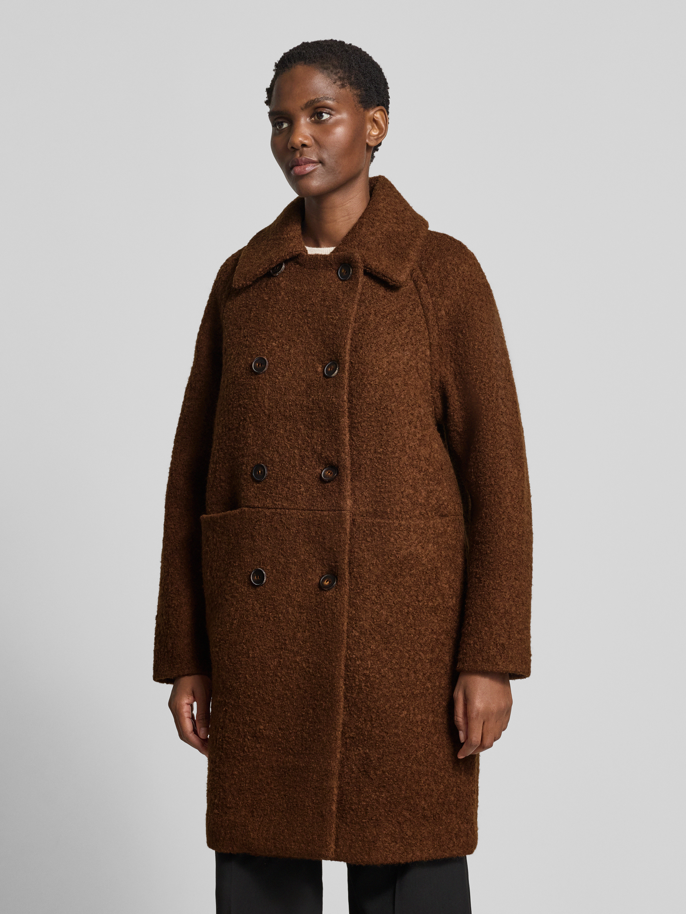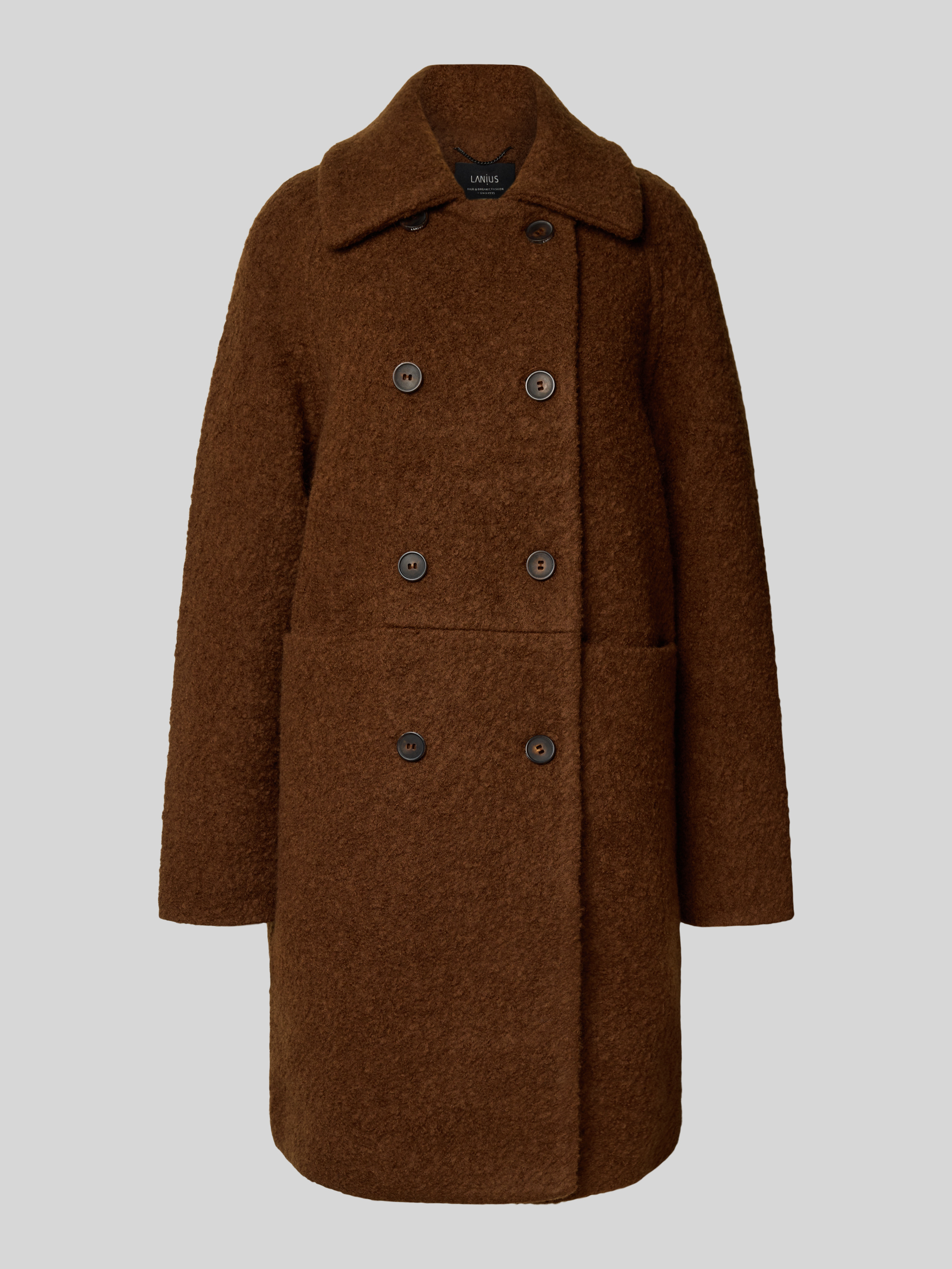 Der Damen Wollmantel von Lanius bringt mit seiner reinen Schurwolle und der Bouclé-Optik angenehme Wärme in den Alltag. Durch den lockeren Schnitt fällt er entspannt und lässt sich unkompliziert über verschiedenste Outfits legen. Praktische Eingrifftaschen ergänzen den klassischen Zweireiher mit Umlegekragen.