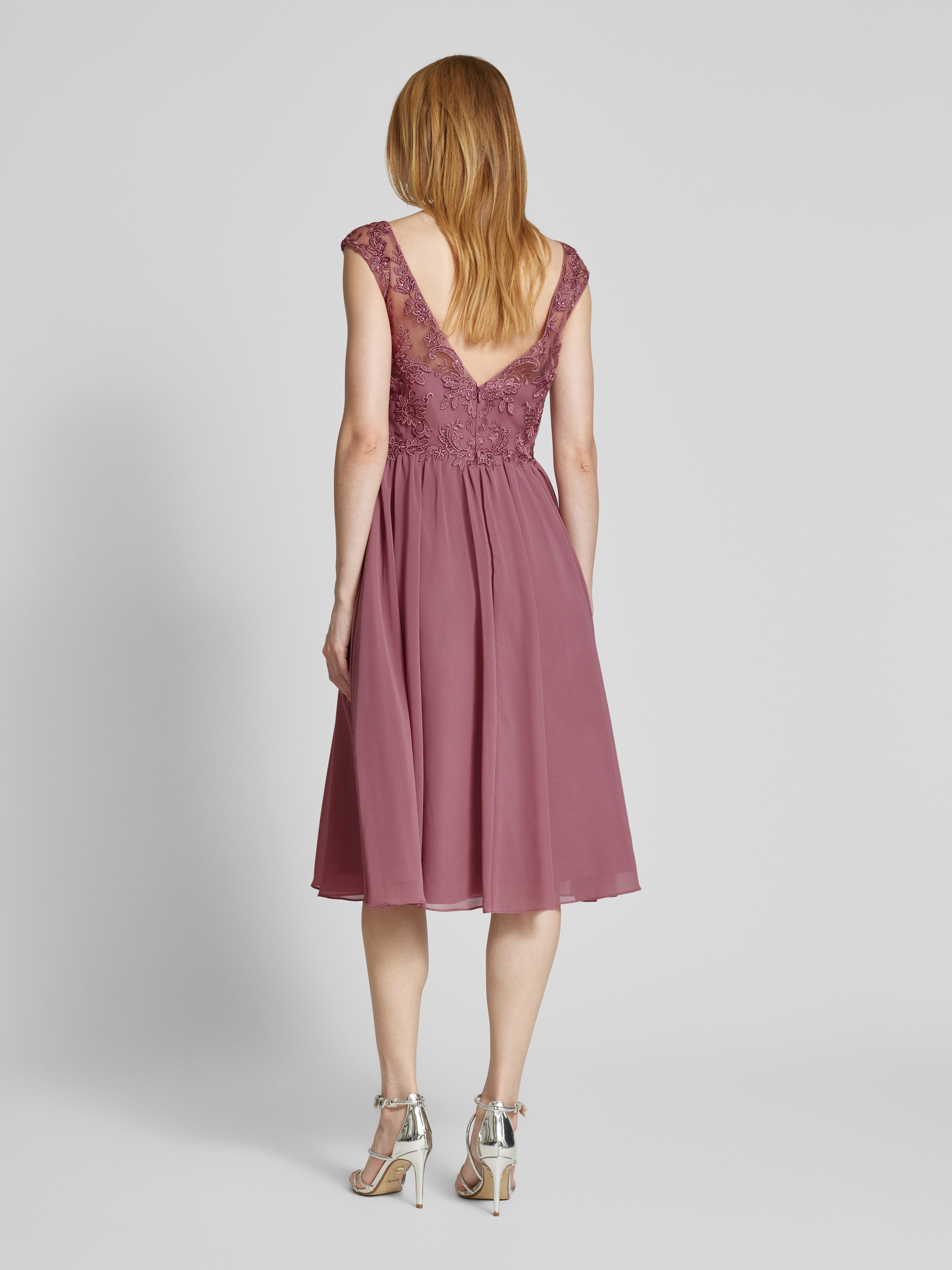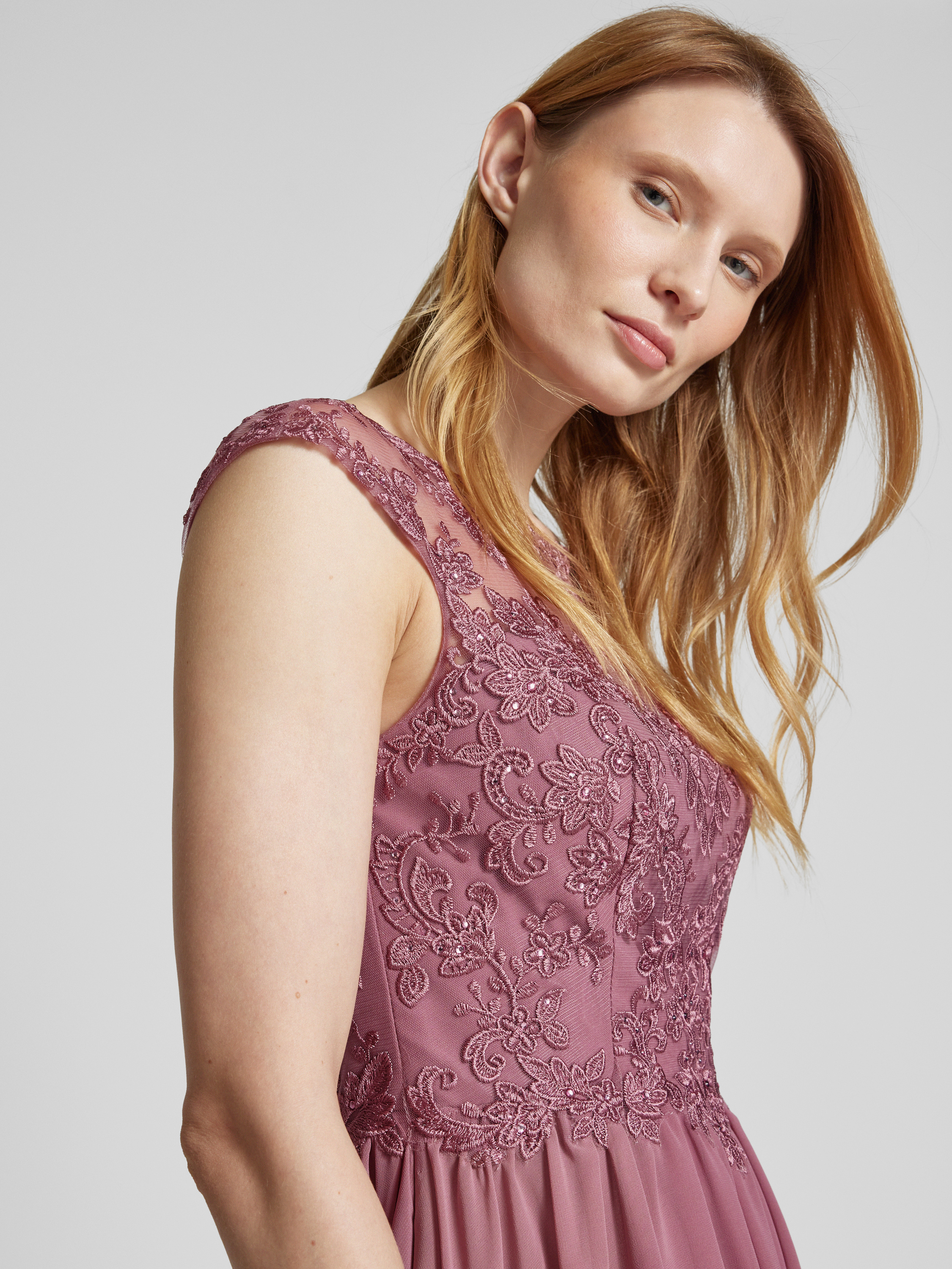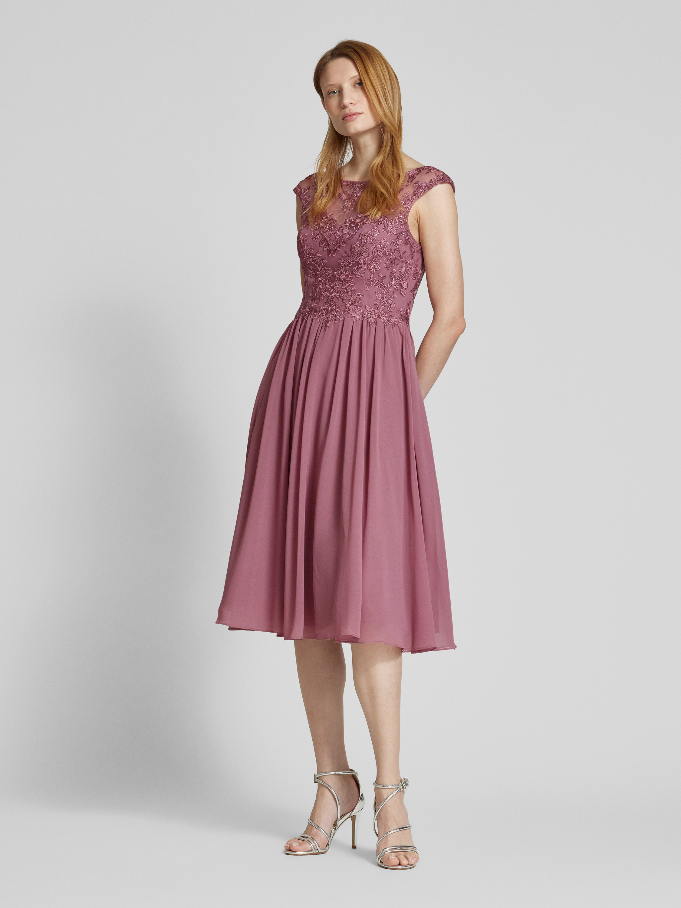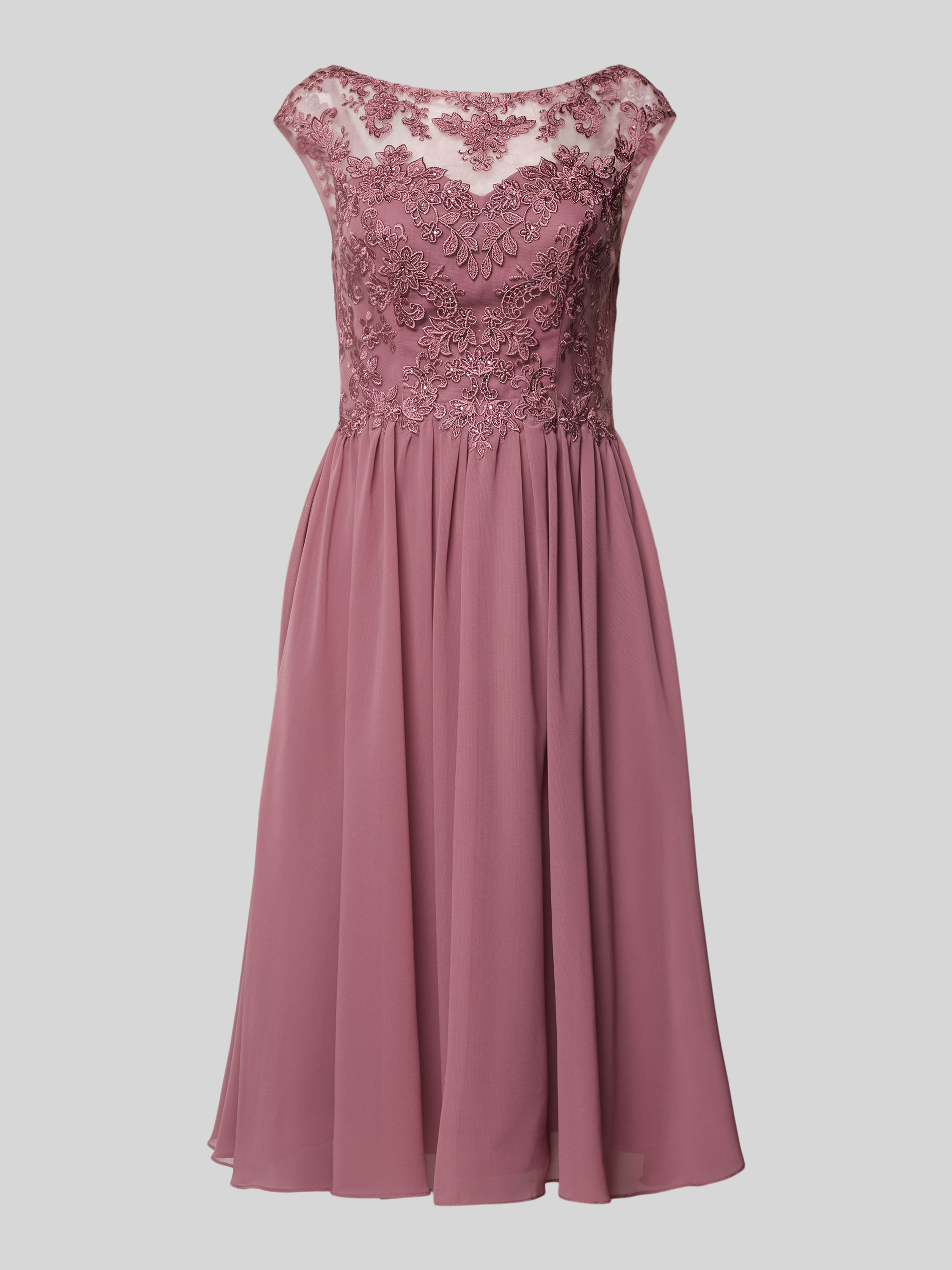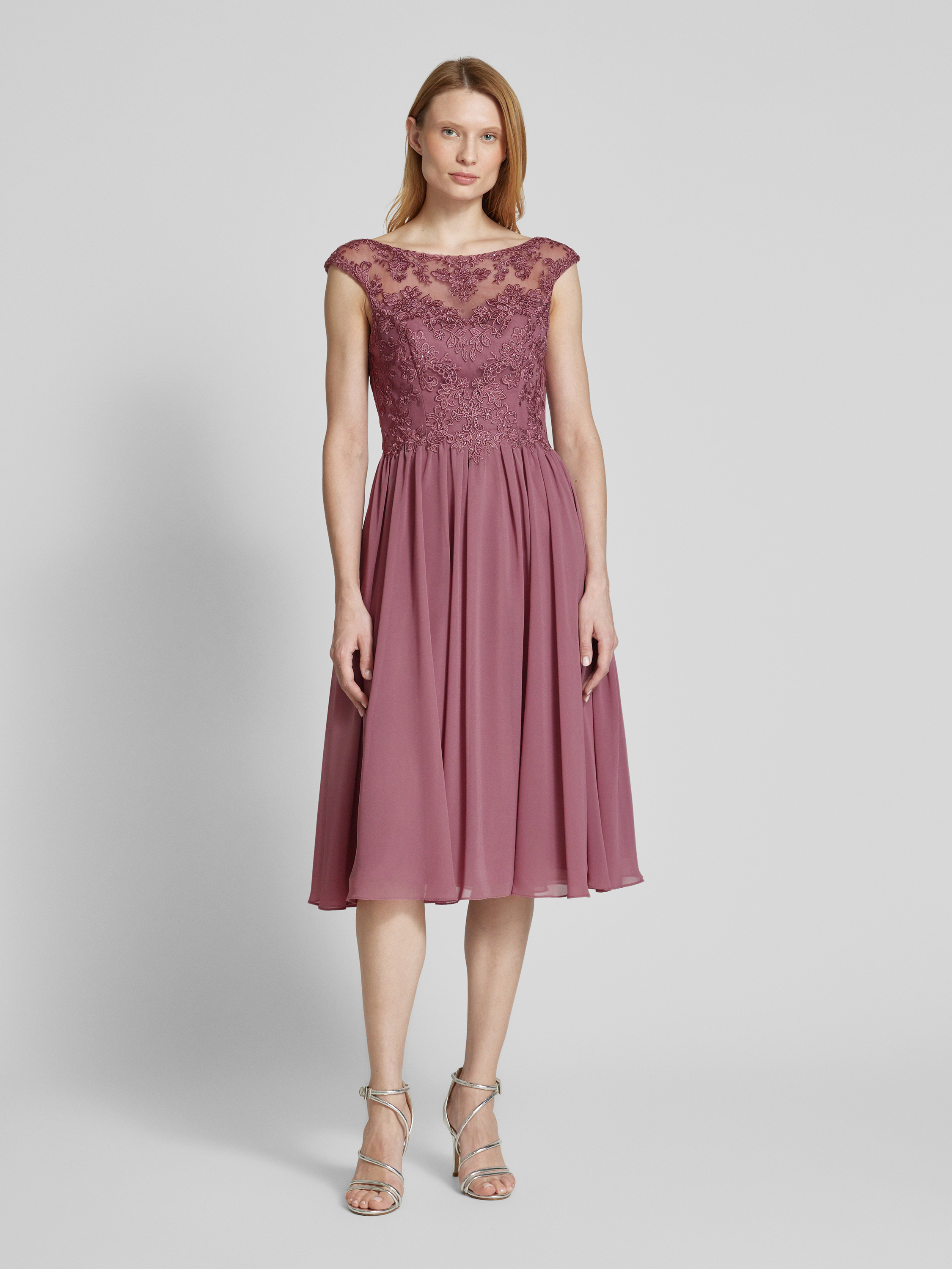Das elegante Cocktailkleid von LAONA beeindruckt durch seinen taillierten Schnitt und den raffinierten U-Boot-Ausschnitt. Der zarte Spitzenbesatz und der Stufen-Look verleihen dem Kleid eine besondere Note. Ideal für festliche Anlässe, bei denen man stilvoll und selbstbewusst auftreten möchte.