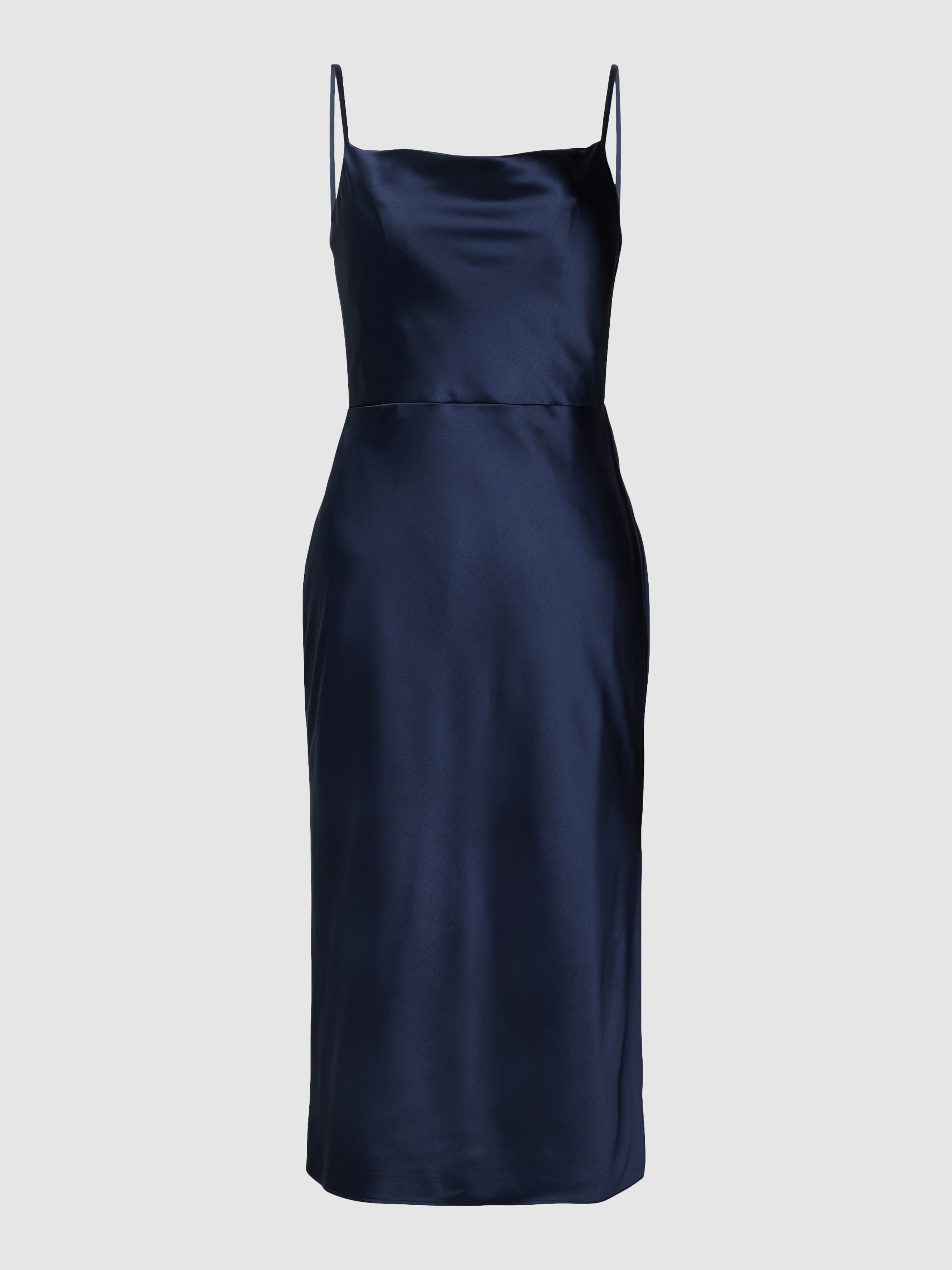 Das Cocktailkleid von LAONA ist tailliert geschnitten. Es kommt mit Wasserfall-Ausschnitt und Spaghettiträgern.