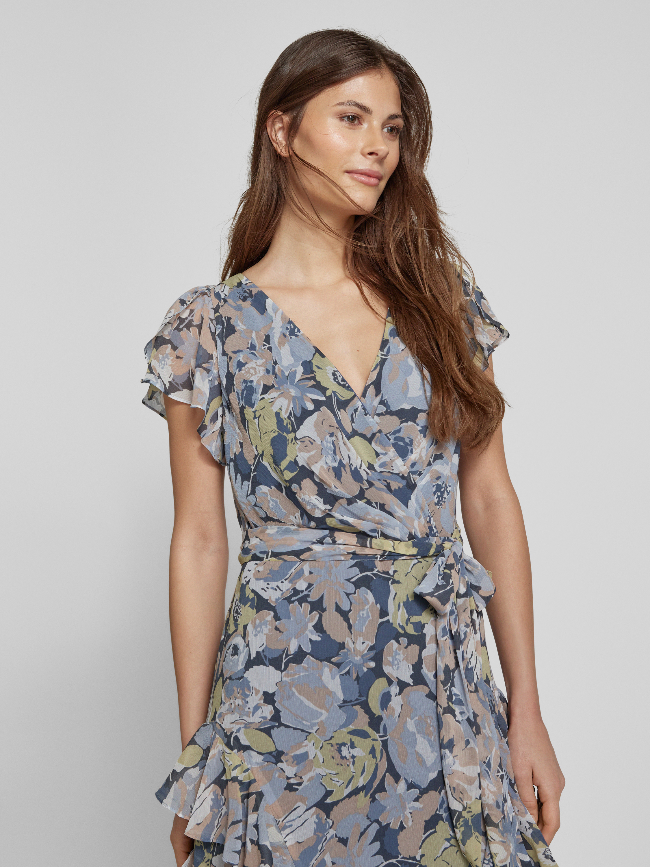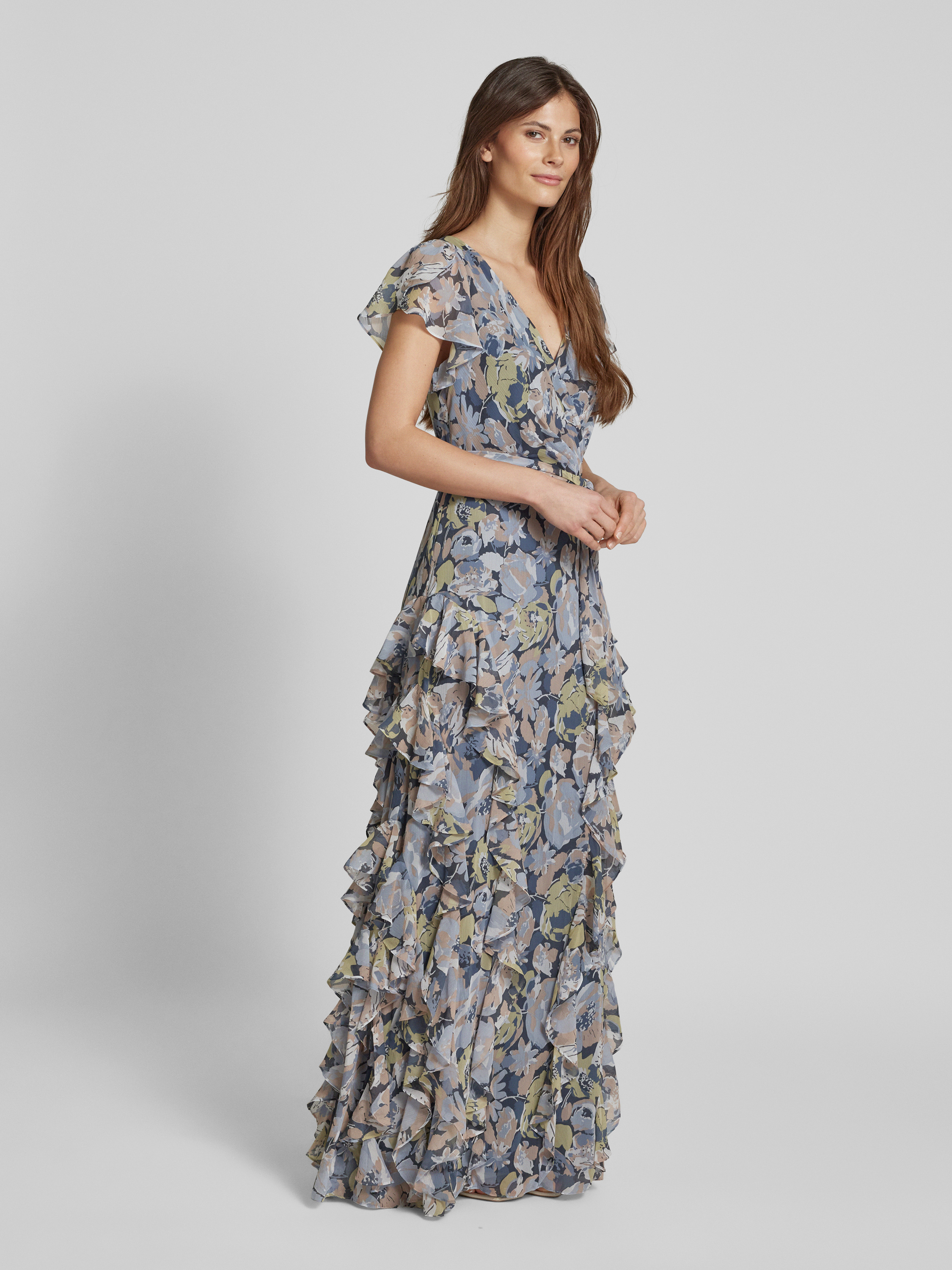 Das Abendkleid 'KIMBINELL' von Lauren Ralph Lauren zeichnet sich durch seinen taillierten Schnitt und die elegante Wickel-Optik aus. Der V-Ausschnitt und die Volants verleihen eine fließende Silhouette, während der Bindegürtel sanft die Taille betont. Ein idealer Begleiter für besondere Anlässe.