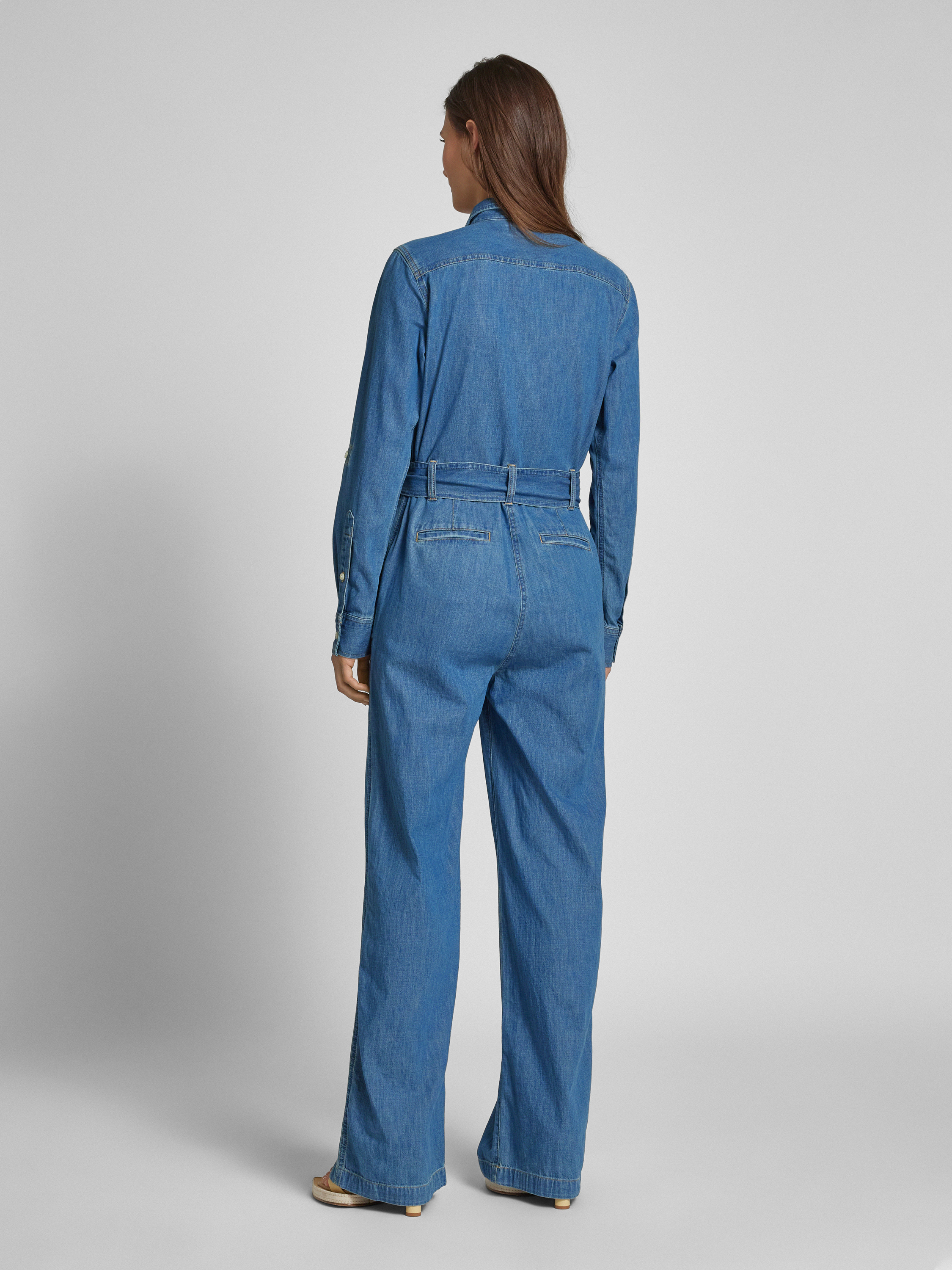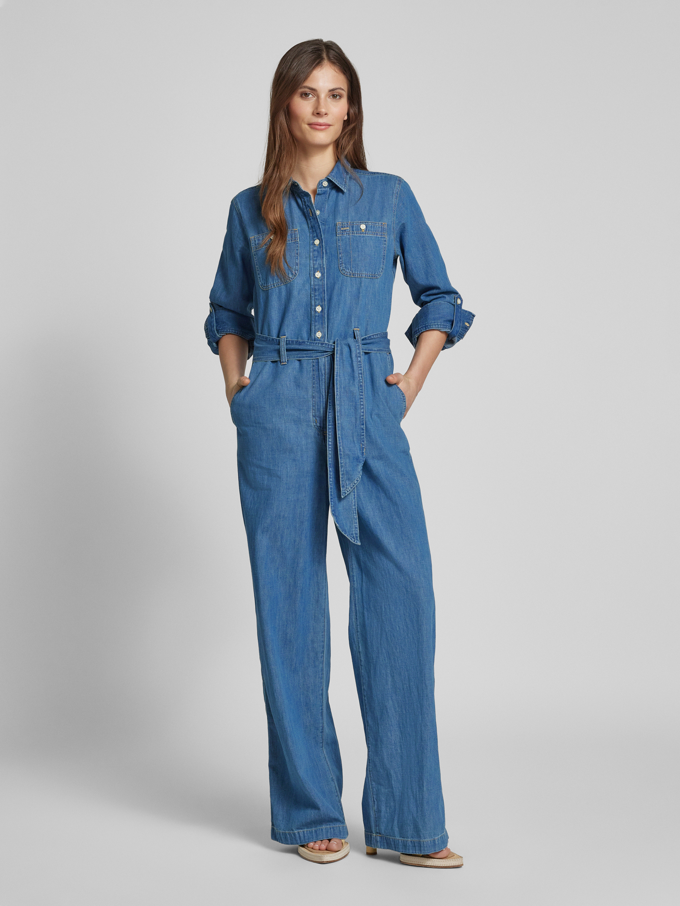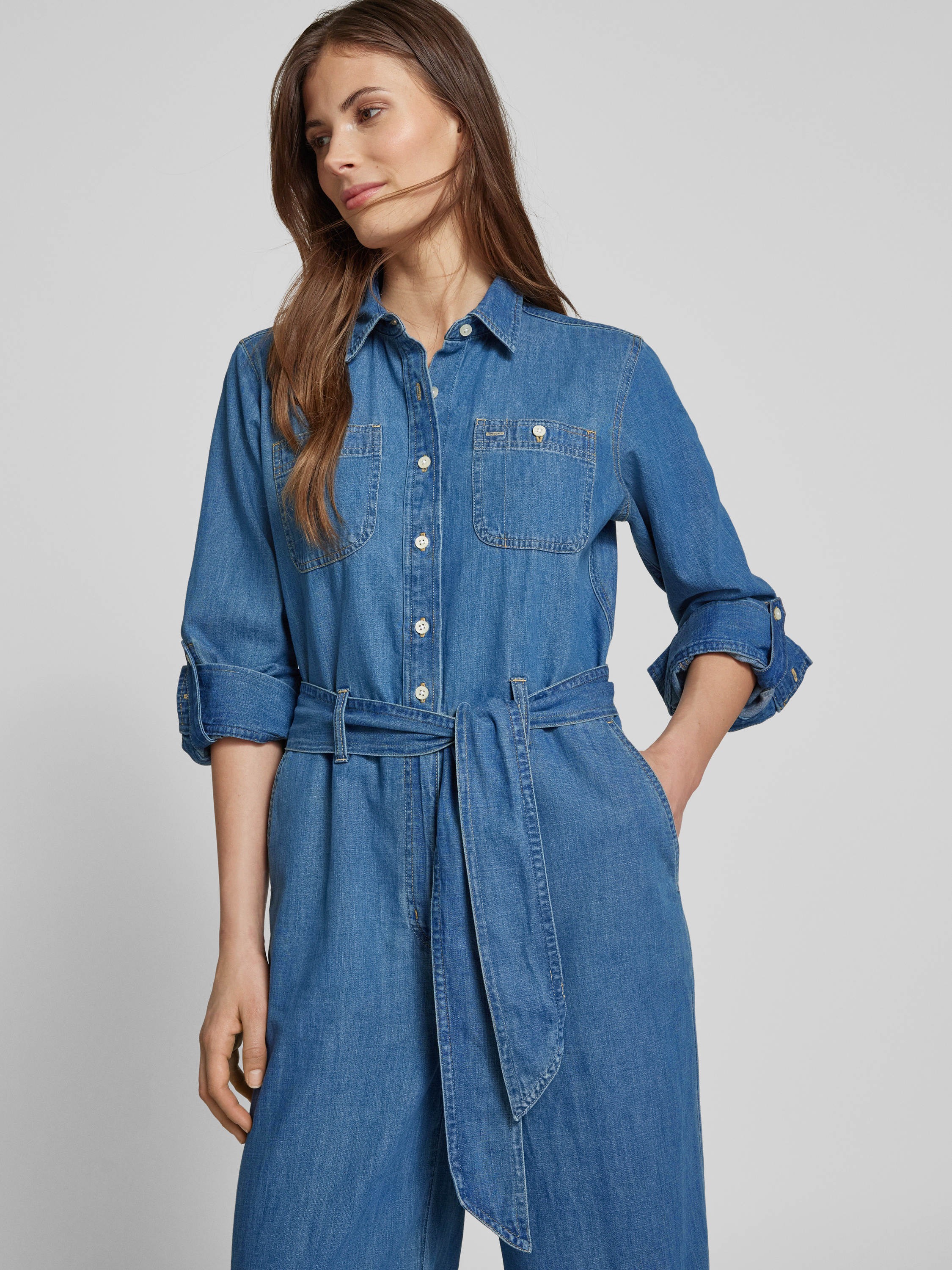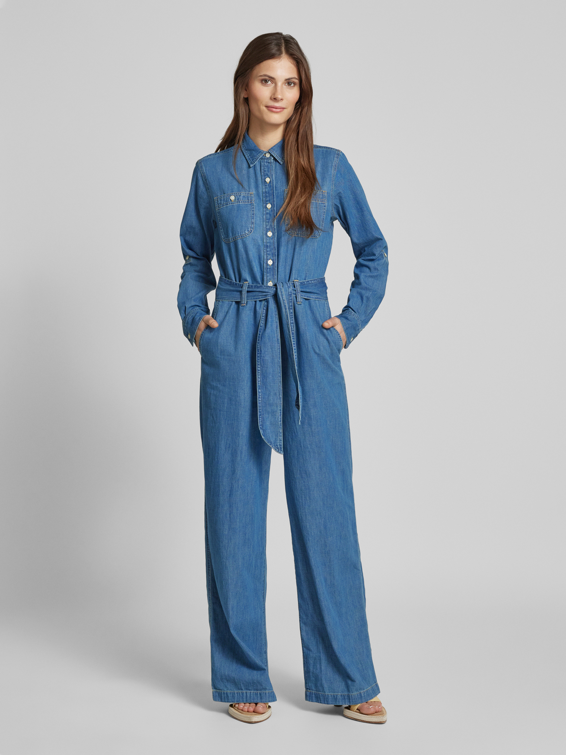 Der Jumpsuit 'CRISELDA' von Lauren Ralph Lauren verbindet den lässigen Charme der Denim-Optik mit dem Komfort reiner Baumwolle. Der Regular Fit sorgt für eine angenehme Passform, während der Bindegürtel individuell angepasst werden kann. Ideal für alltagstaugliche Eleganz.