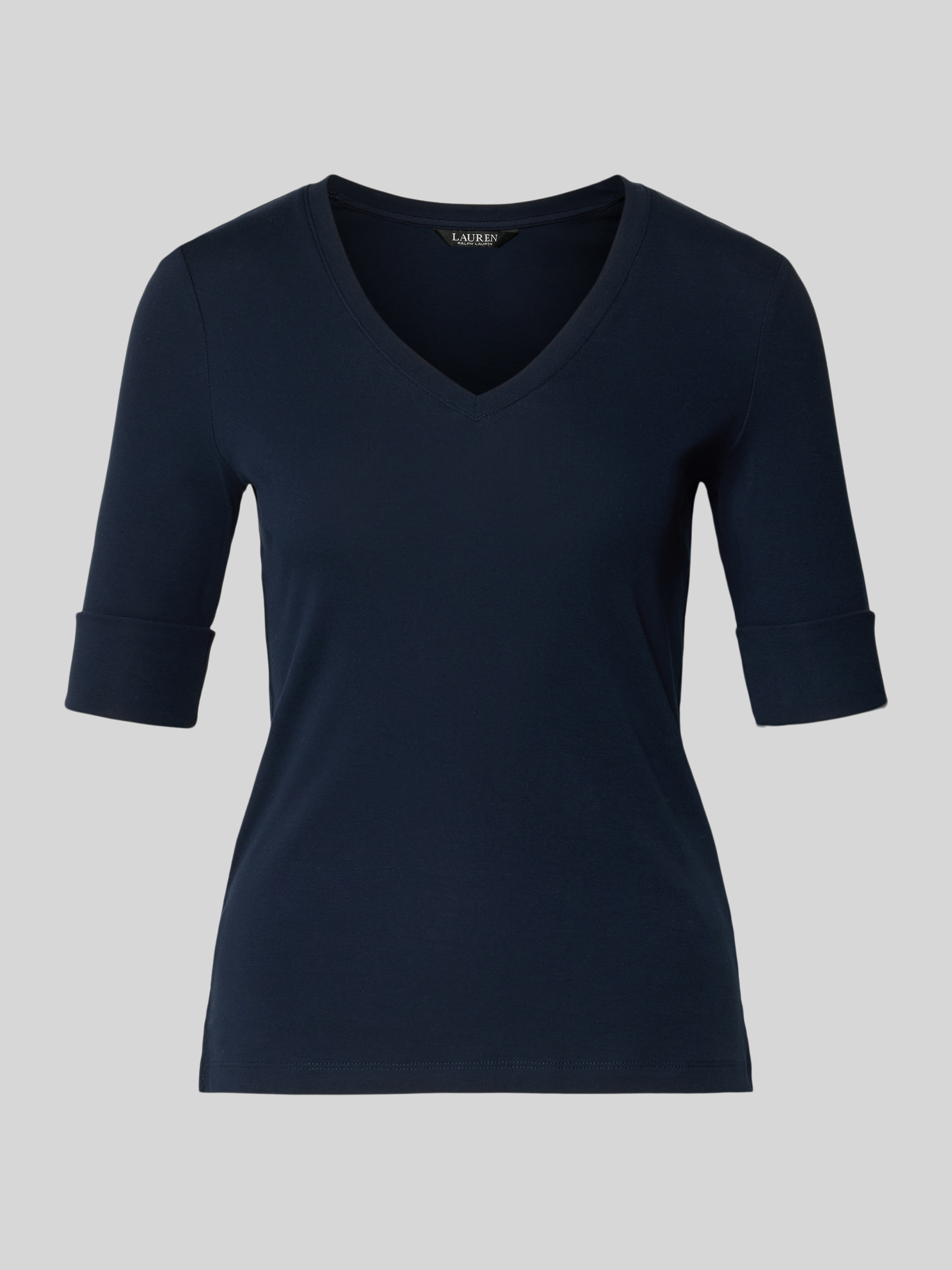Das Damen T-Shirt von Lauren Ralph Lauren im Modell 'JUDY' kombiniert einen klassischen V-Ausschnitt mit einer legeren Regular-Fit-Passform. Der Baumwoll-Elasthan-Mix sorgt für ein angenehmes Tragegefühl im Alltag, während die Ärmel mit Aufschlag einen lockeren Akzent setzen. So lässt sich das T-Shirt vielseitig einsetzen und unkompliziert mit verschiedenen Outfits kombinieren.