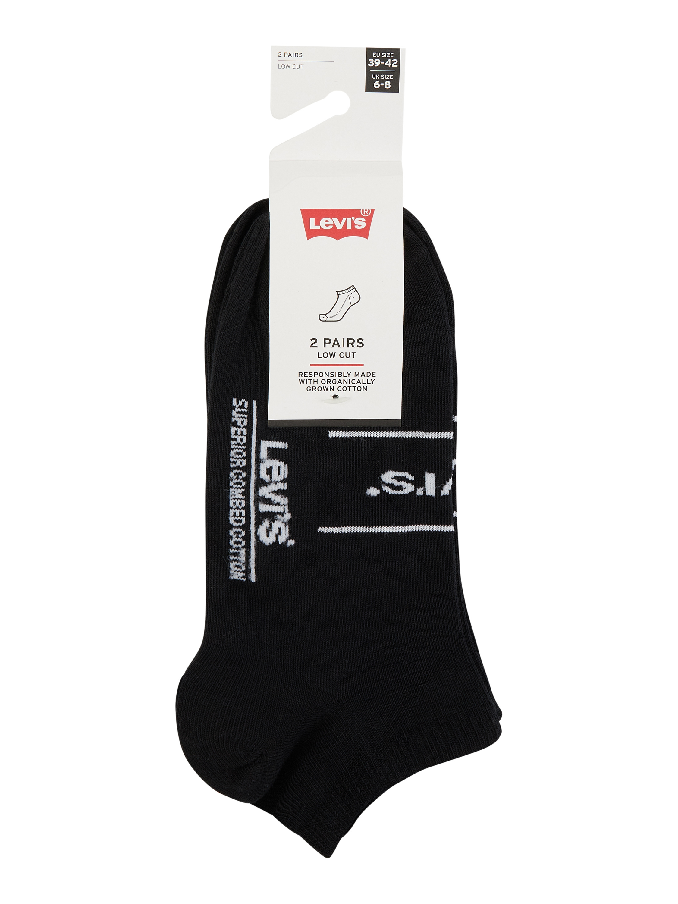 Die Sneakersocken von Levi's® sind aus einem Bio-Baumwoll-Elasthan-Mix gefertigt. Sie zeigen sich im 2er-Pack mit Label-Detail sowie Kontraststreifen.