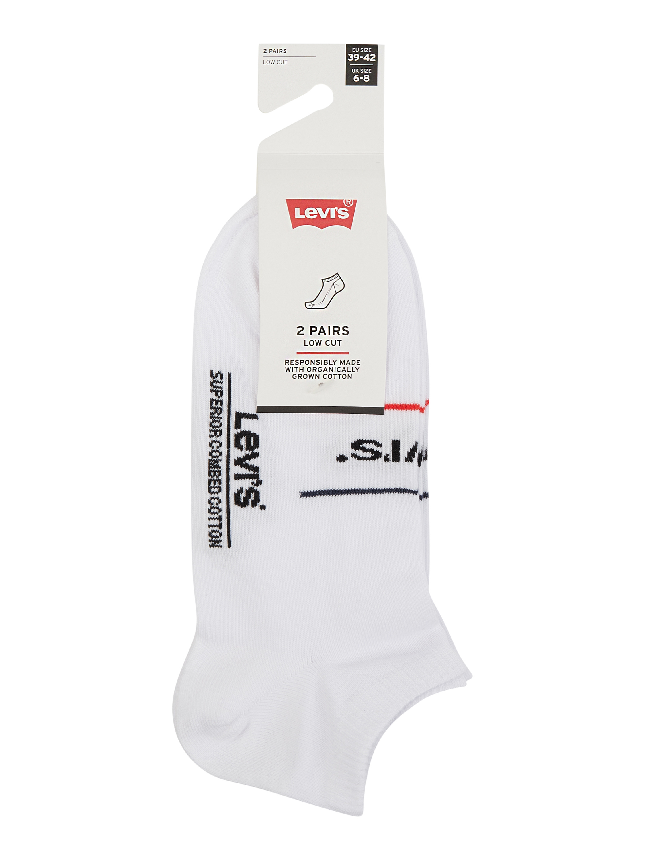 Die Sneakersocken von Levi's® sind aus einem Bio-Baumwoll-Elasthan-Mix gefertigt. Sie zeigen sich im 2er-Pack mit Label-Detail sowie Kontraststreifen.