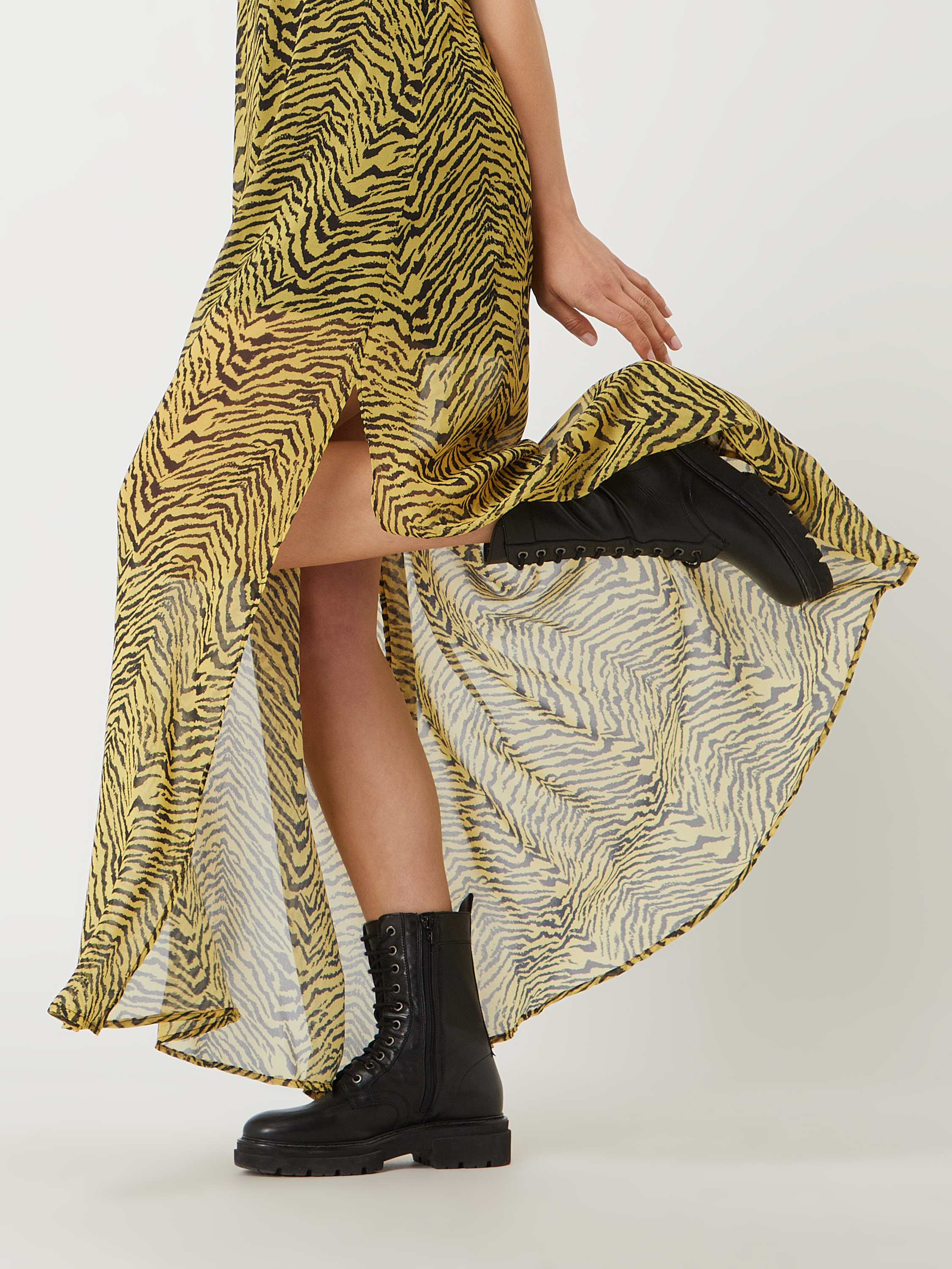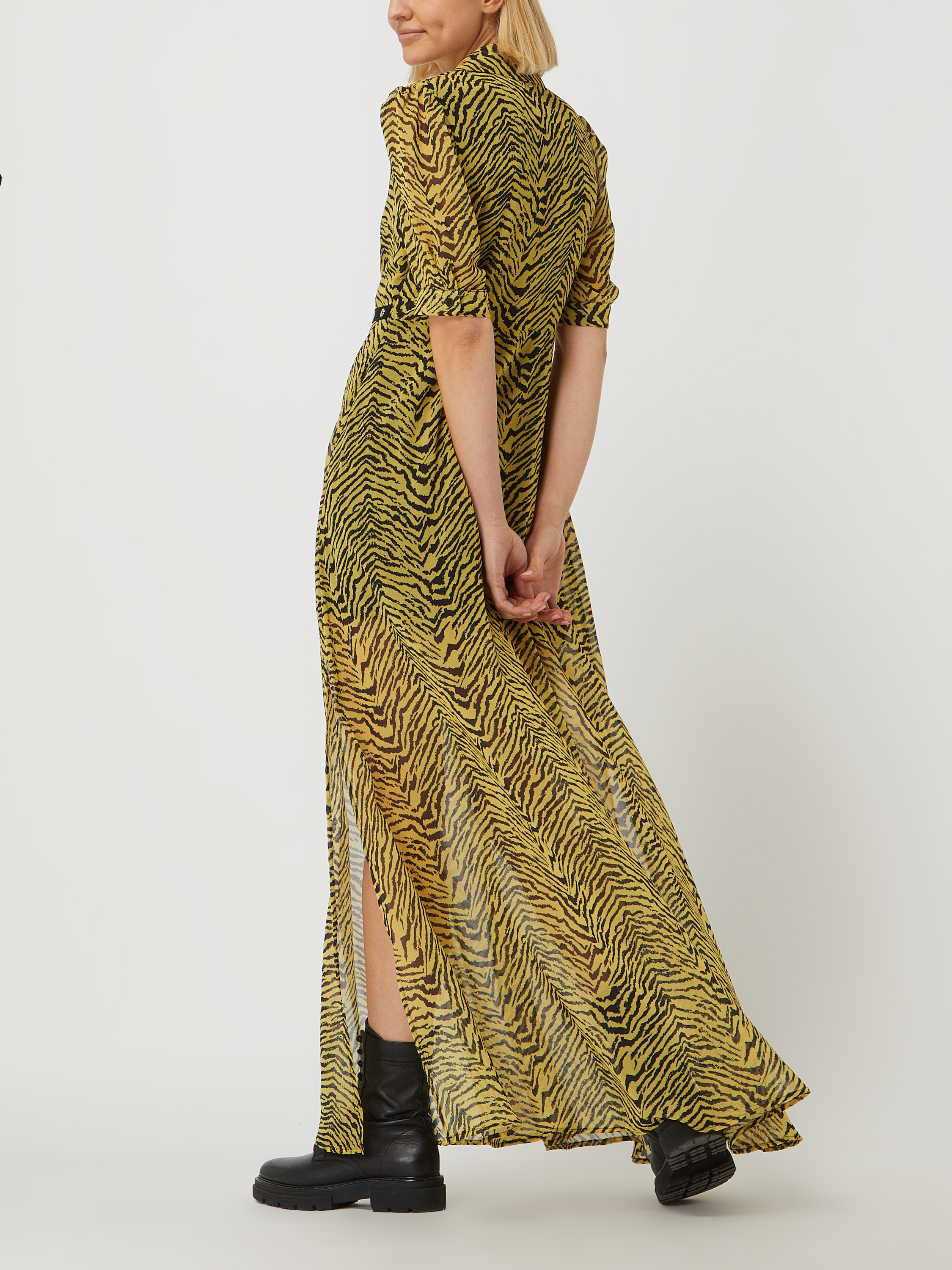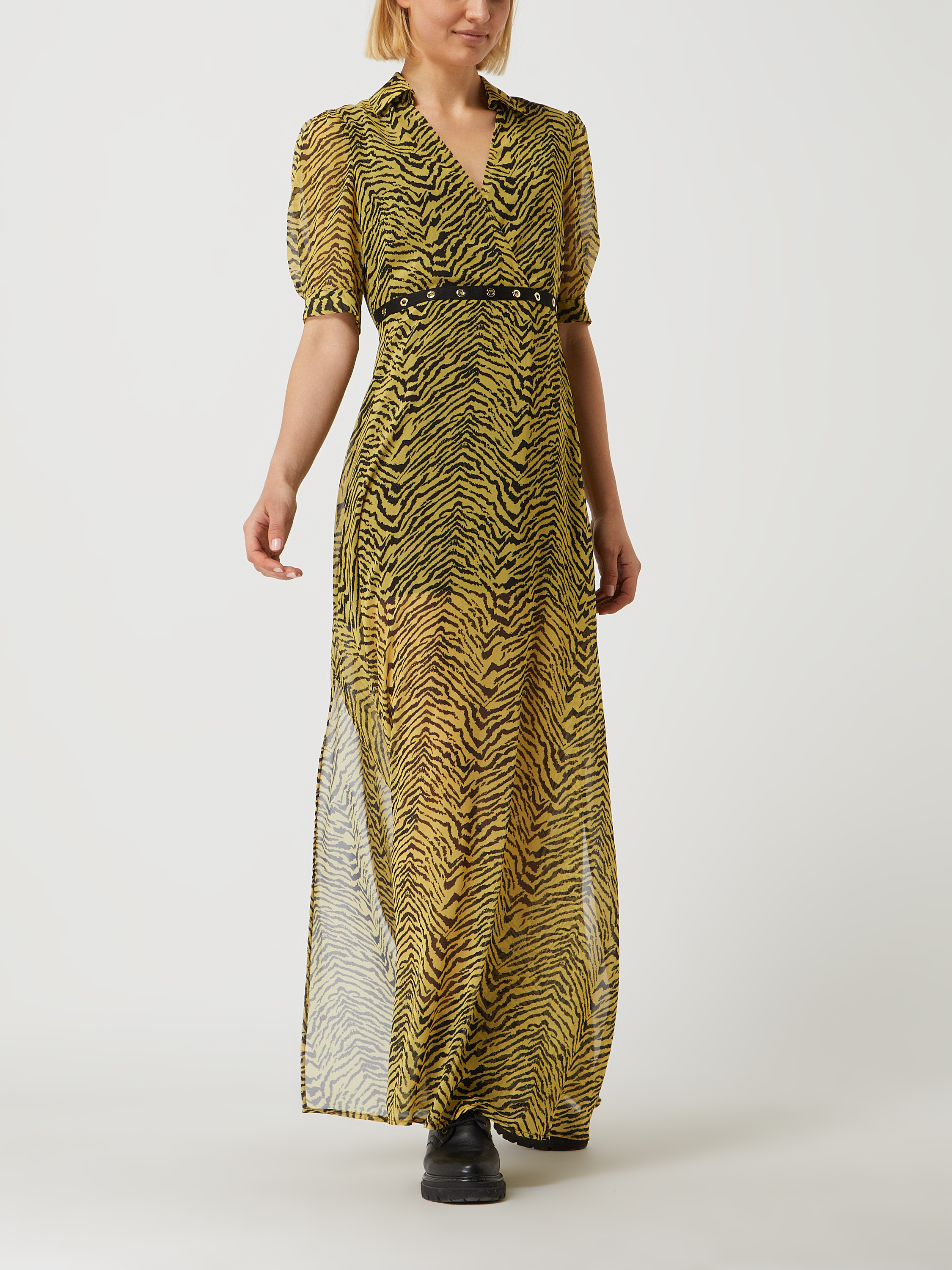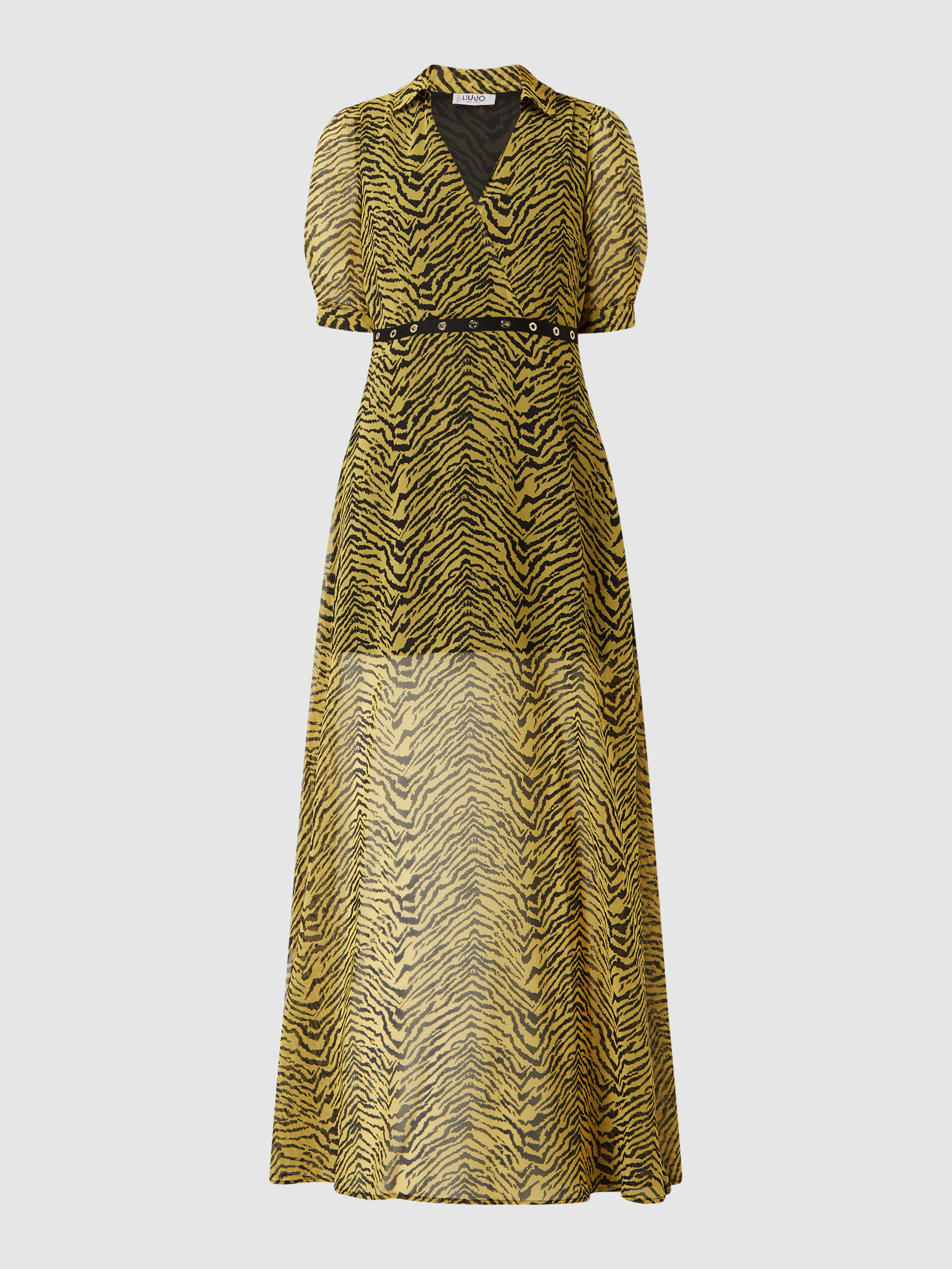 Das Maxikleid von Liu Jo aus luftigem Chiffon eignet sich durch den taillierten Schnitt und das auffällige Zebramuster hervorragend für sommerliche Anlässe. Der ausgestellte Rockteil und die hohen Seitenschlitze sorgen für angenehme Bewegungsfreiheit. Ein V-Ausschnitt und kurze Ärmel mit geknöpftem Abschluss runden das Design ab.
