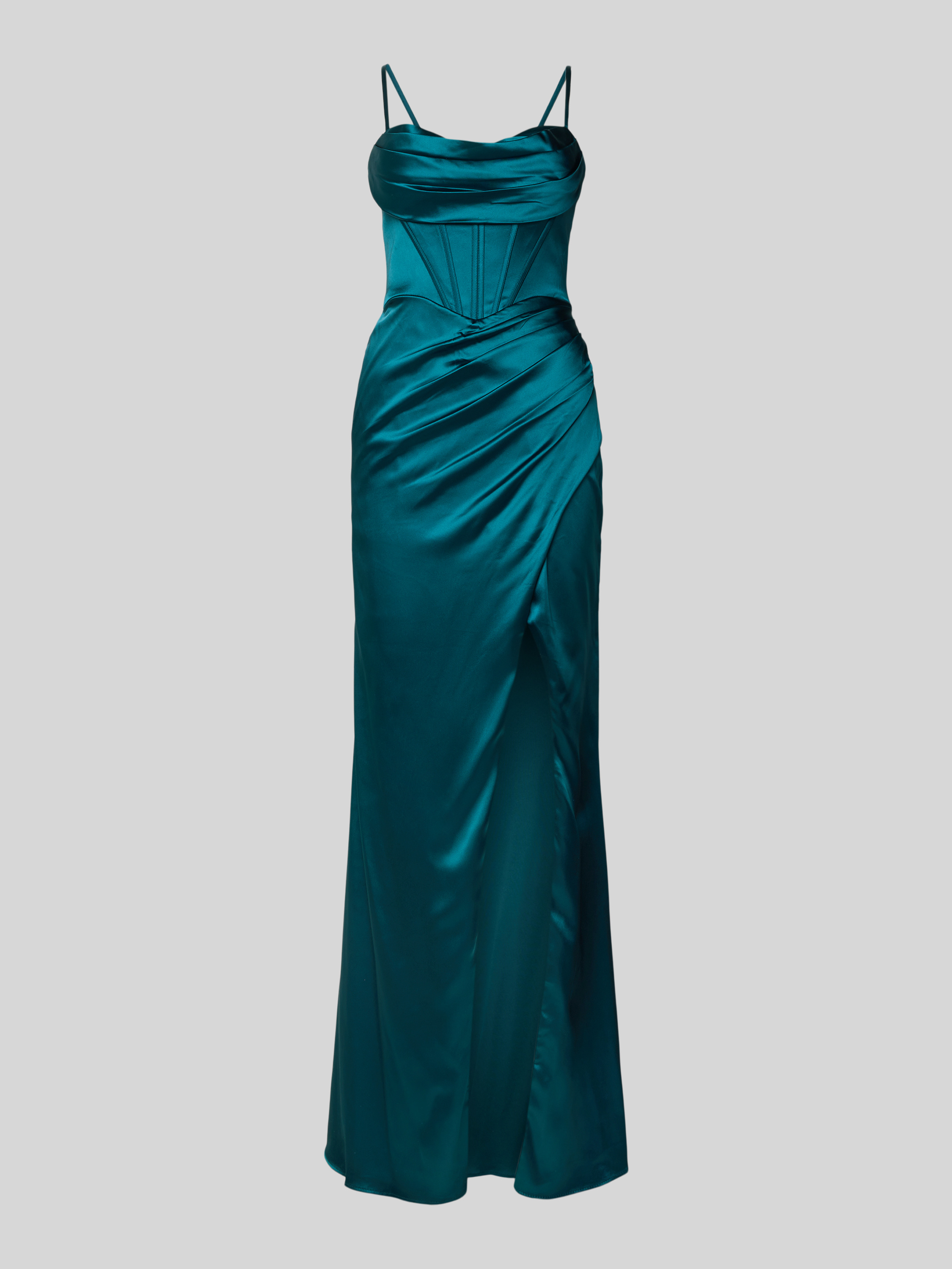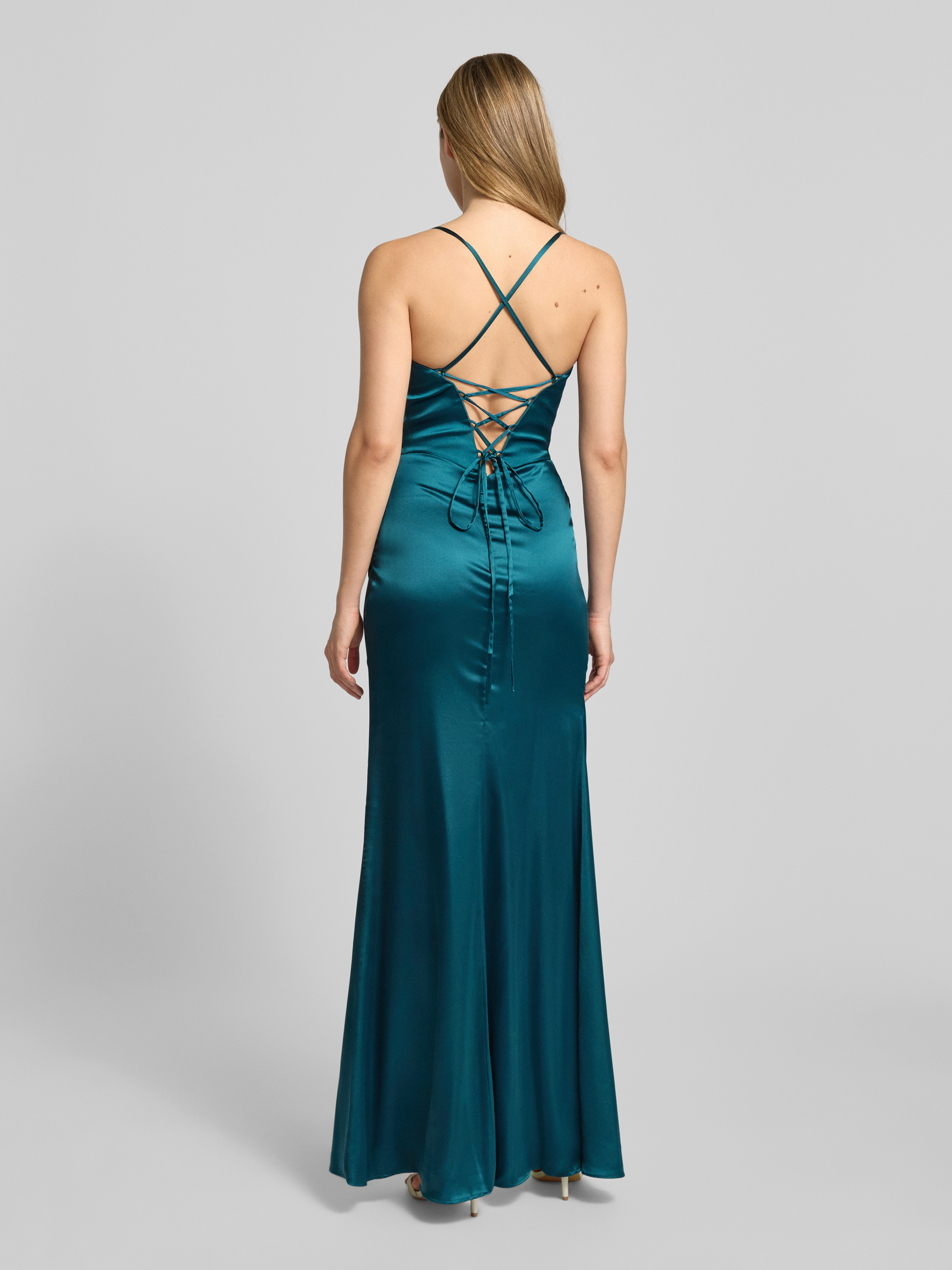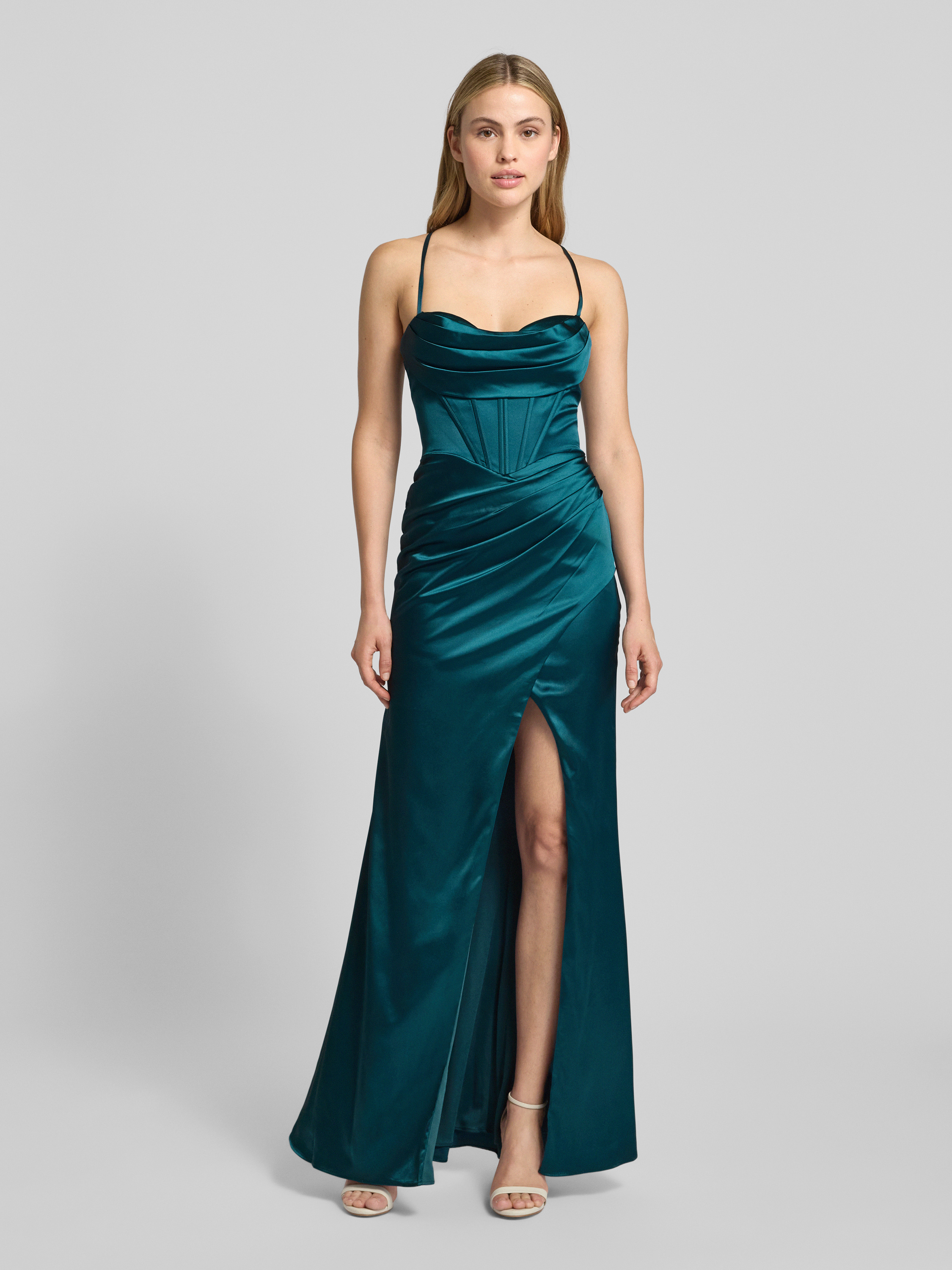 LuxuarAbendkleid aus Satin mit Gehschlitz und rückseitiger Schnürung in petrol