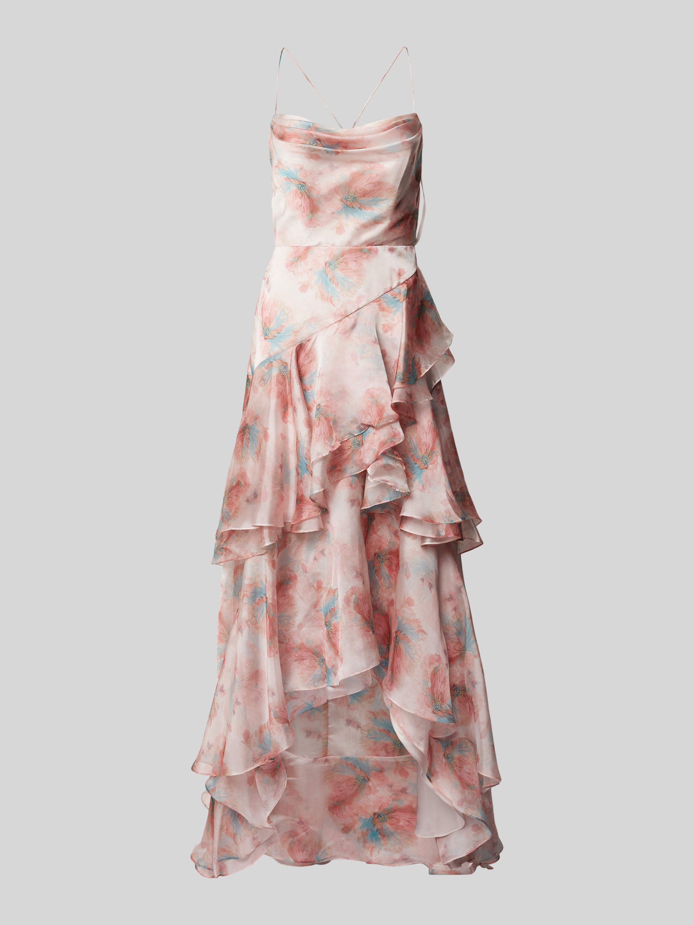 Das elegante Abendkleid von Luxuar verbindet einen taillierten Schnitt mit fließender Maxilänge und zarten Spaghettiträgern, wodurch es eine feminine Silhouette formt. Die ausgestellte Rockpartie und die Volants verleihen dem Kleid eine schwungvolle Leichtigkeit, die sich ideal für besondere Anlässe eignet.