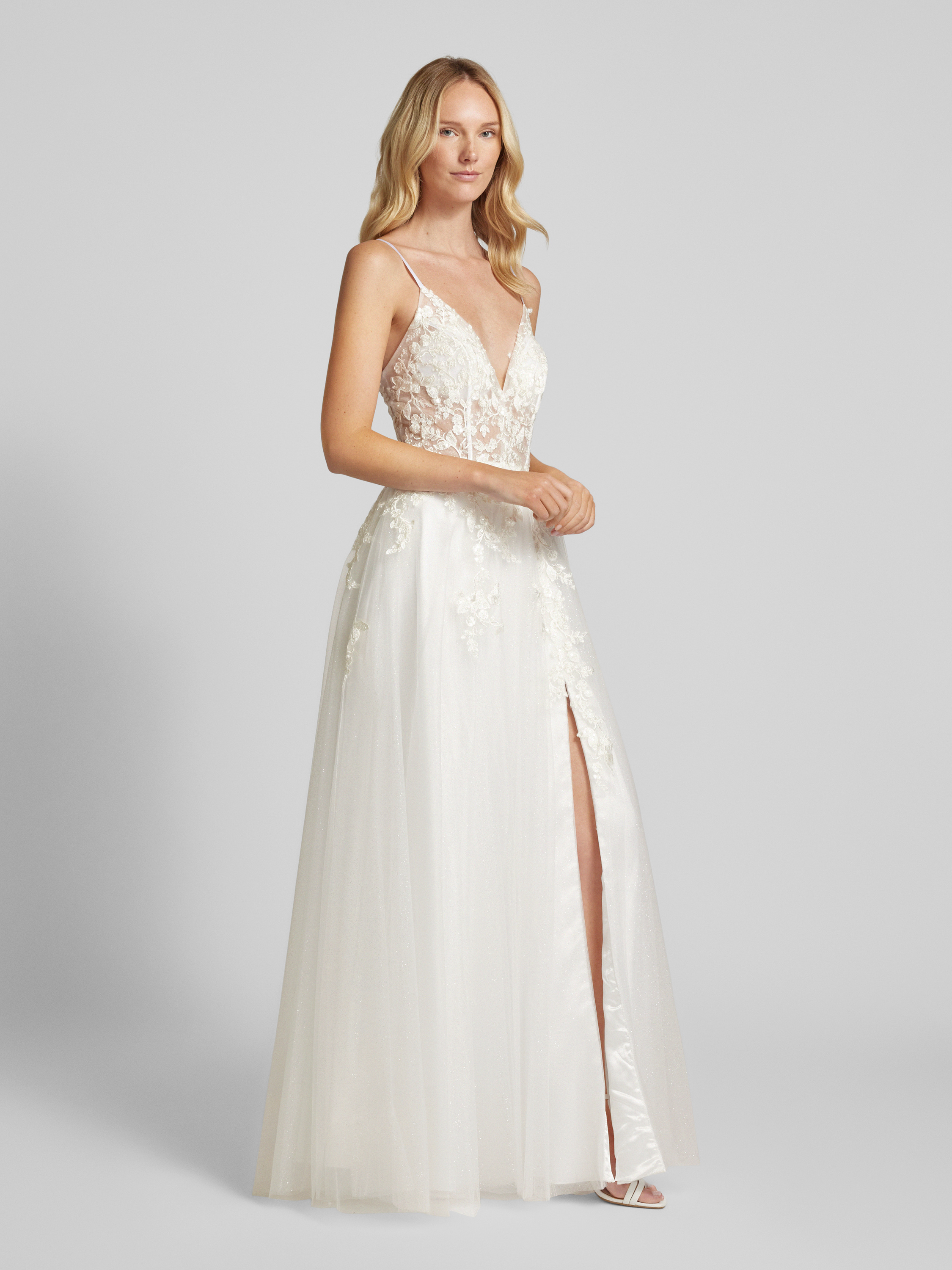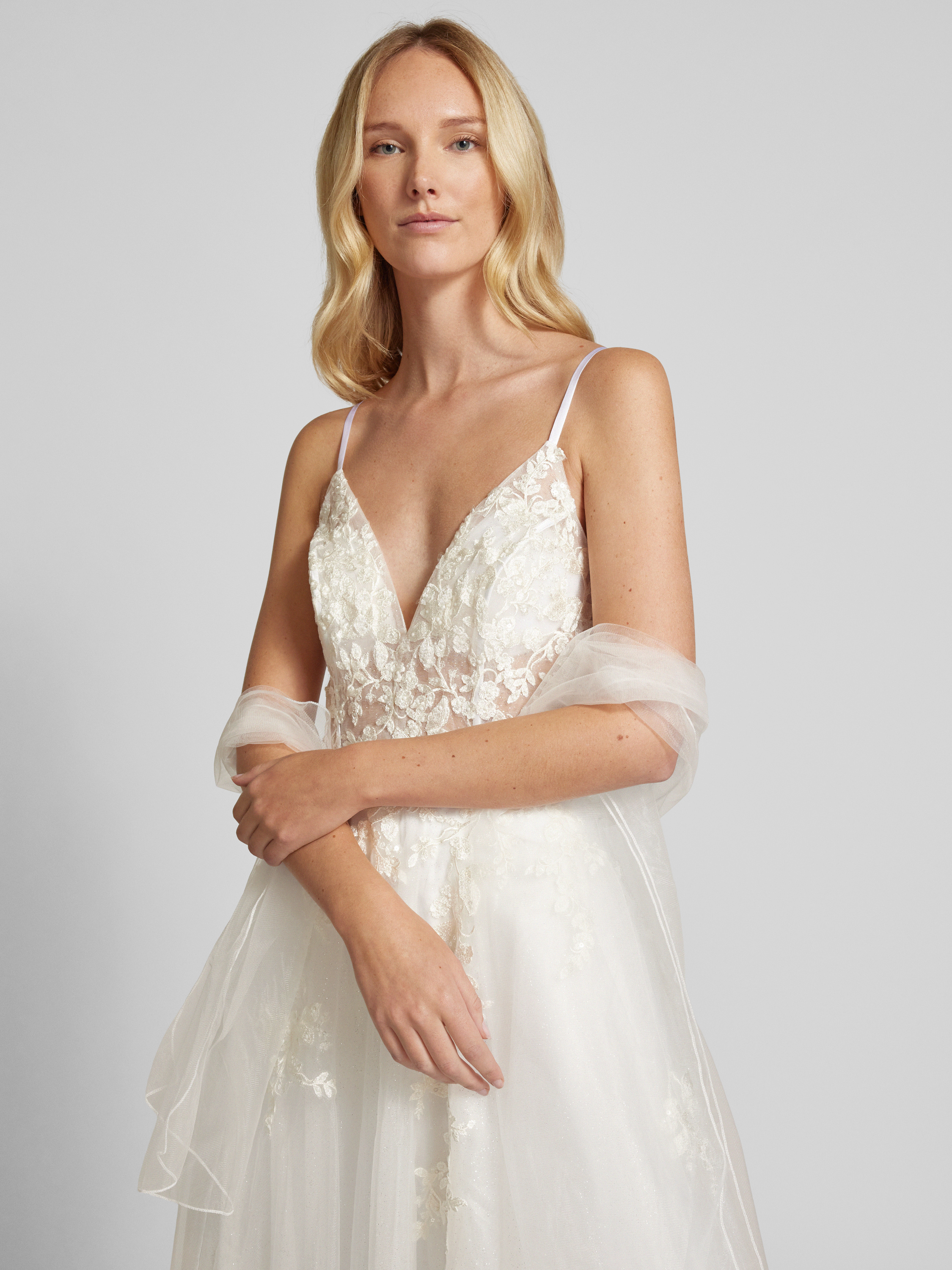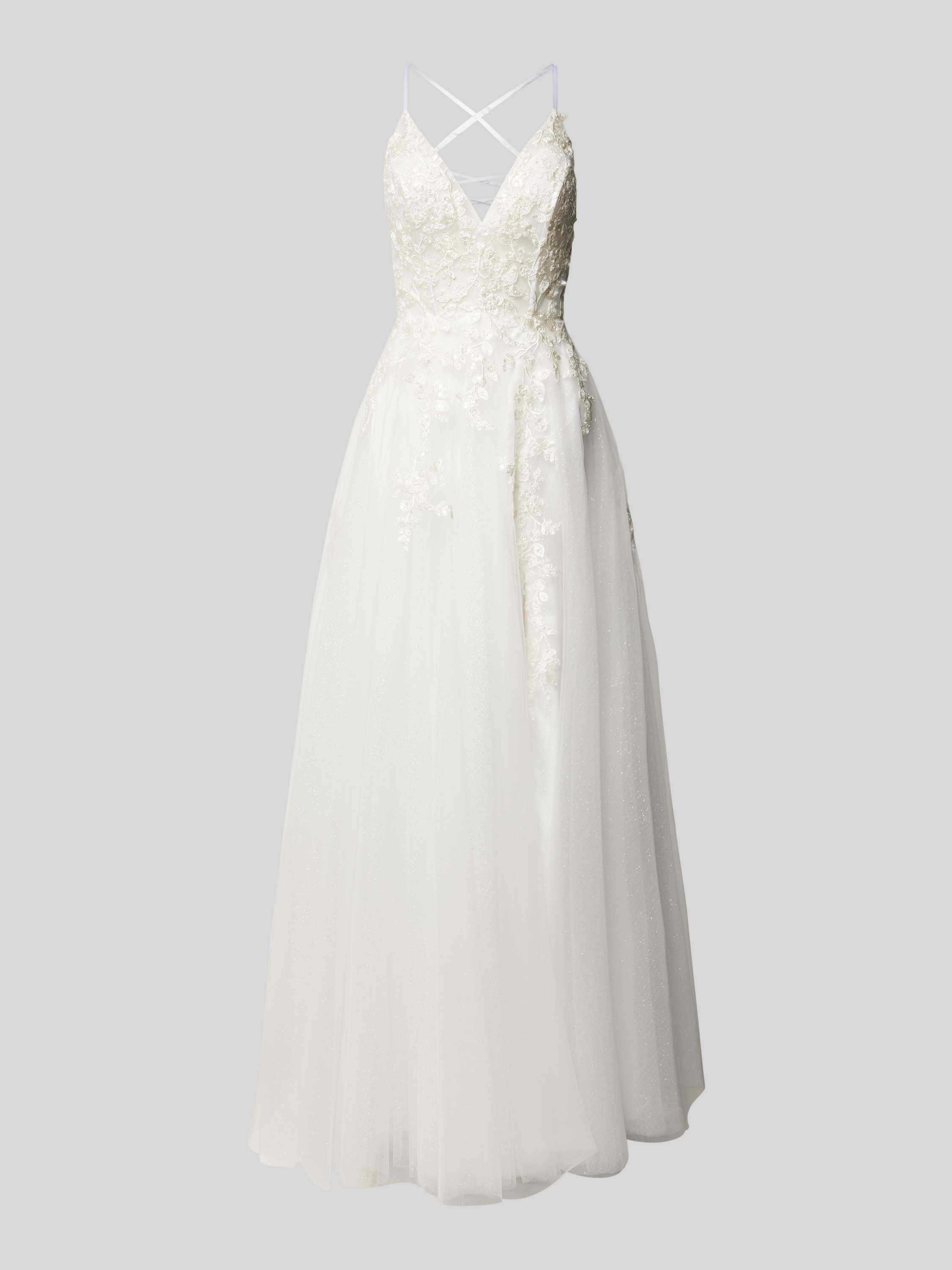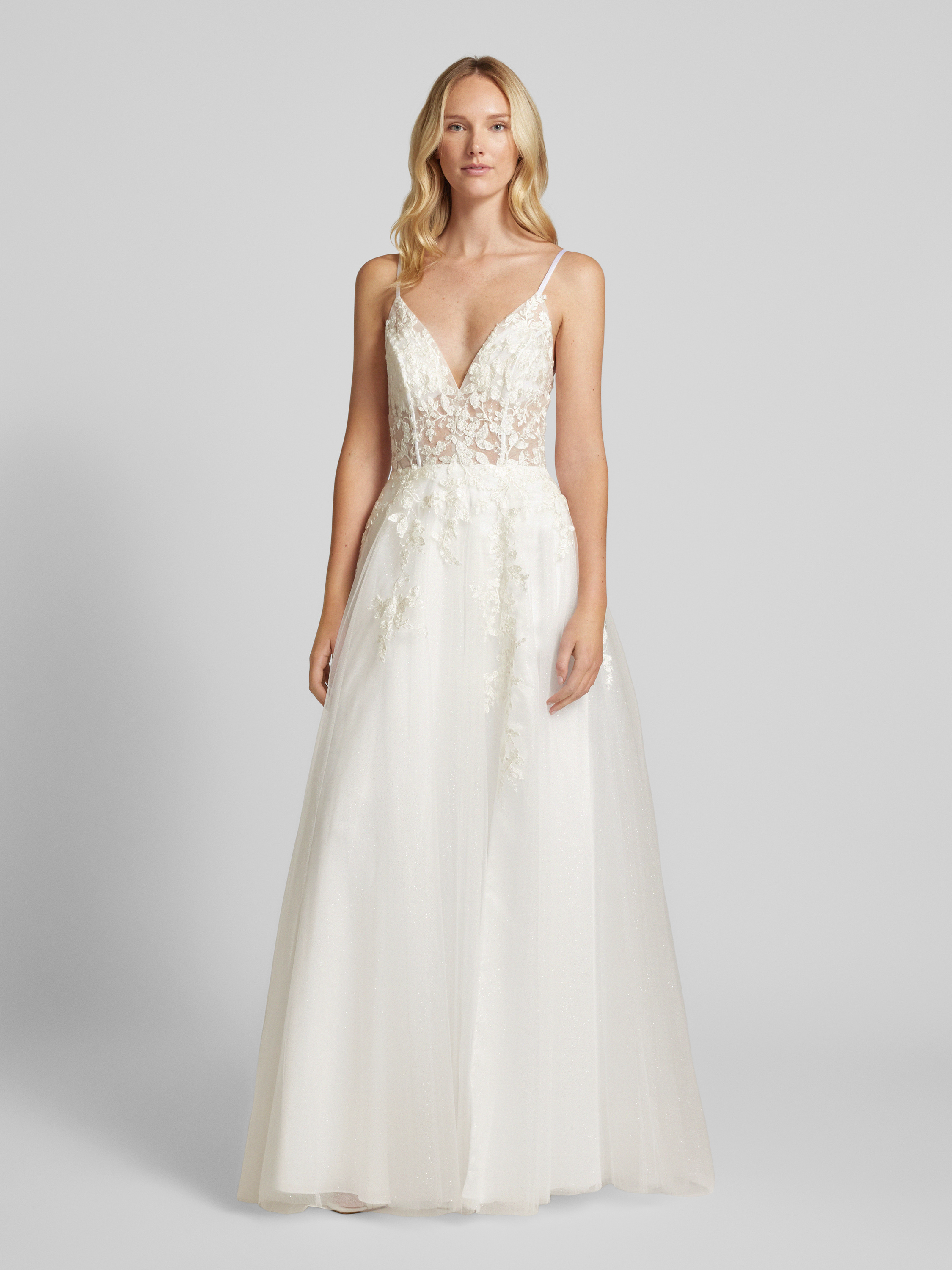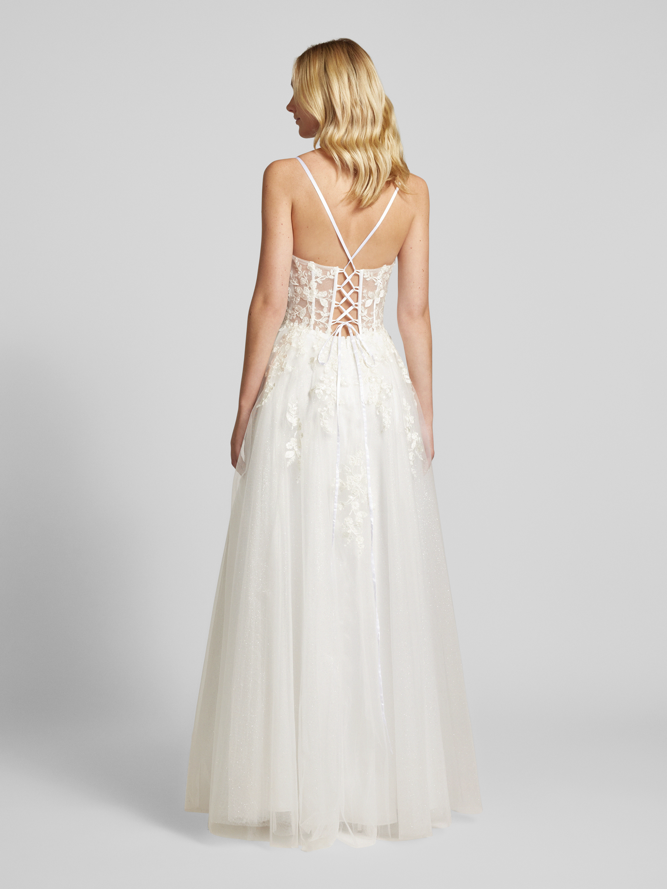 Das Damenkleid von LUXUAR FASHION zeichnet sich durch einen taillierten Schnitt und eine Maxilänge aus, wodurch eine elegante Silhouette entsteht. Der Herz-Ausschnitt und der feine Zierbesatz setzen stilvolle Akzente, während der blickdichte Unterrock angenehme Sicherheit im Tragegefühl vermittelt.