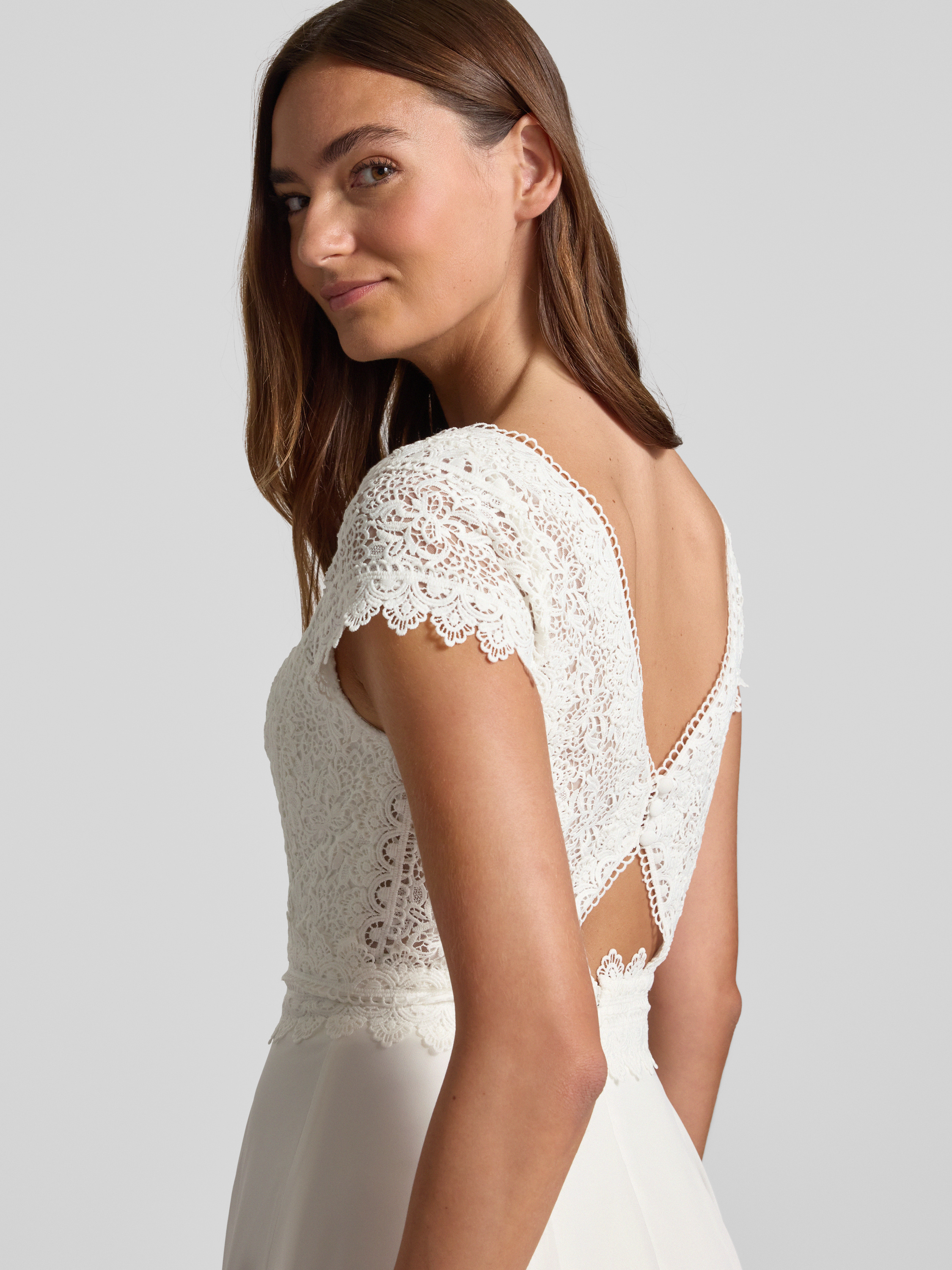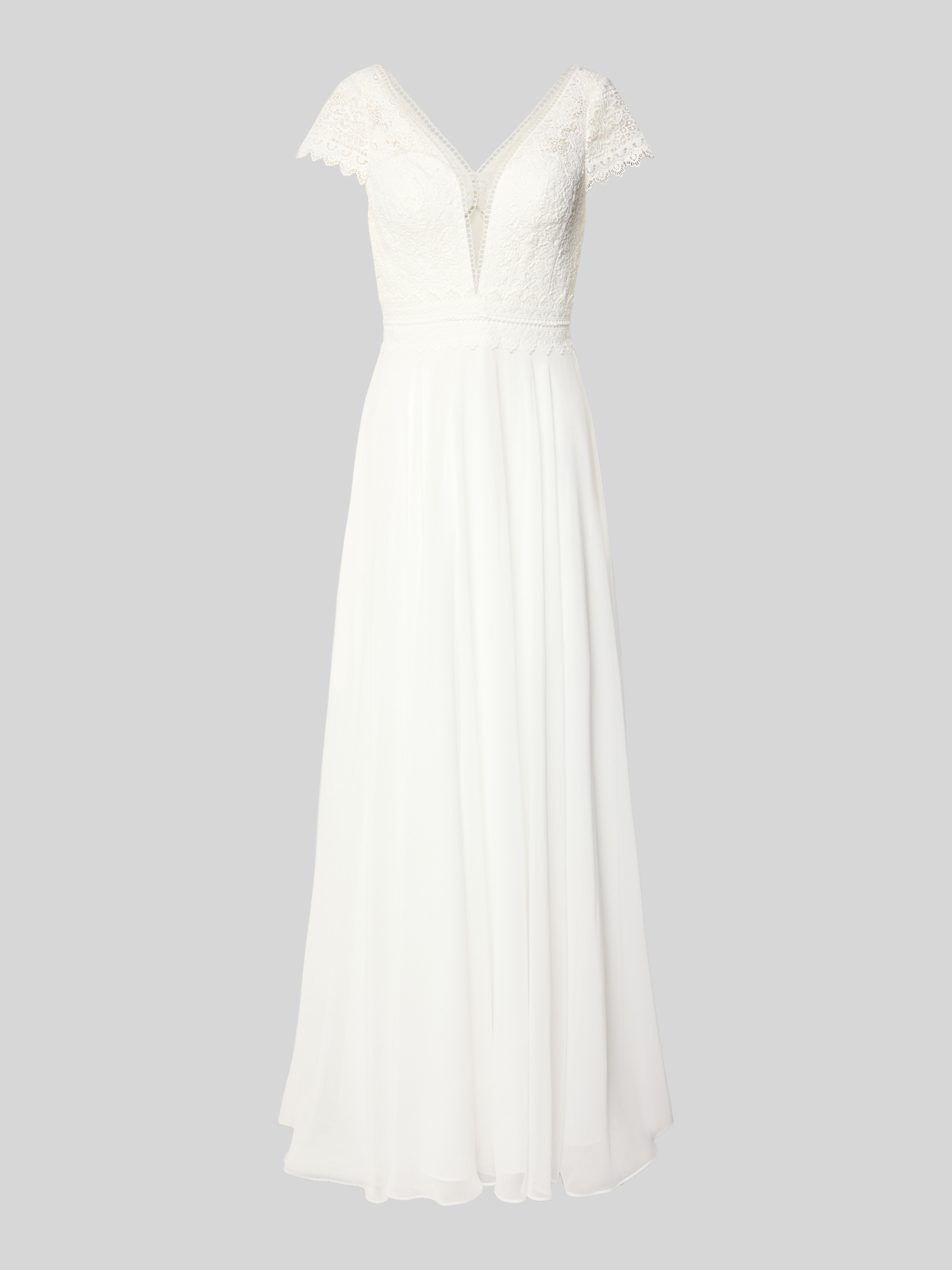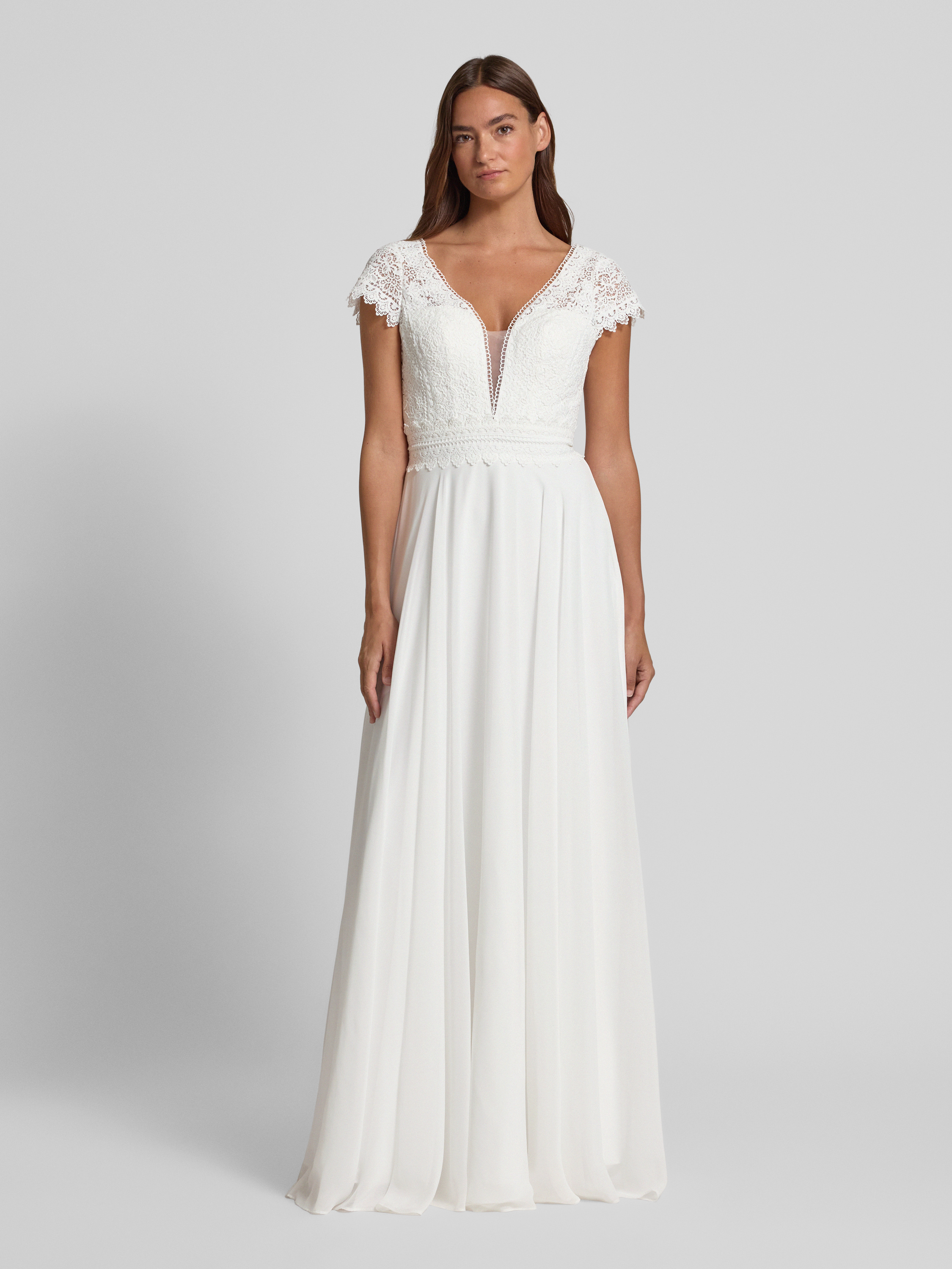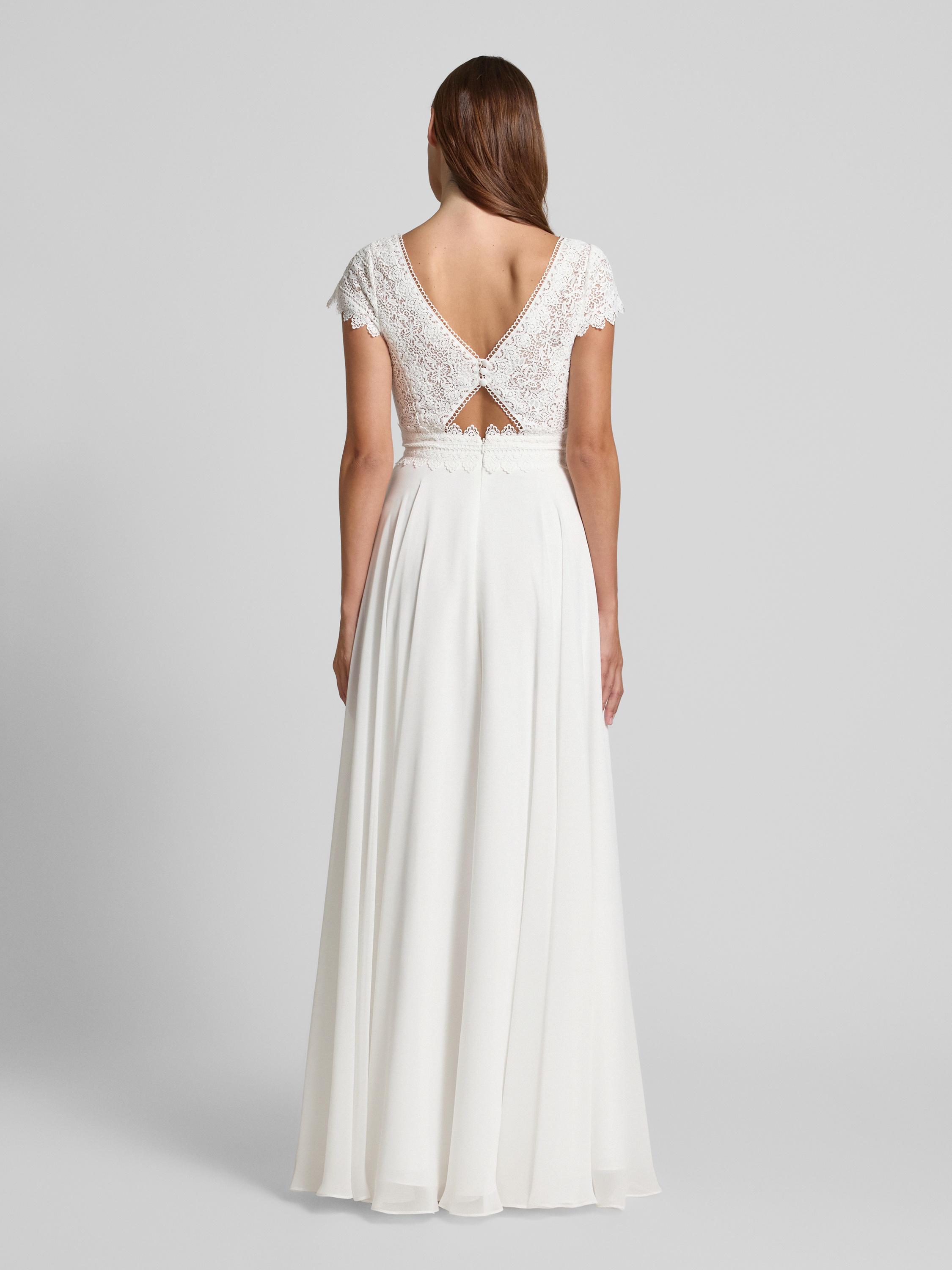 Das Brautkleid von Luxuar zeigt sich mit tailliertem Schnitt und betont die Figur auf dezente Weise, während der V-Ausschnitt eine feminine Silhouette unterstreicht. Auf der Rückseite sorgt ein Cut-Out mit Schlüsselloch-Ausschnitt für einen besonderen Akzent. So entsteht ein harmonisches Zusammenspiel aus eleganter Form und modernem Detail, das vielseitig einsetzbar ist.