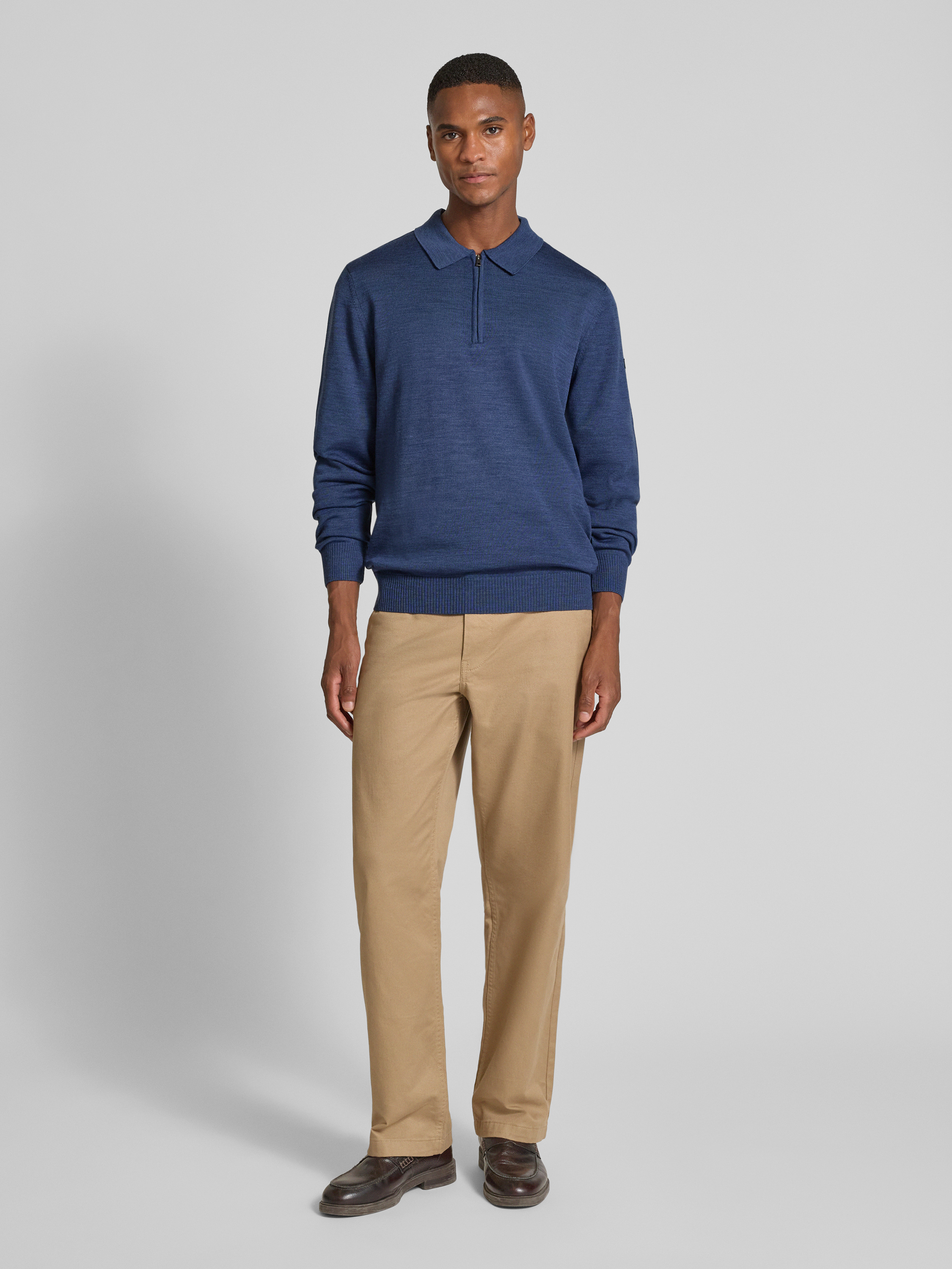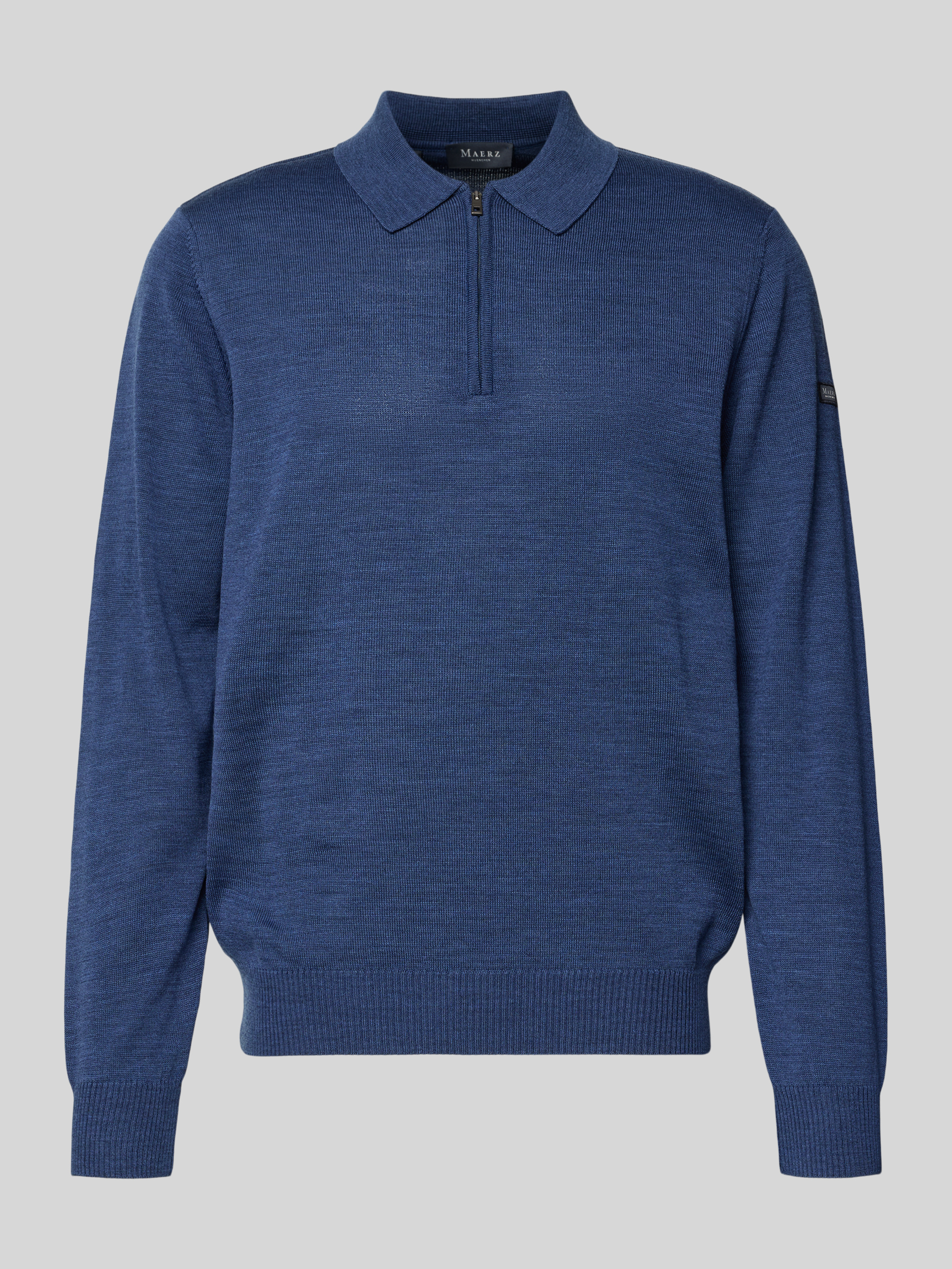 Der Herren-Strickpullover von MAERZ Muenchen aus reiner Merinowolle liegt angenehm weich auf der Haut und sorgt durch den lockeren Schnitt für ein entspanntes Tragegefühl. Ein Polokragen mit kurzem Zipper setzt dezente Akzente. Im Alltag ermöglicht das Material ein angenehmes Klima.