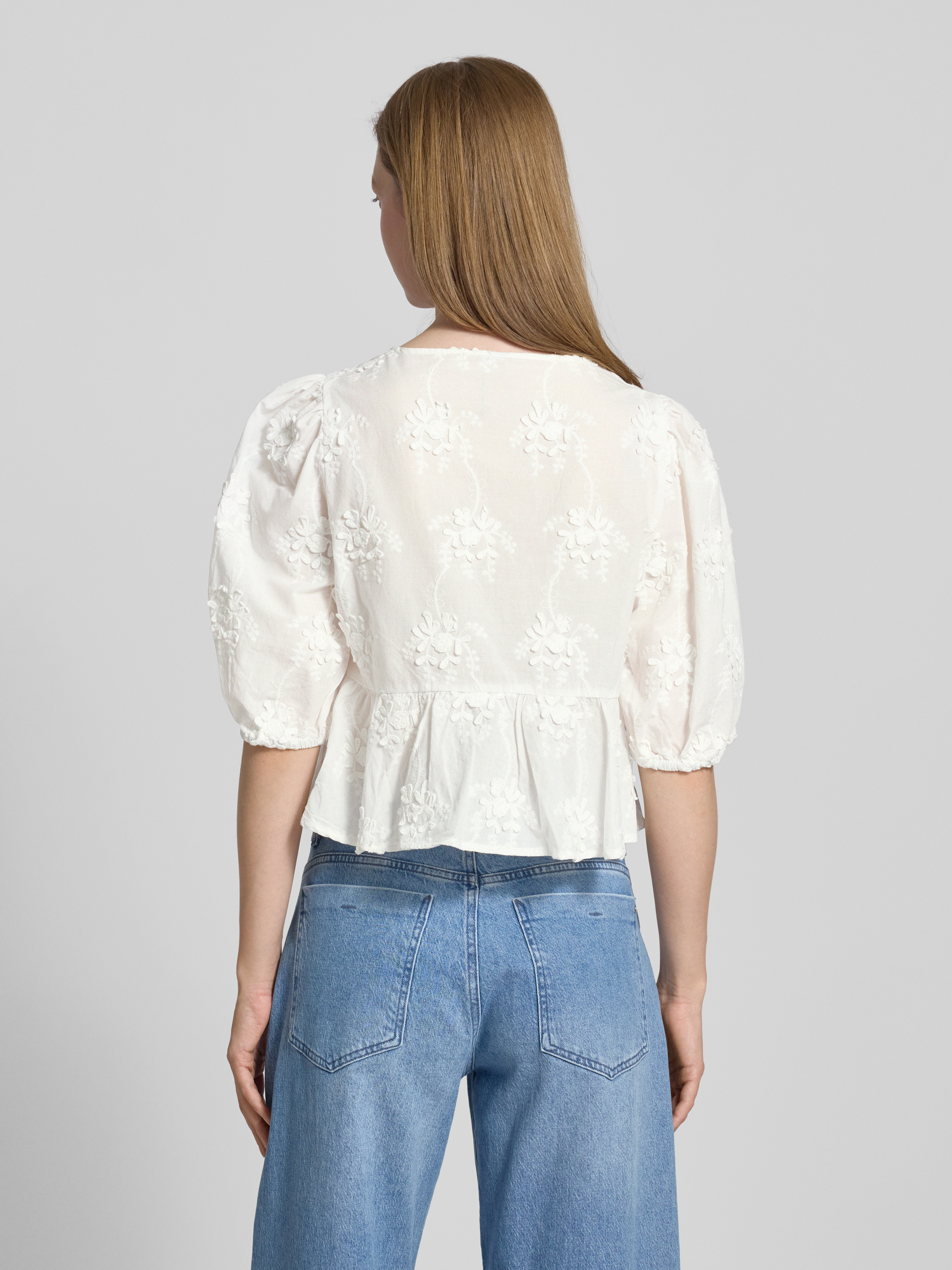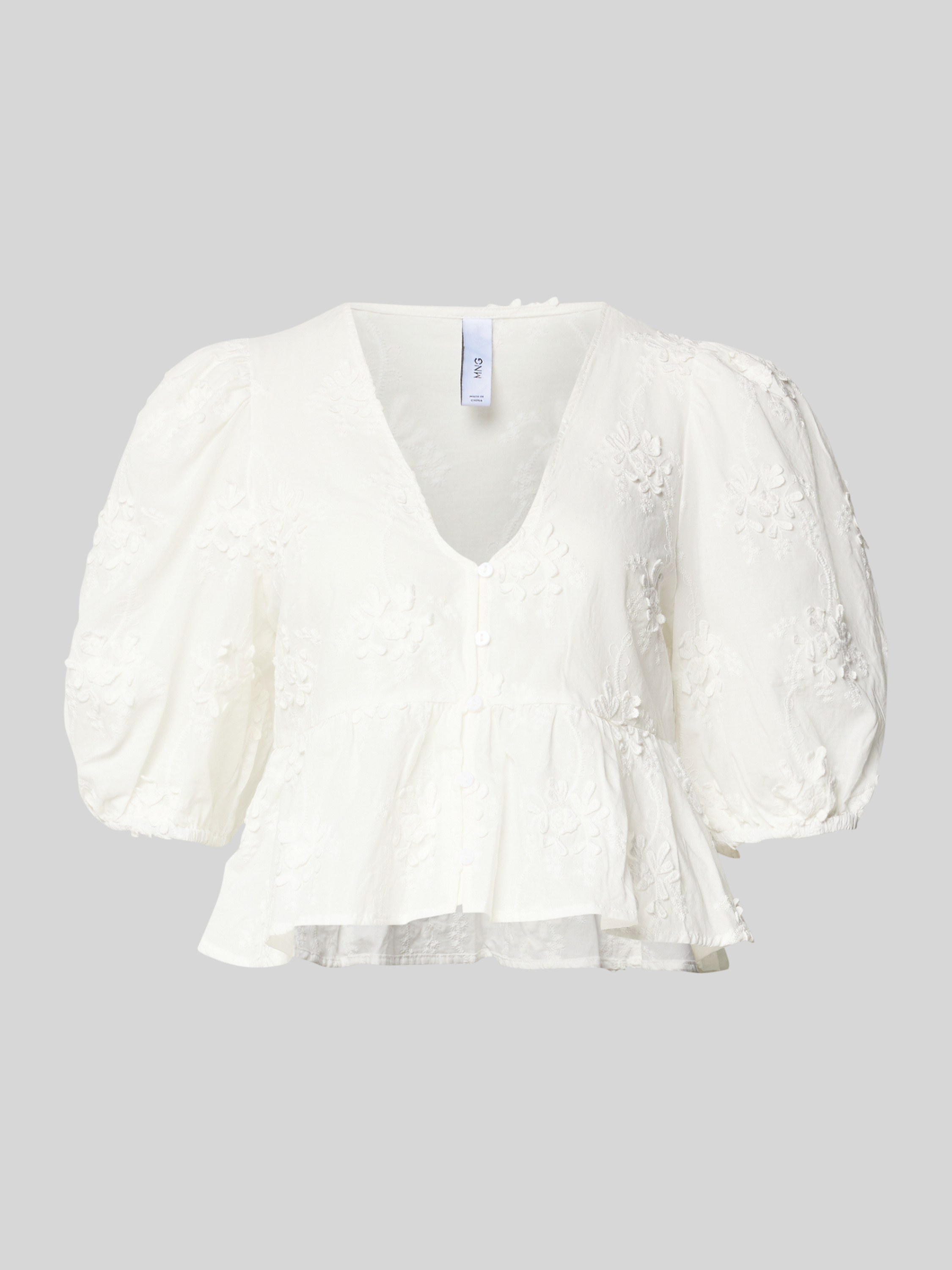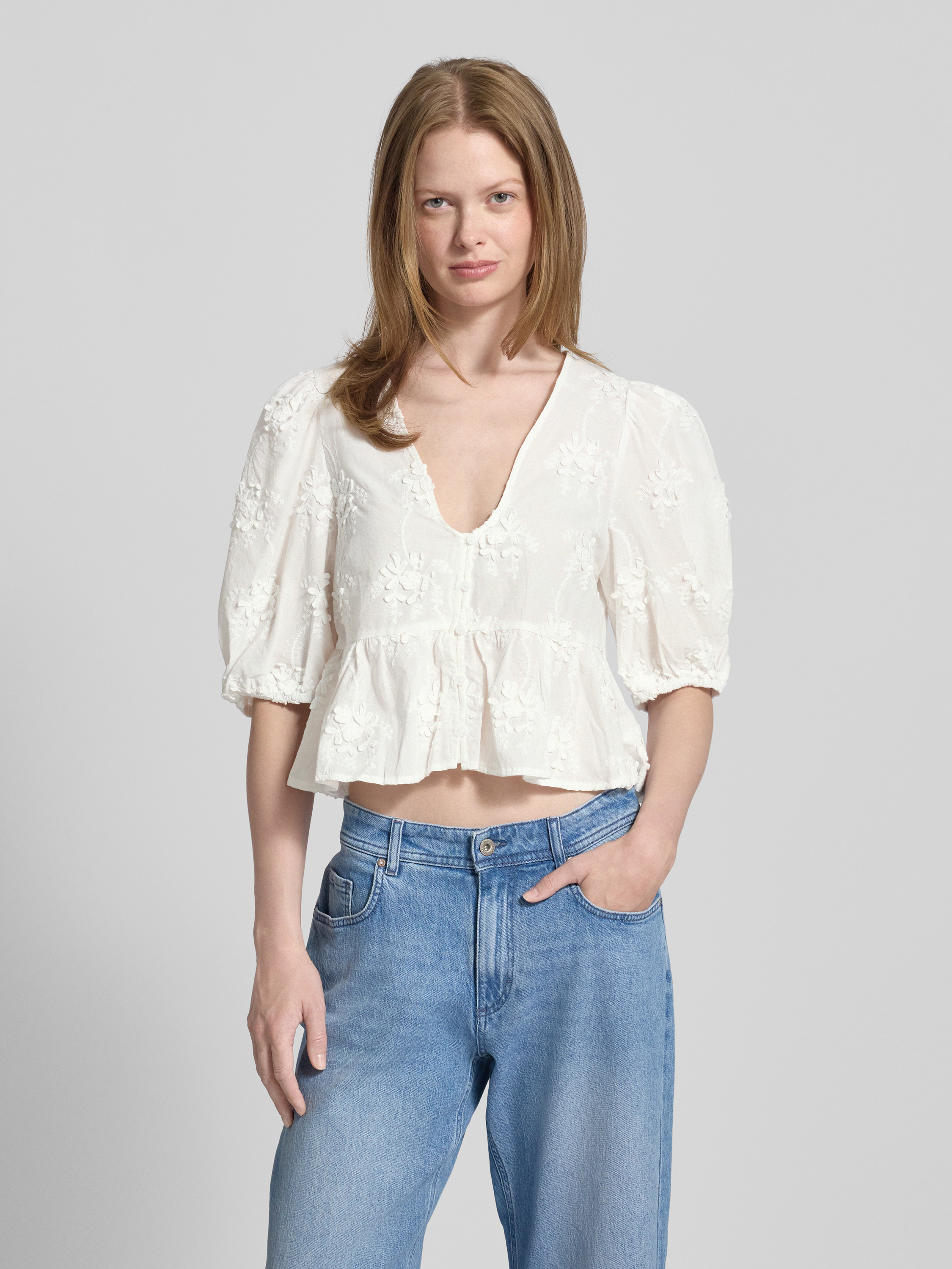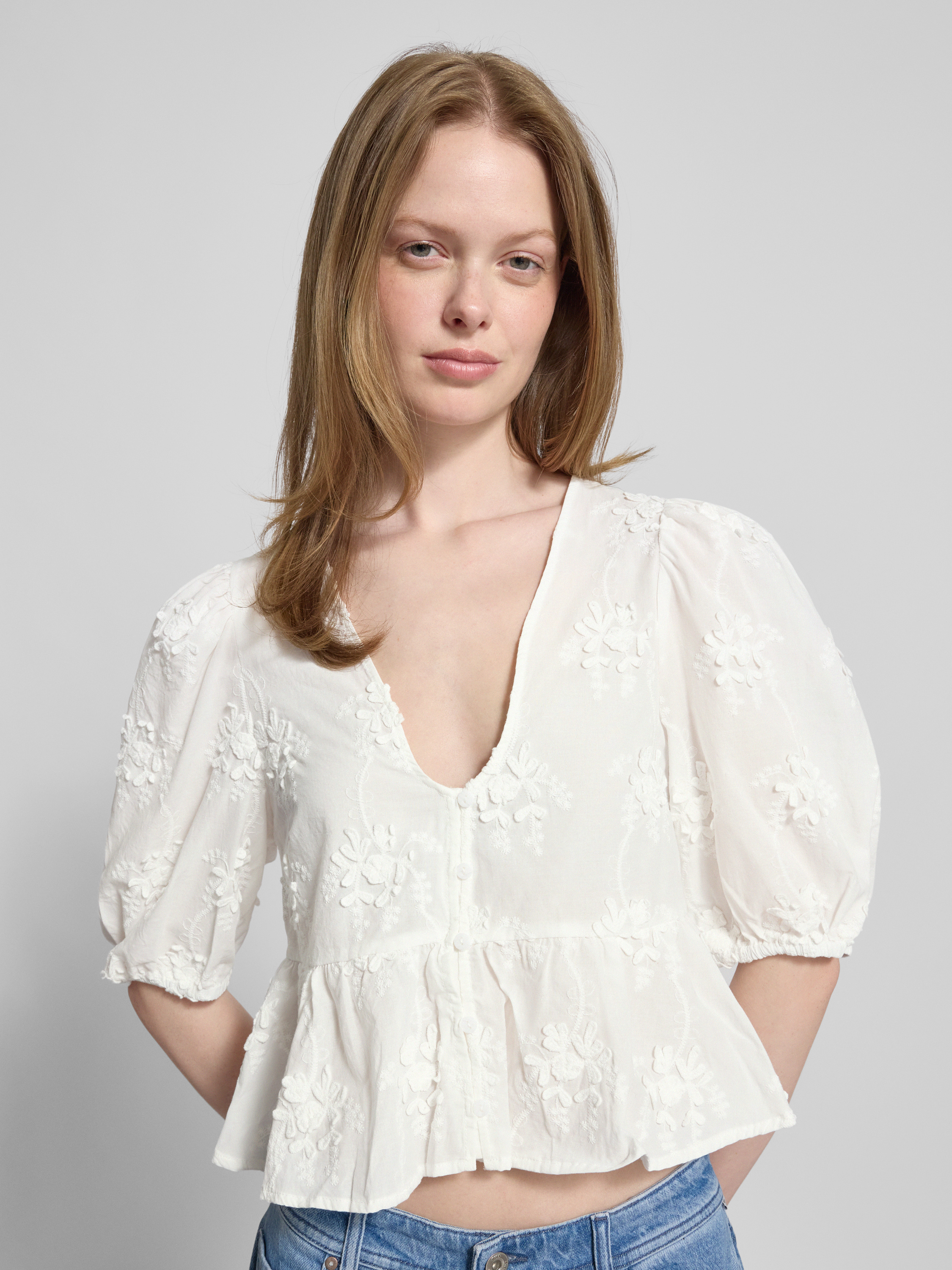 Das Cropped Blusenshirt von Mango aus reiner Baumwolle besticht durch seinen lockeren Schnitt, der sich angenehm trägt. Mit V-Ausschnitt und Zierbesatz setzt es stilvolle Akzente, während die ausgestellte Rockpartie eine leichte und luftige Silhouette schafft, ideal für warme Tage.