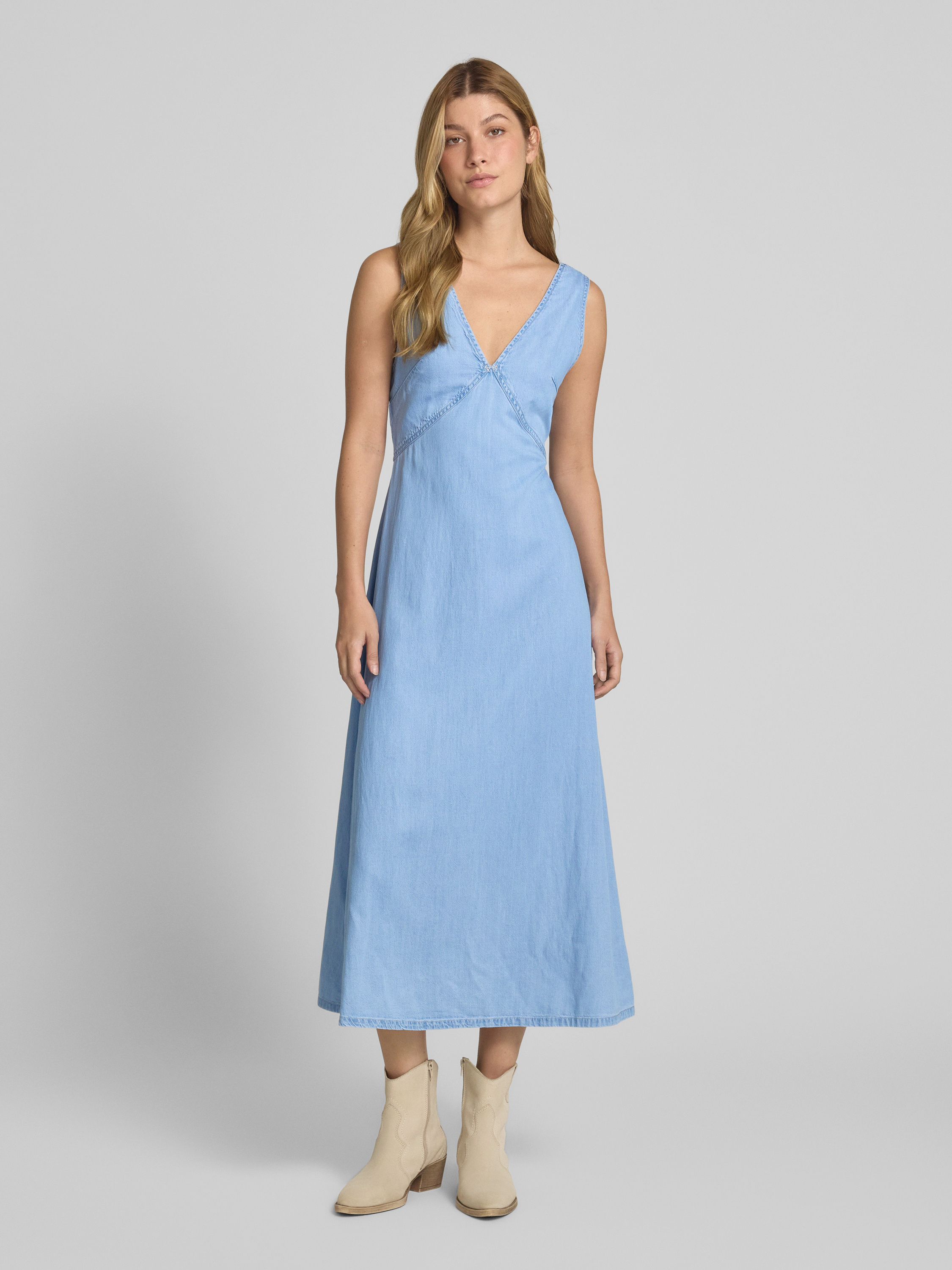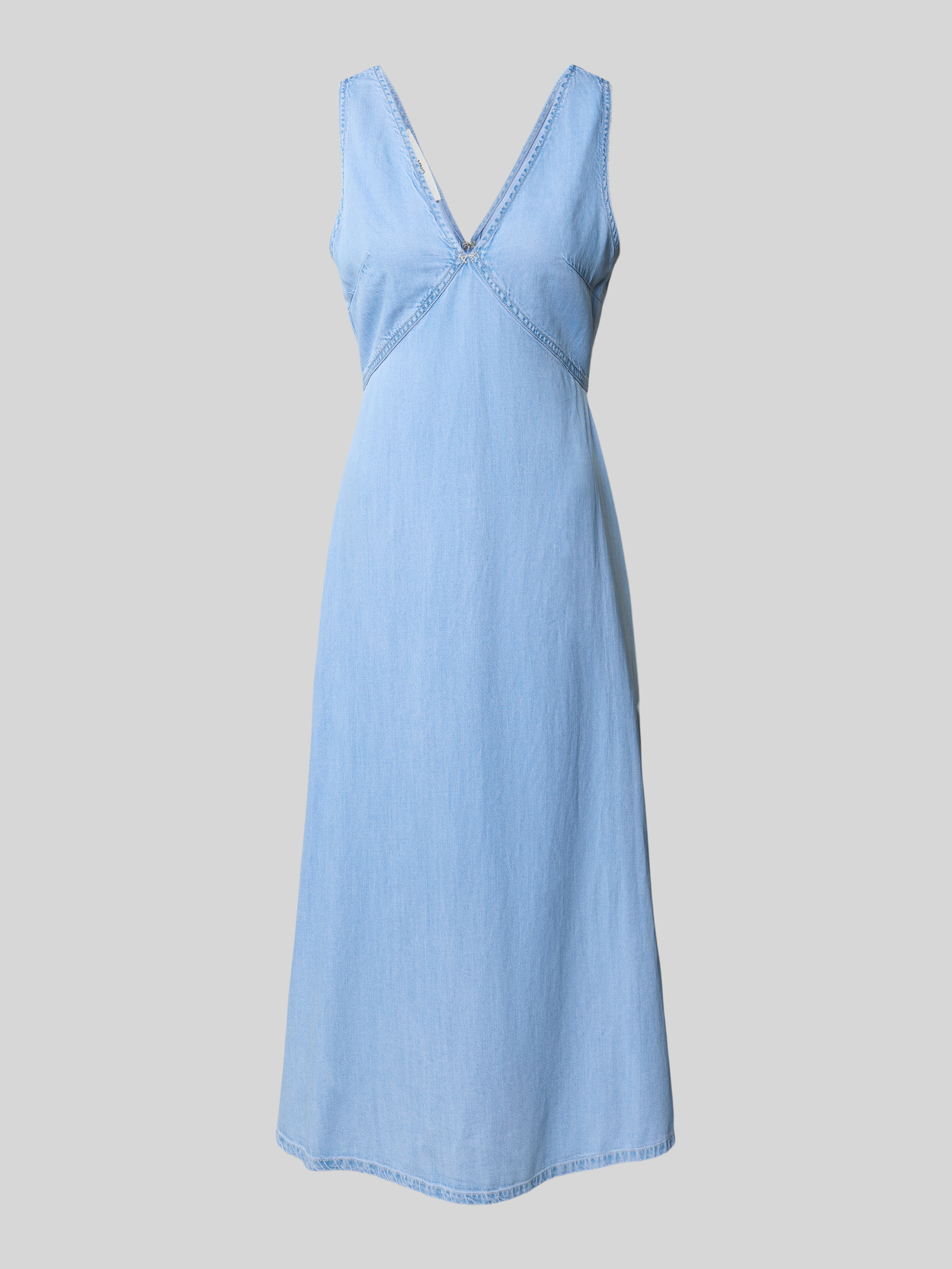 Das Jeanskleid von Mango, Modell 'SIROS', aus einem weichen Lyocell-Baumwoll-Mix, schmiegt sich dank des taillierten Schnitts harmonisch an die Silhouette. Der V-Ausschnitt verleiht dem Midikleid eine elegante Note, während der fließende Fall eine bequeme Bewegungsfreiheit ermöglicht.