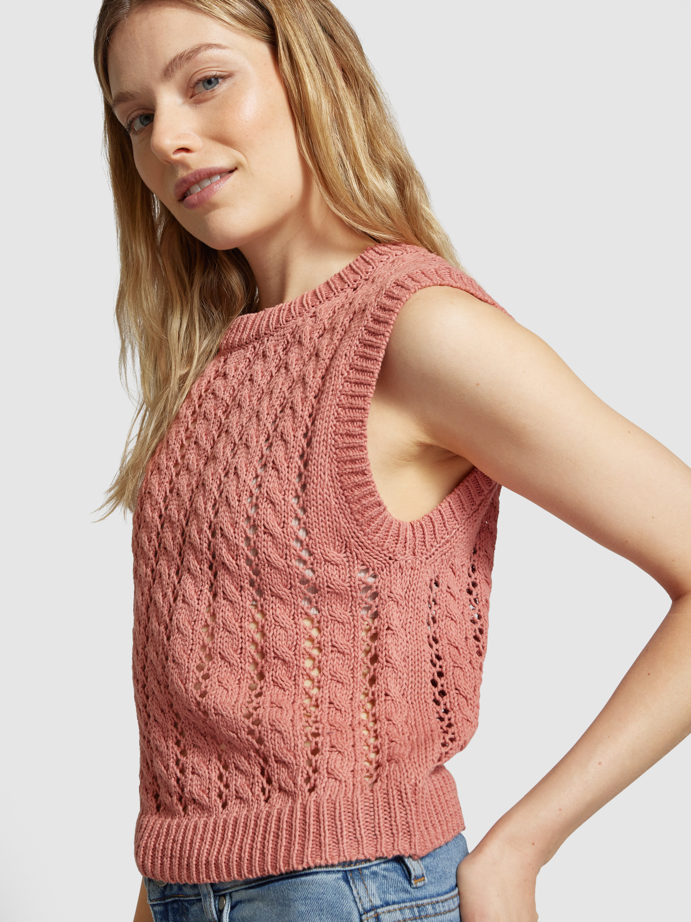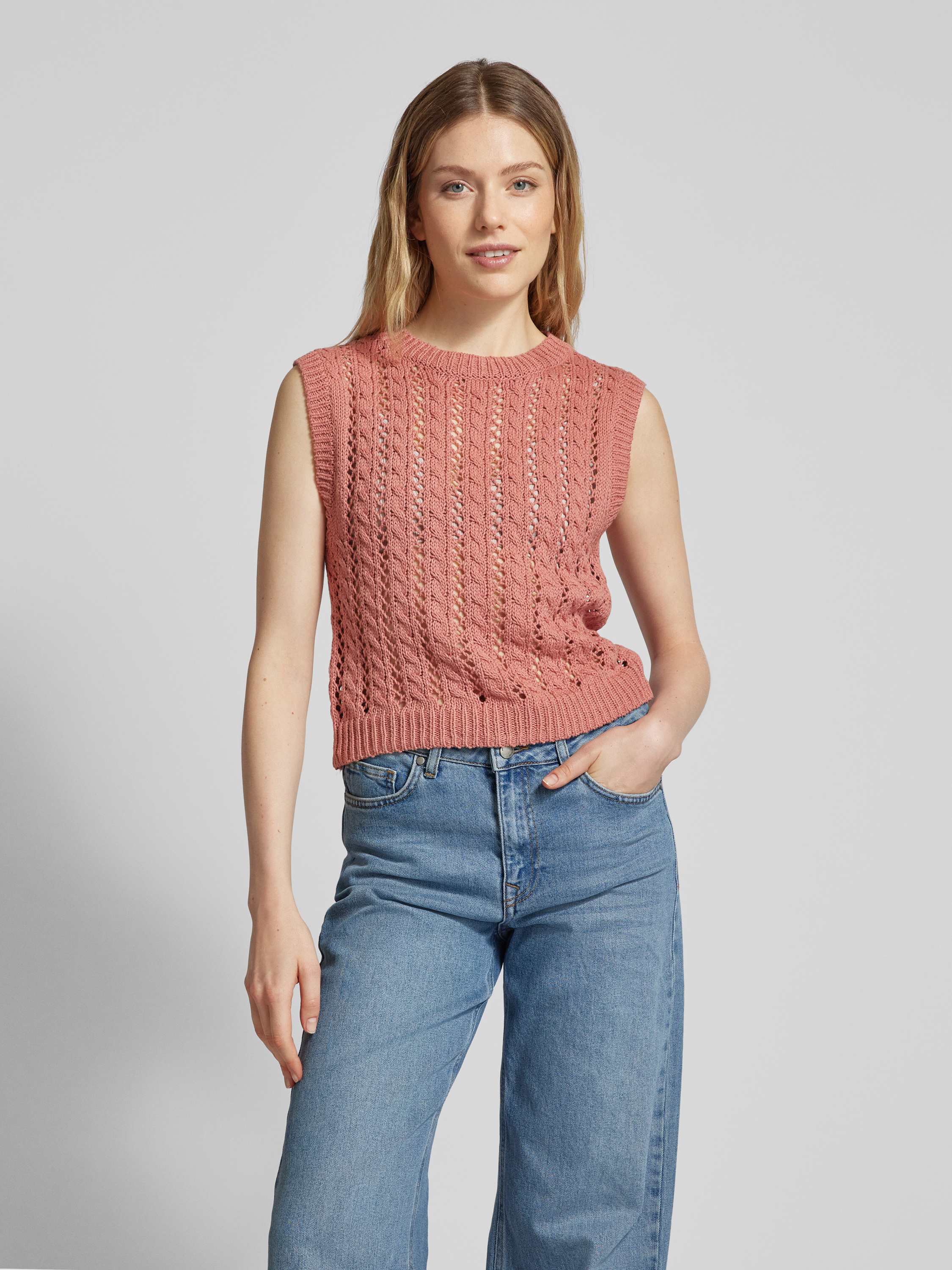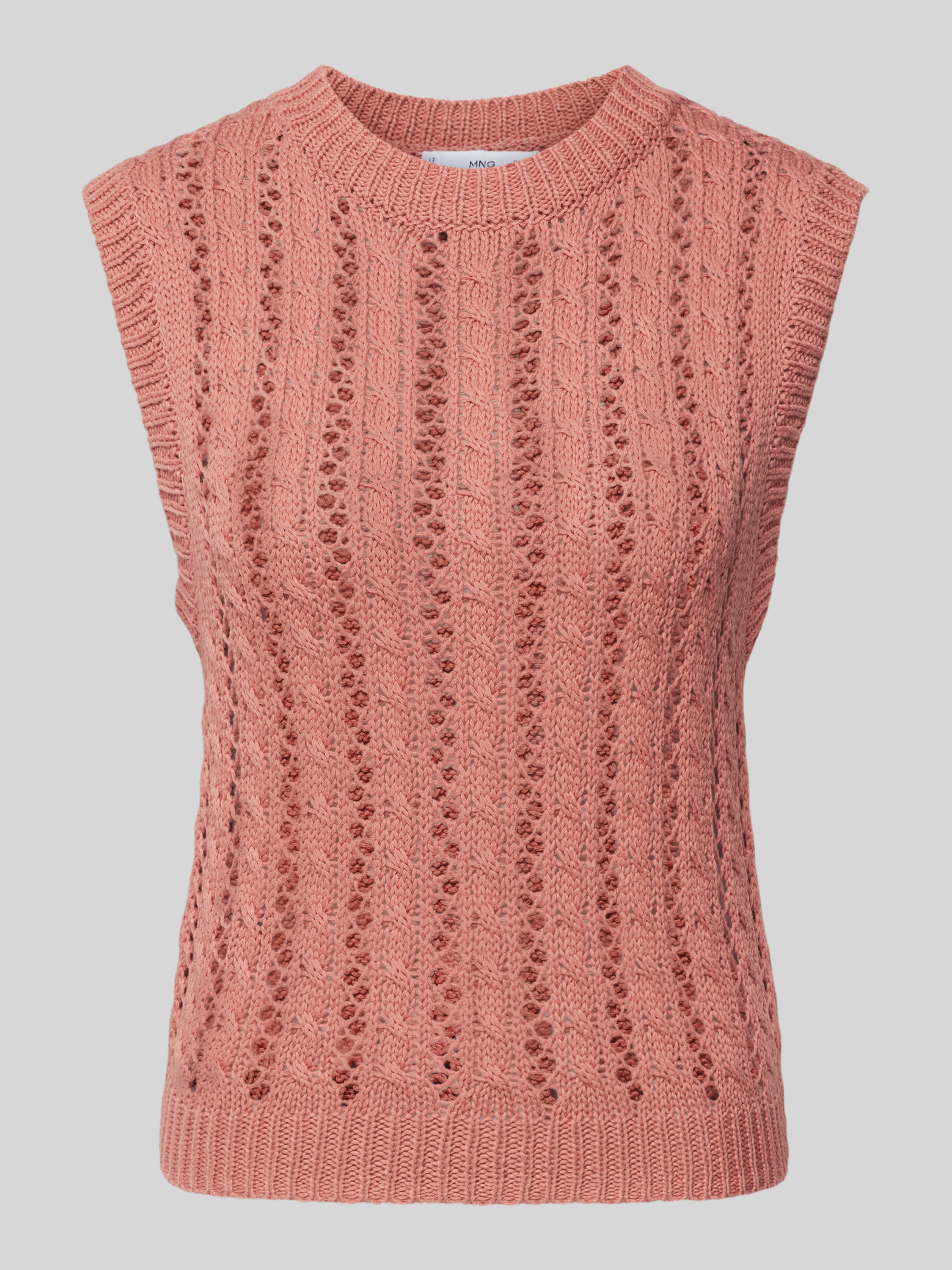 Das Stricktop mit Lochmuster von MANGO, Modell 'YUDI', bietet einen geraden Schnitt und einen angenehmen Rundhalsausschnitt, der sich ideal für den Alltag eignet. Durch sein luftiges Lochmuster wird eine leichte und komfortable Passform geschaffen, die Bewegungsfreiheit ermöglicht.