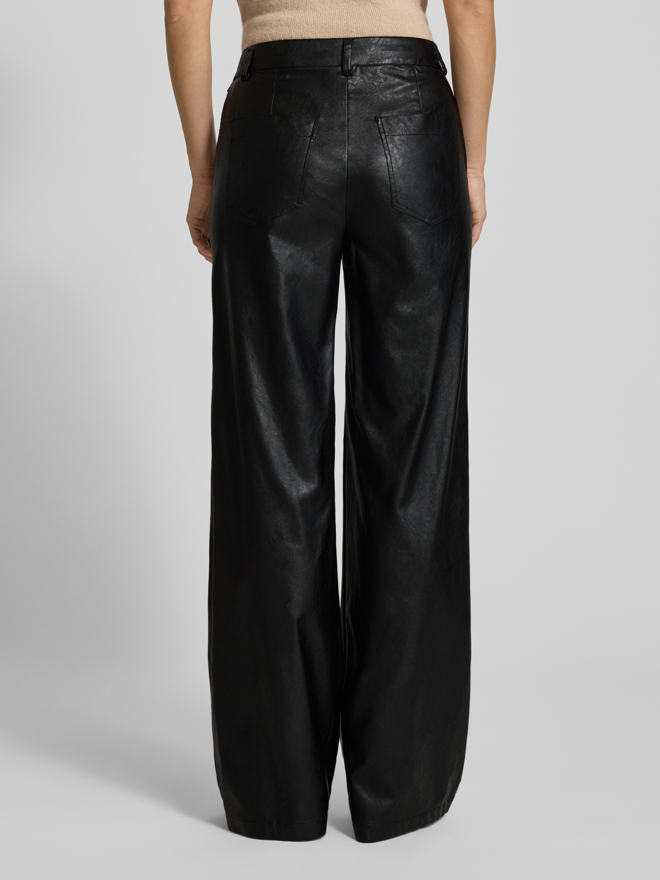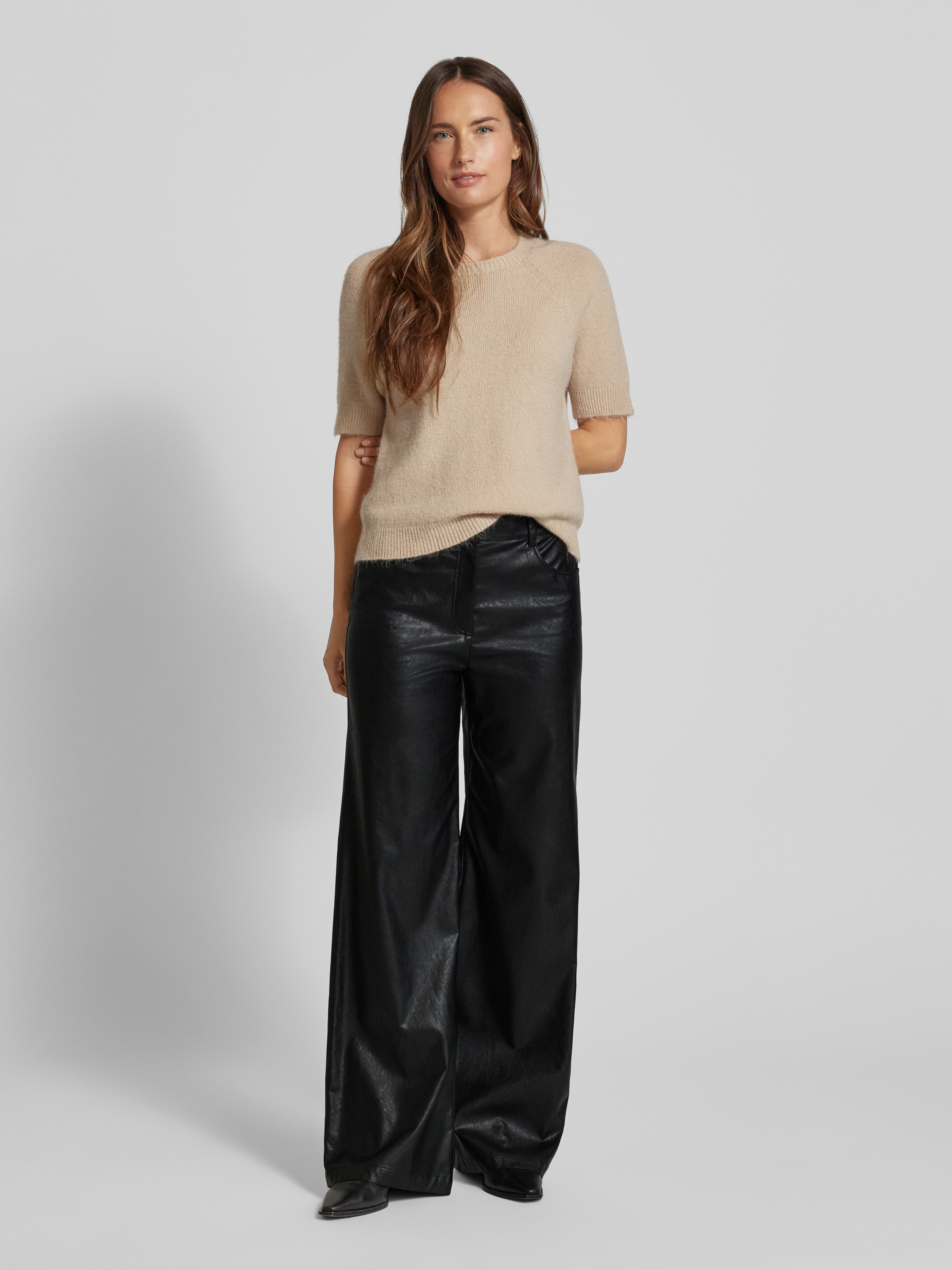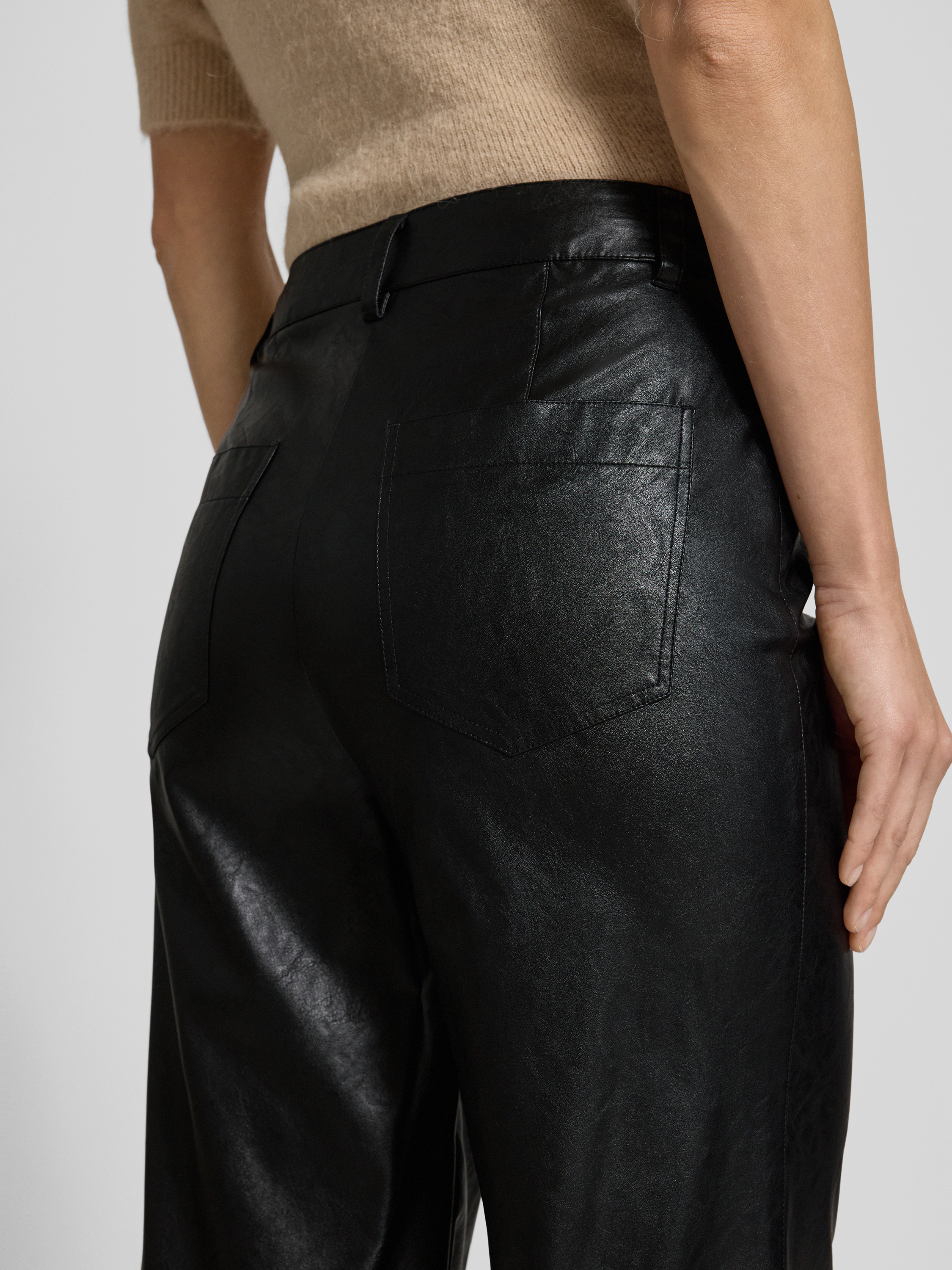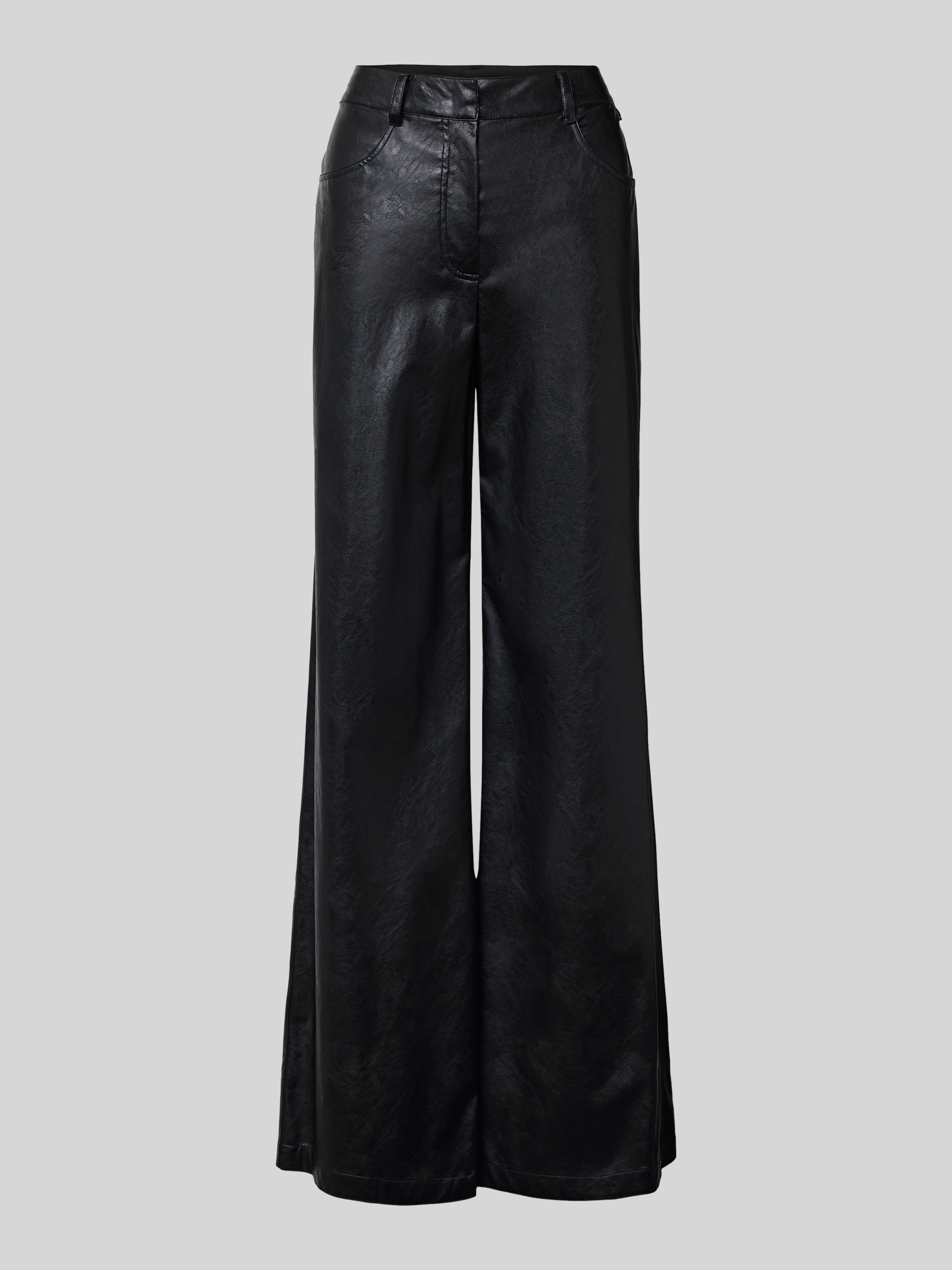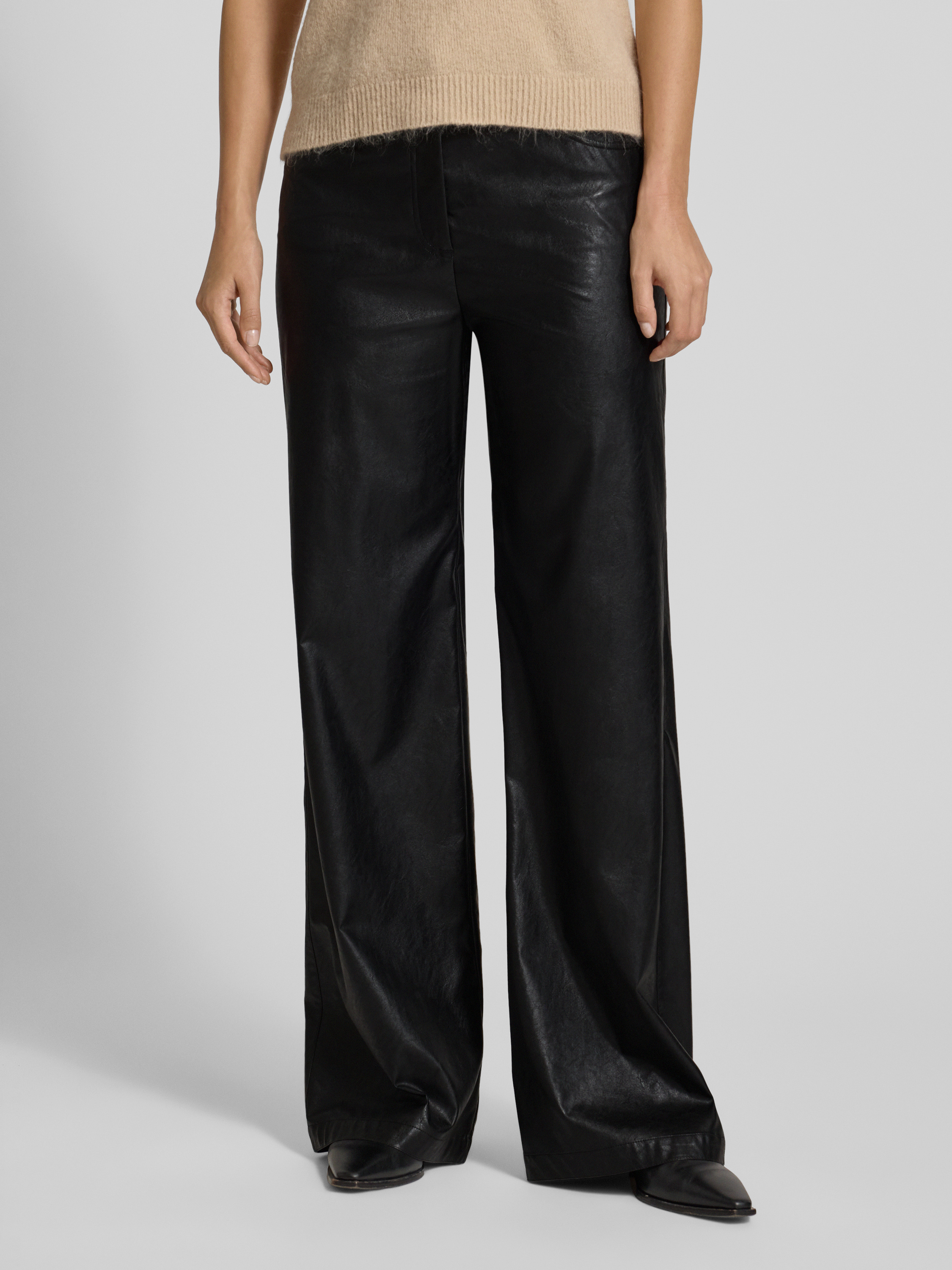 Die Hose von Marc Cain kombiniert einen modernen Wide Fit mit einer markanten High Waist, wodurch sie Bewegungsfreiheit und eine lässige Silhouette ermöglicht. Dank des geschmeidigen Viskose-Mix erhält das Modell eine angenehme Haptik. Die Leder-Optik verleiht dem Look einen urbanen Akzent.