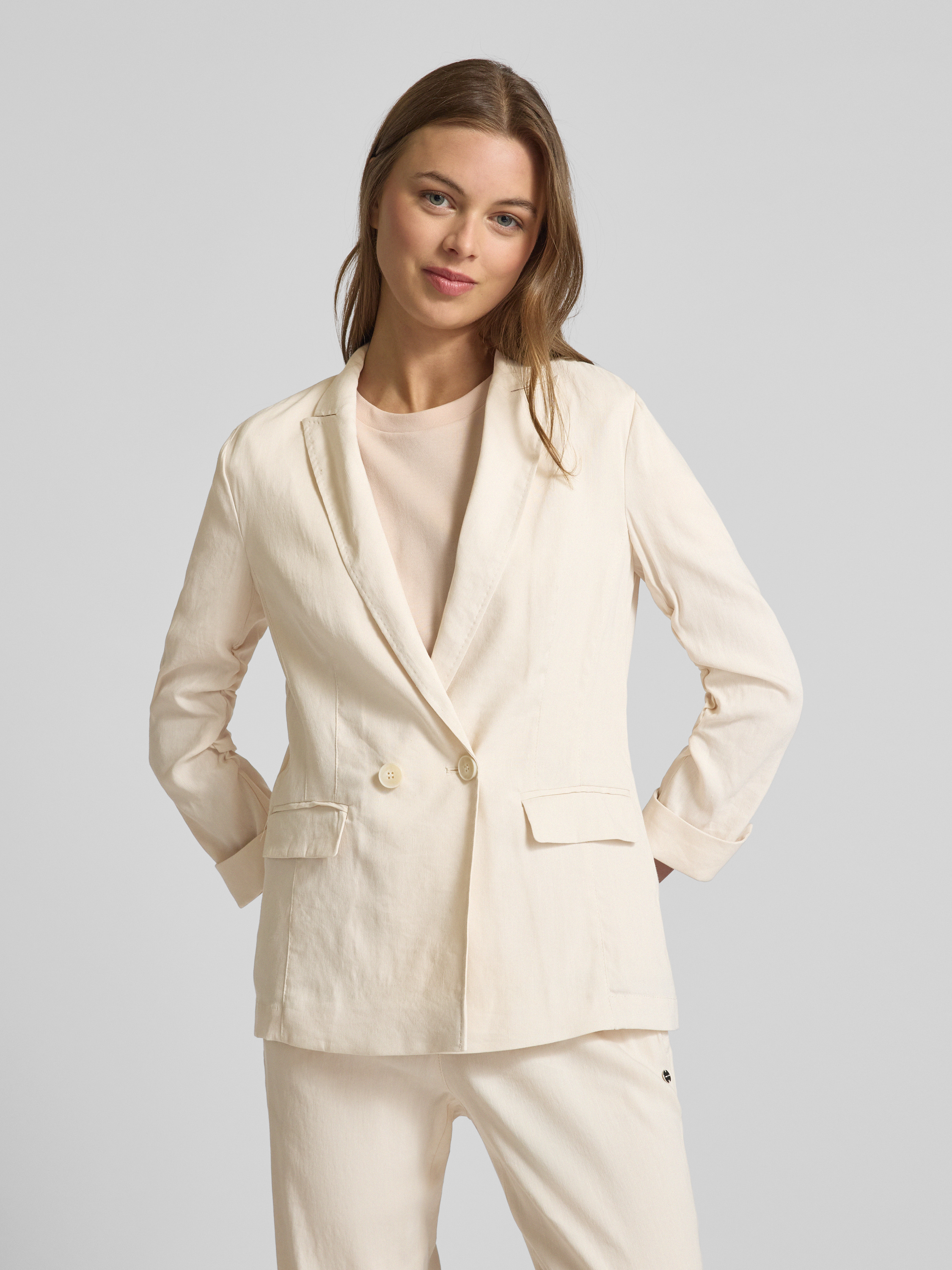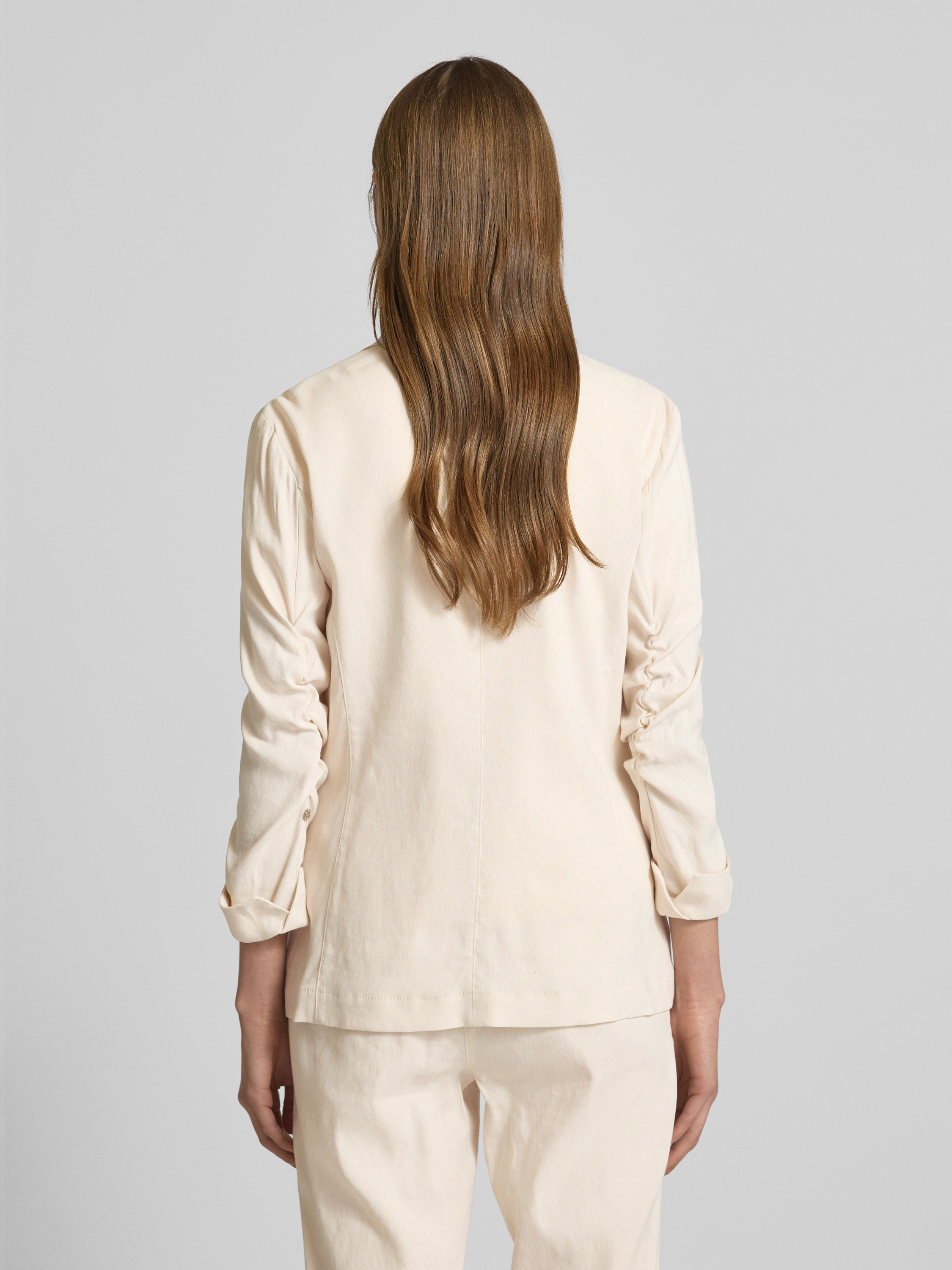Der Leinenblazer von Marc Cain vereint einen leichten, taillierten Schnitt mit einem eleganten Reverskragen, wodurch er sich ideal für verschiedene Anlässe eignet. Durch den Leinen-Viskose-Mix mit Stretch-Anteil bleibt der Tragekomfort erhalten. Raffungen an den Ärmeln verleihen dem Design eine besondere Note.