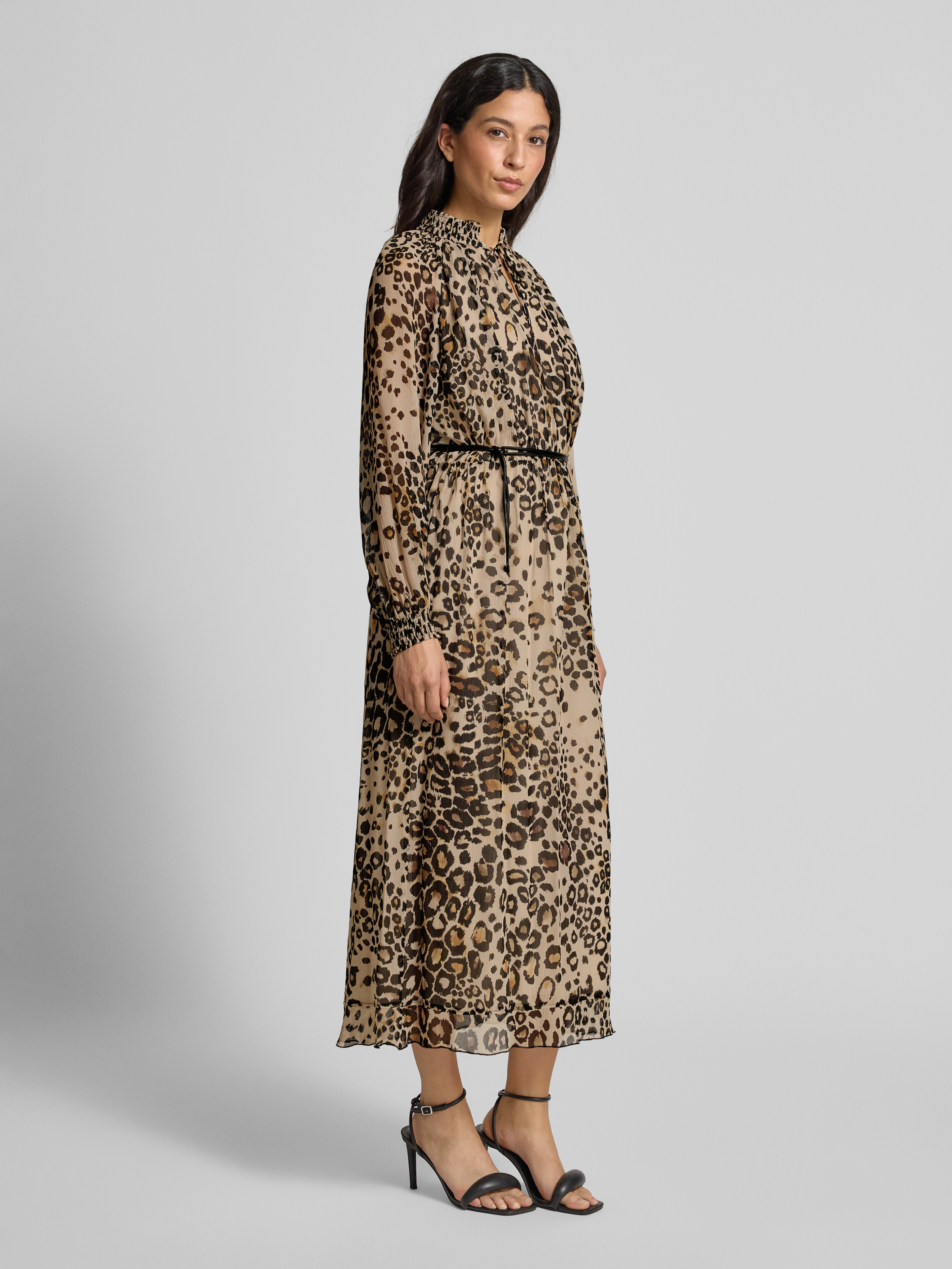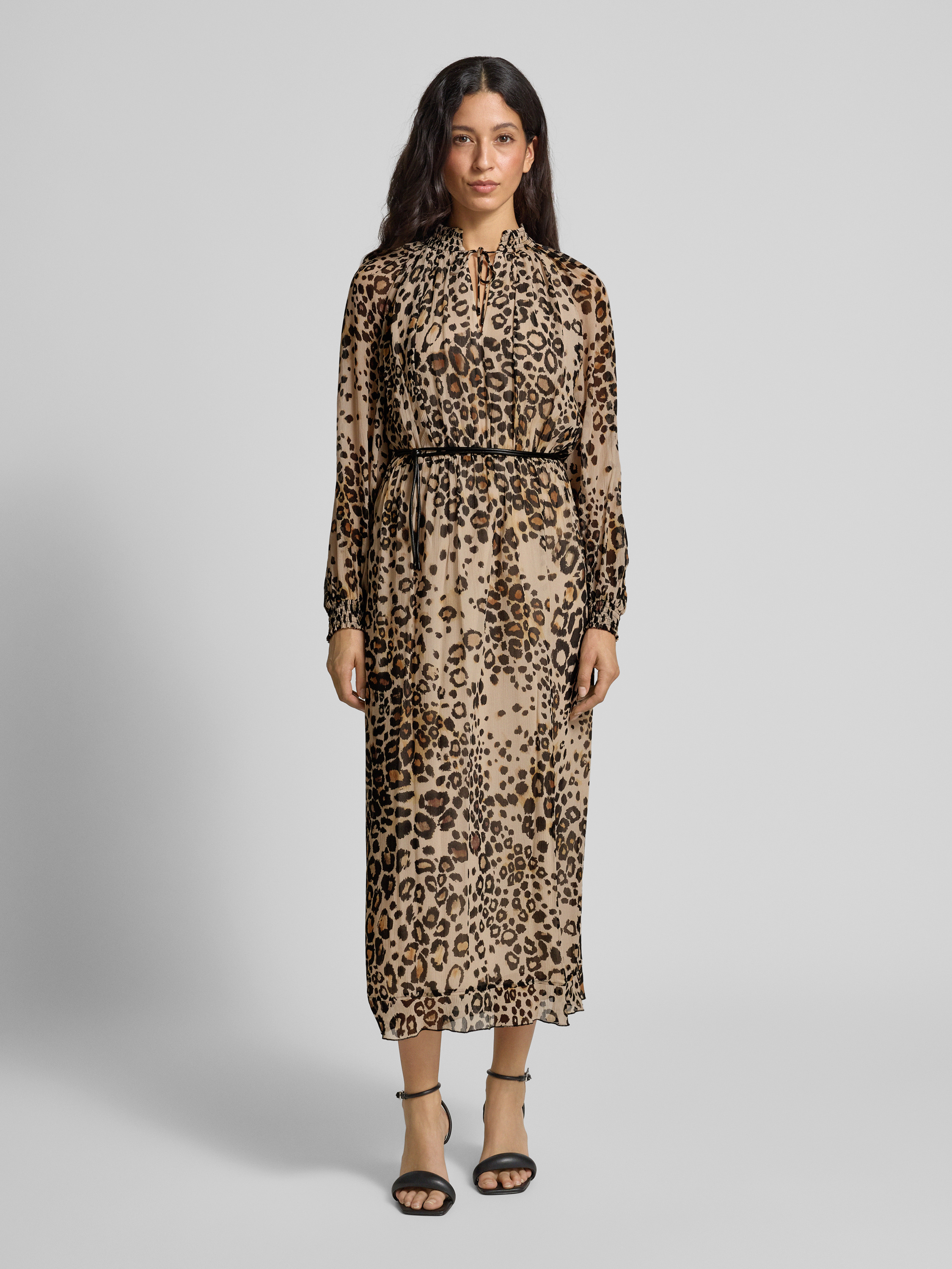 Das Midikleid von Marc Cain fällt durch seine taillierte Silhouette und den fließenden Stoff angenehm auf. Ein Stehkragen mit Schlüsselloch-Ausschnitt und Smok-Details an den Ärmeln sorgen für feine Akzente, während das Taillenband die Passform individuell reguliert. Durch den blickdichten Unterrock bleibt das Kleid alltagstauglich.