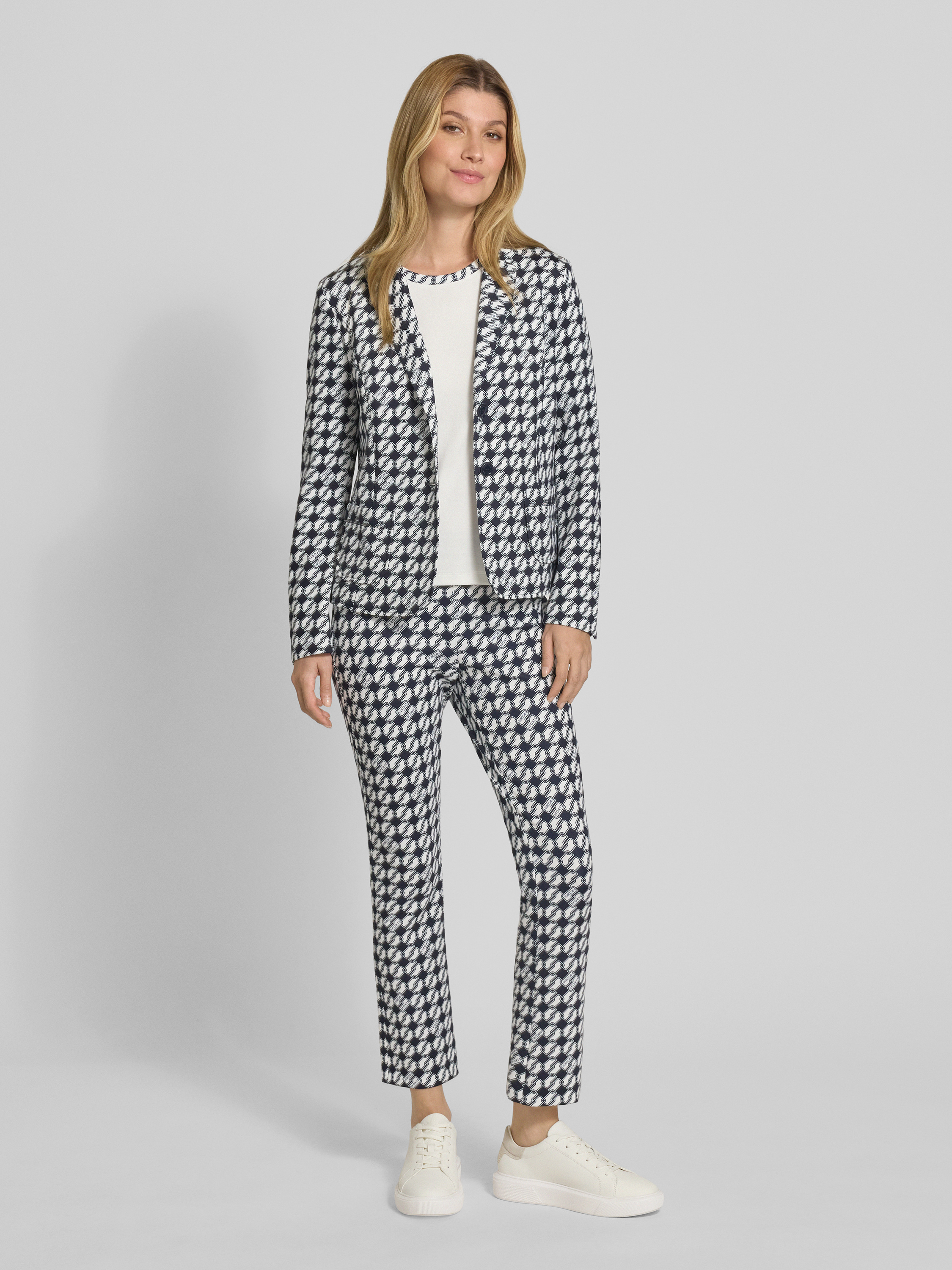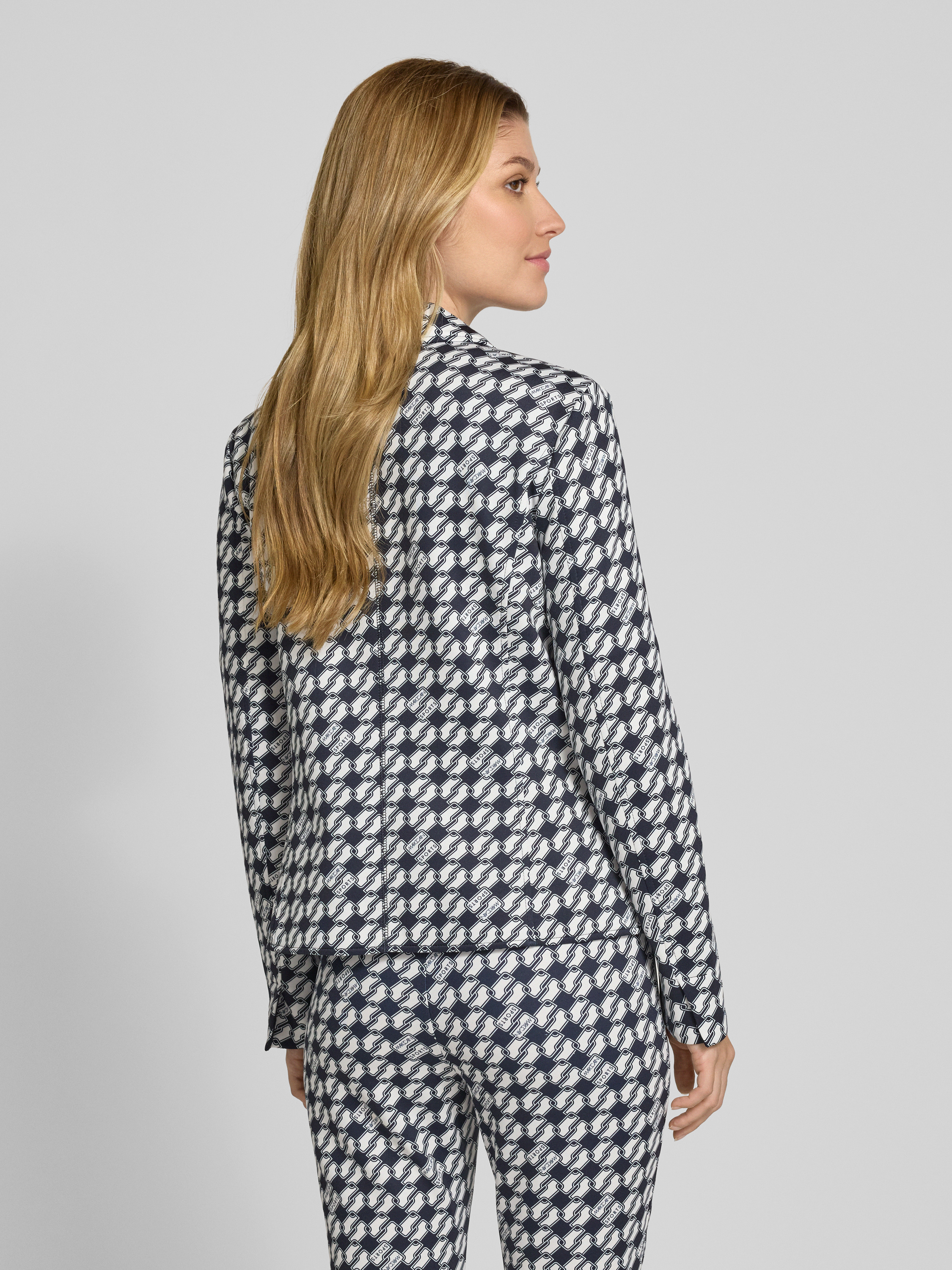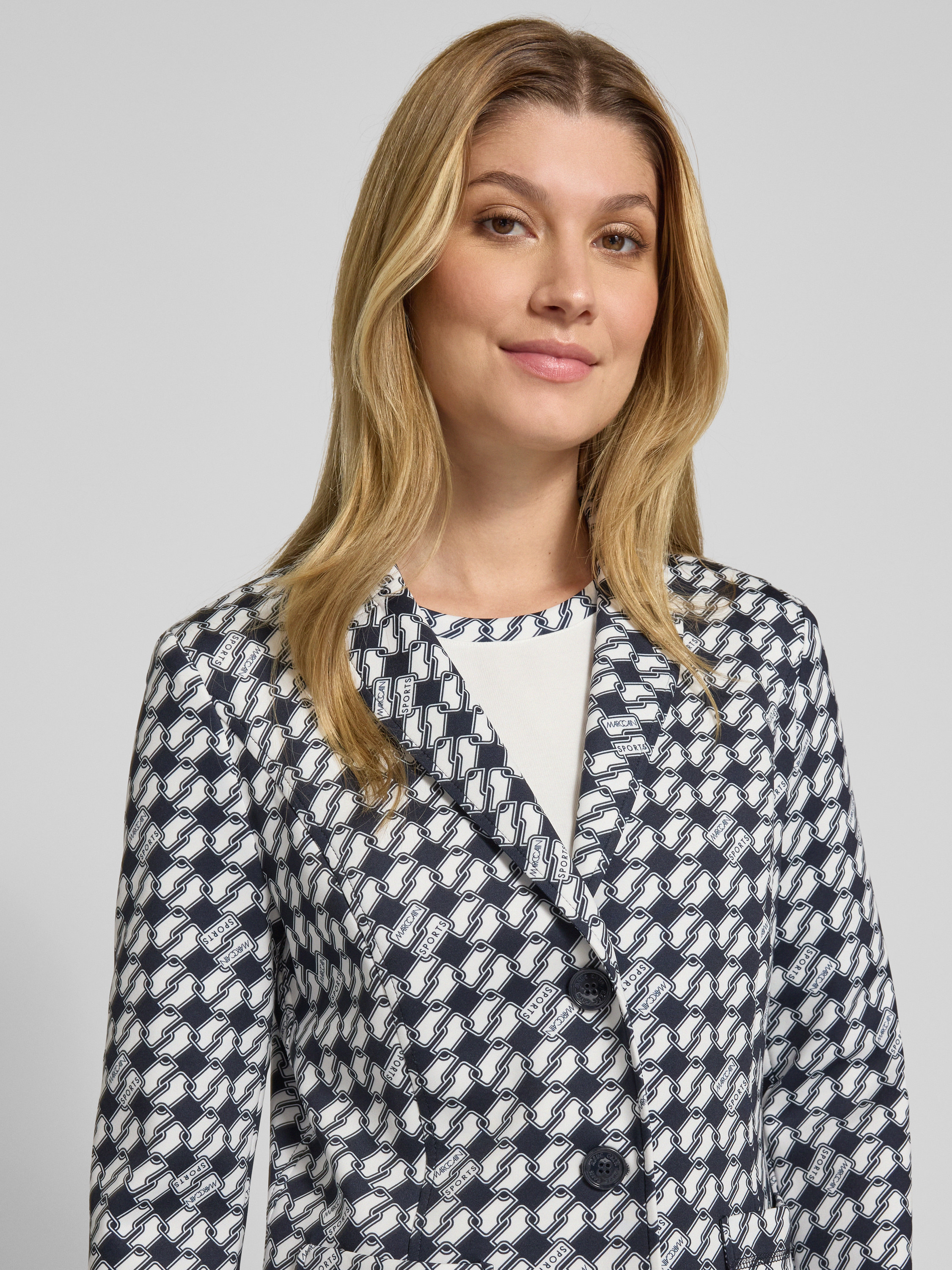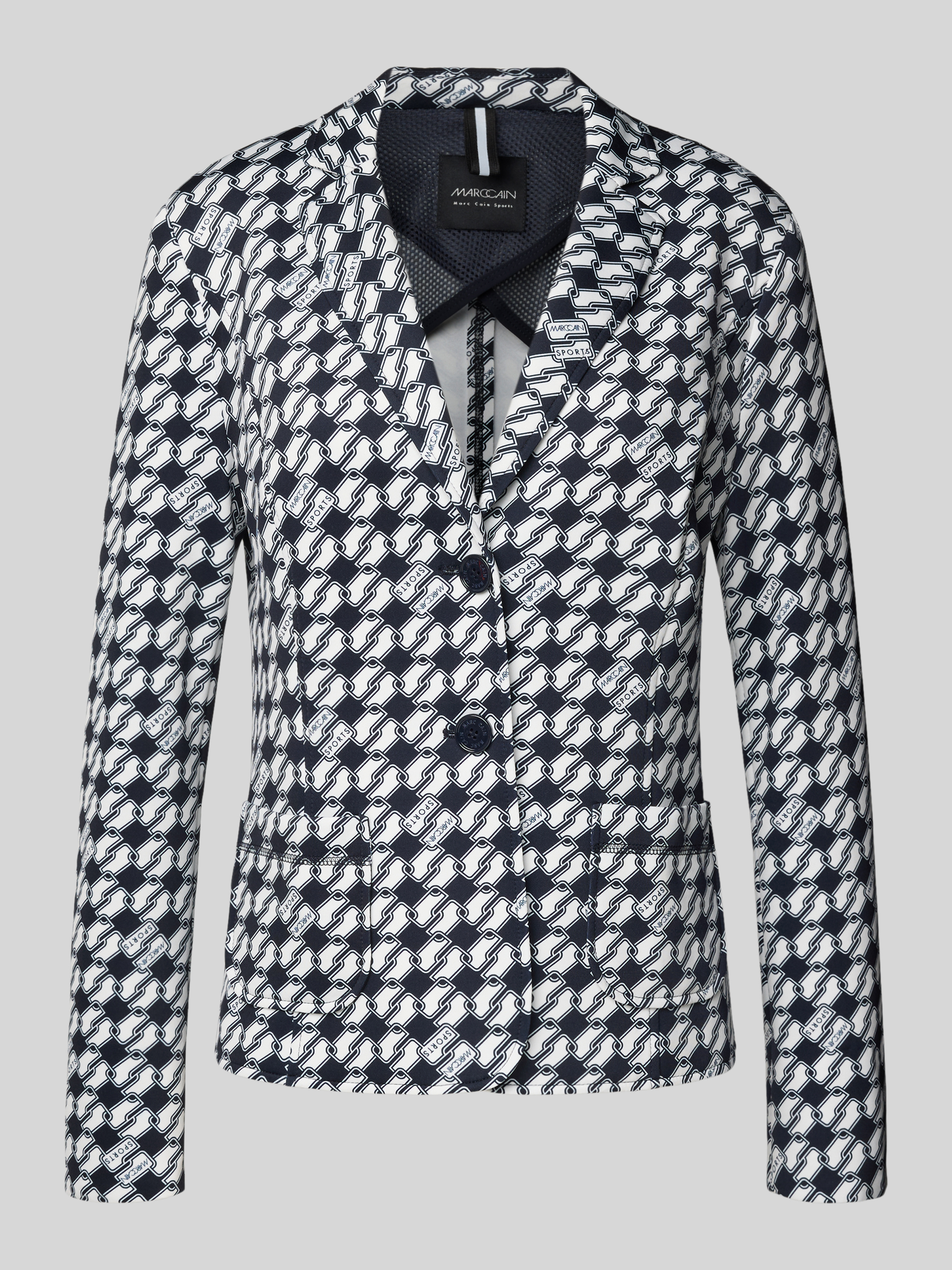 Der Slim Fit Blazer von Marc Cain kombiniert einen eleganten Reverskragen mit einem elastischen Material-Mix, der eine bequeme Passform ermöglicht. Eingrifftaschen bieten praktischen Stauraum, während das subtile Logo-Print-Design dem Blazer eine dezente Note verleiht. Ideal für vielseitige Styling-Möglichkeiten.