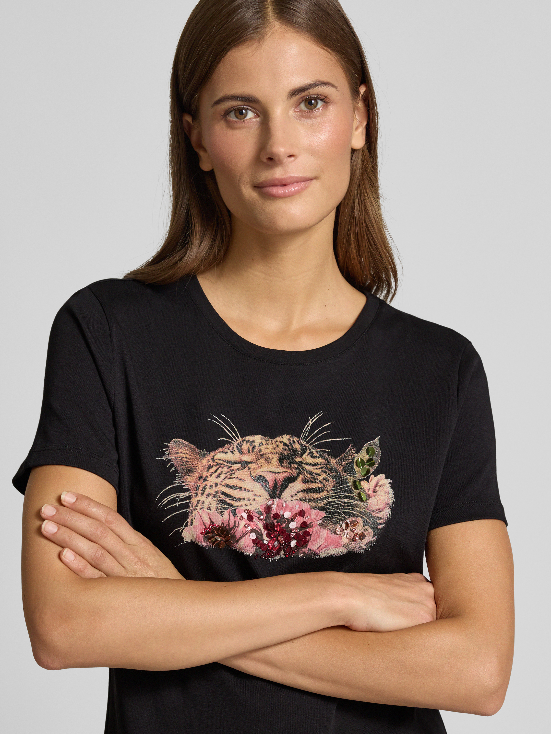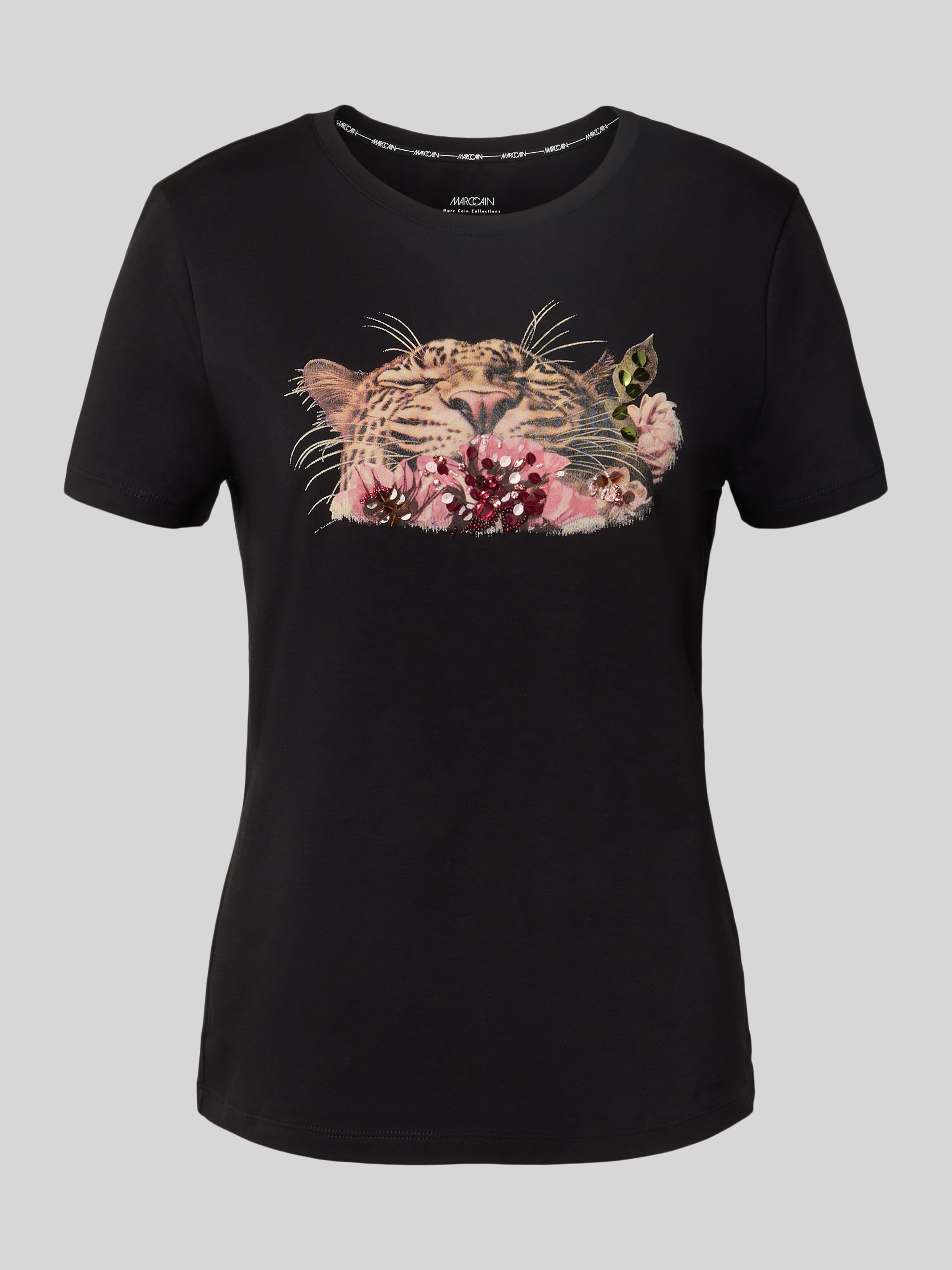 Das Damen T-Shirt von Marc Cain aus reiner Baumwolle schmiegt sich durch seine körpernahe Passform angenehm an und sorgt für ein leichtes Tragegefühl. Der klassische Rundhalsausschnitt harmoniert mit dem auffälligen Motiv-Print, der dem Look eine individuelle Note verleiht. So entsteht ein vielseitiges Kleidungsstück, das sich unkompliziert kombinieren lässt und im Alltag Komfort verspricht.