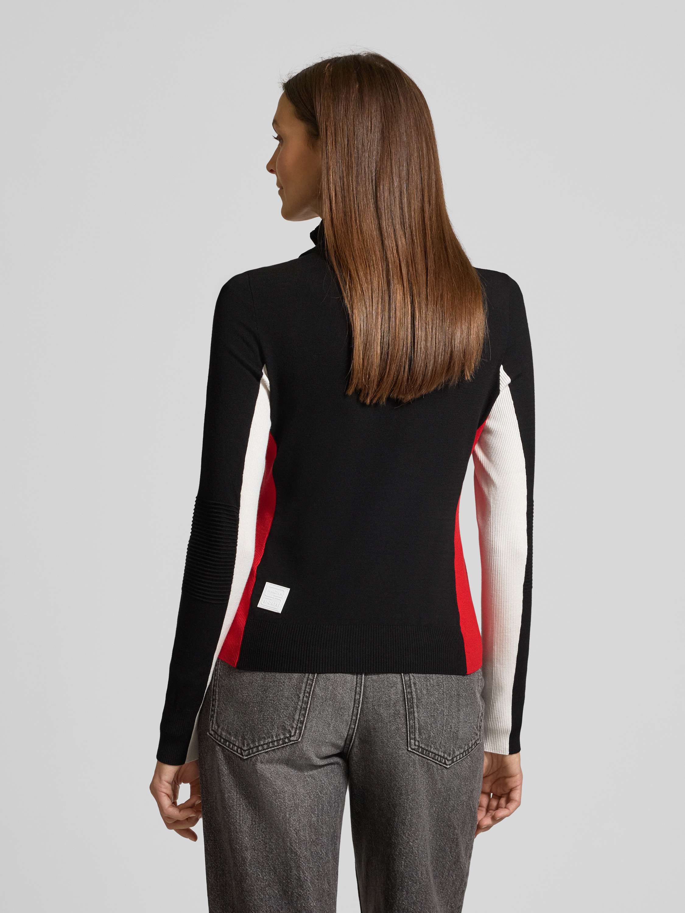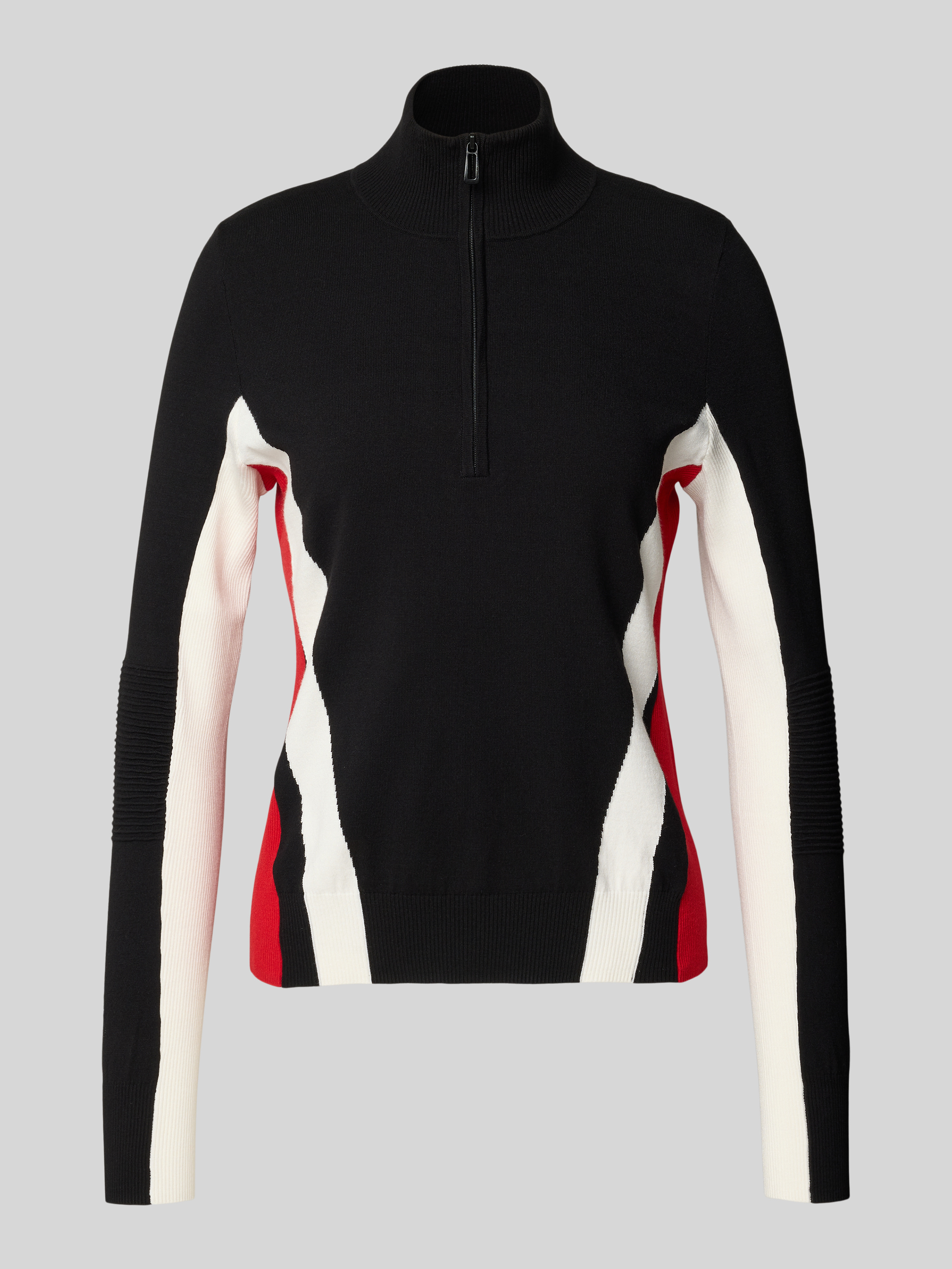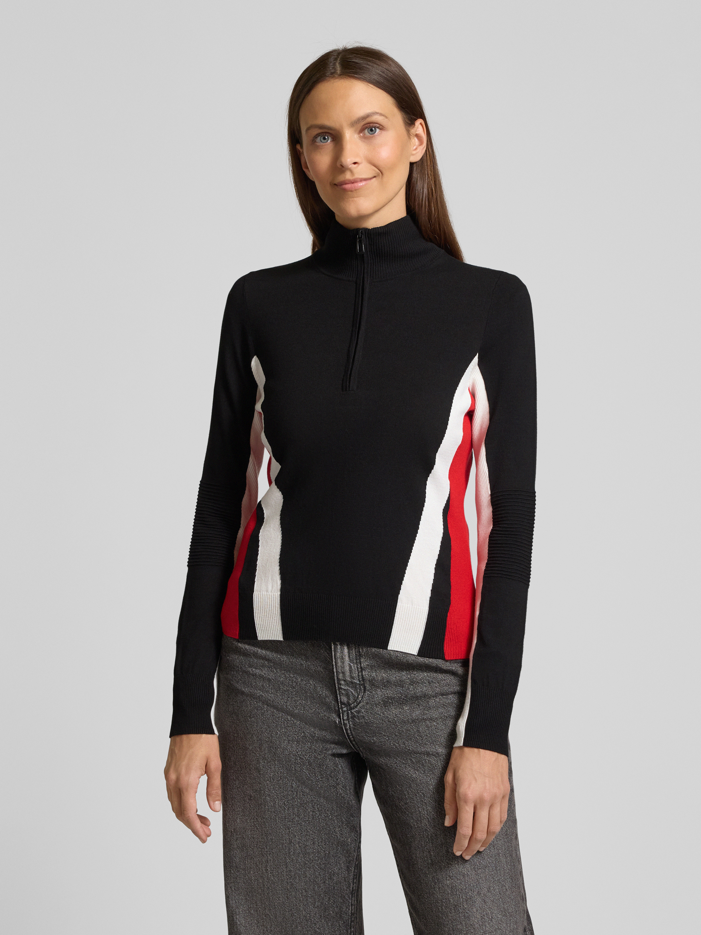 Der Damen-Troyer von Marc Cain zeigt sich in körpernaher Passform und bringt durch die Strick-Optik eine angenehme Struktur ins Outfit. Mit dem charakteristischen Kragen und langem Arm lässt sich das Oberteil vielseitig kombinieren. Dezente Ripp-Einsätze setzen modische Akzente und sorgen für Abwechslung.