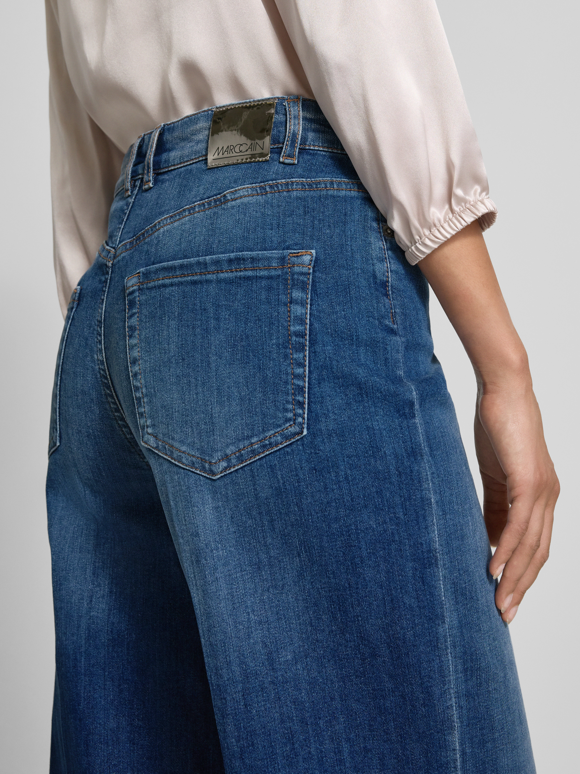 Die Wide Fit Jeans von Marc Cain kombiniert einen elastischen Baumwoll-Mix mit einem entspannten Schnitt, der Bewegungsfreiheit bietet. Das 5-Pocket-Design verleiht dem Modell eine klassische Note, während der flexible Stoff angenehmen Tragekomfort im Alltag gewährleistet. Ideal für vielseitige Kombinationen geeignet.