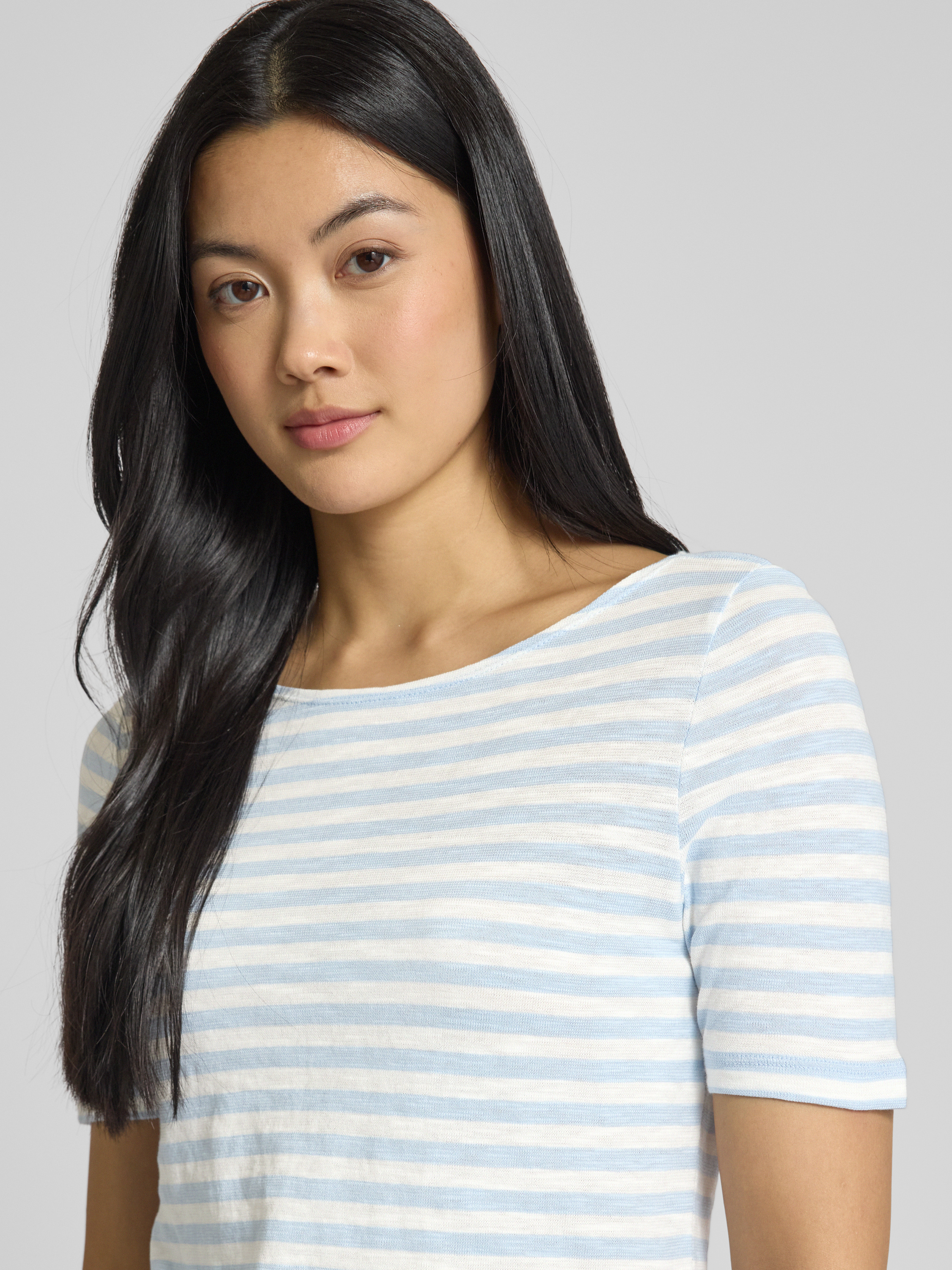 Das Marc O'Polo Regular Fit T-Shirt bietet durch den U-Boot-Ausschnitt und die kurzen Ärmel einen lässigen Look, der sich ideal für warme Tage eignet. Der Two-Tone-Effekt des gestreiften Slub-Jerseys verleiht jedem Outfit eine dezente Lebendigkeit. Reine Baumwolle sorgt für angenehmen Tragekomfort.