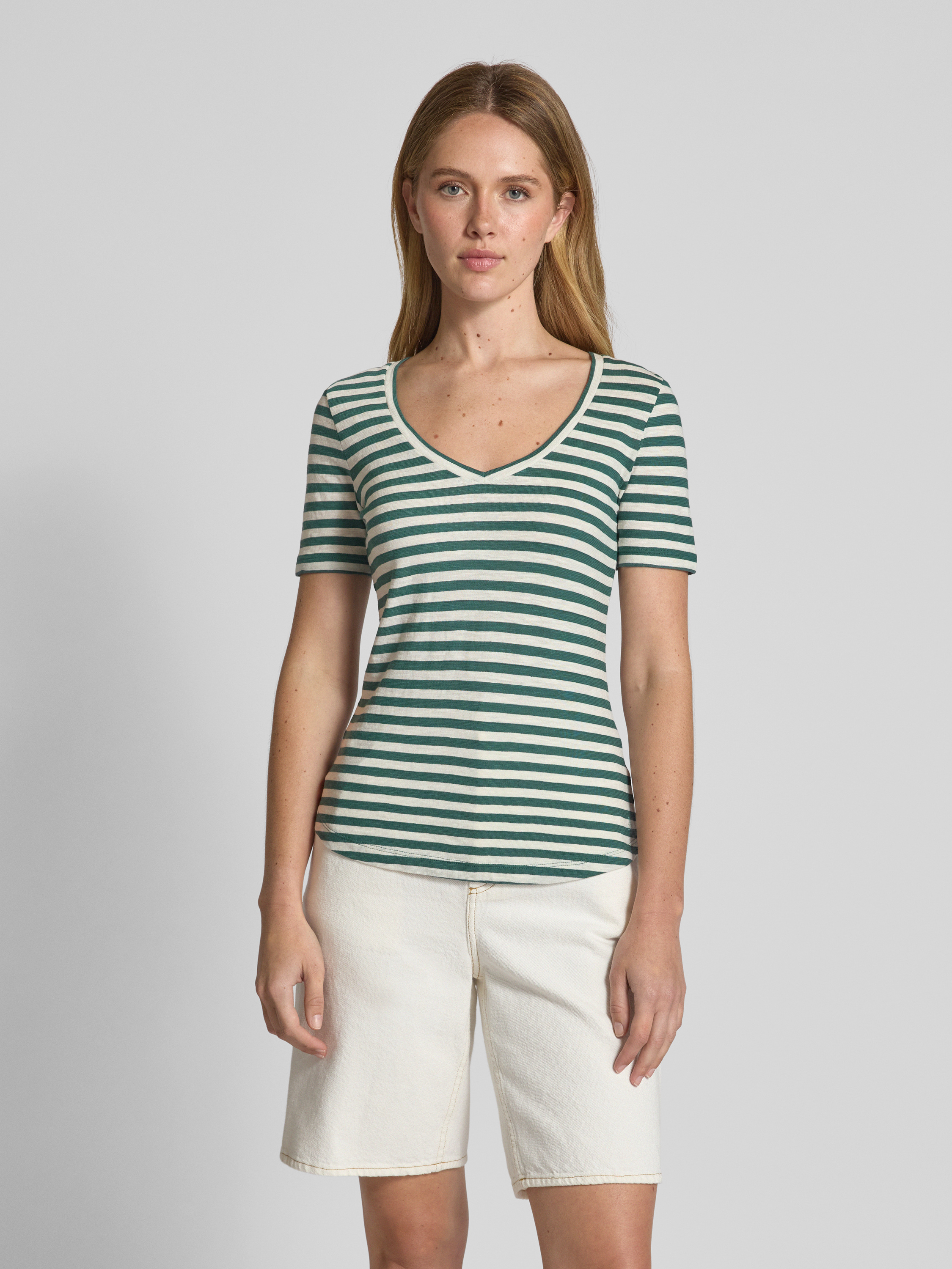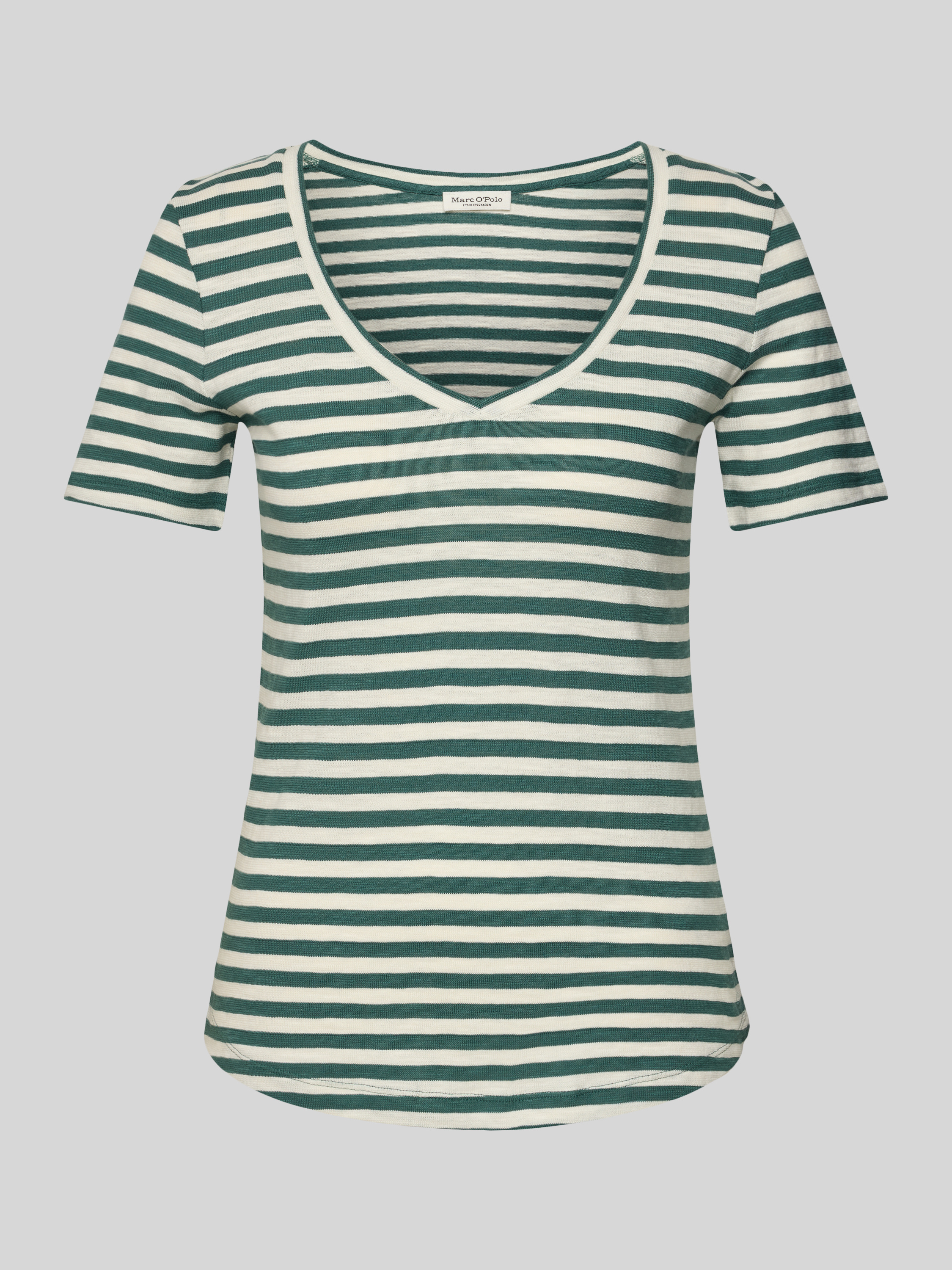 Das Damen Regular Fit T-Shirt von Marc O'Polo zeigt sich mit einem dezenten Allover-Muster, das dem klassischen Schnitt eine frische Note verleiht. Der angenehm weiche Slub Jersey aus reiner Baumwolle sorgt für ein bequemes Tragegefühl im Alltag. Durch den V-Ausschnitt und die abgerundete Saumlinie wirkt das Shirt vielseitig kombinierbar.