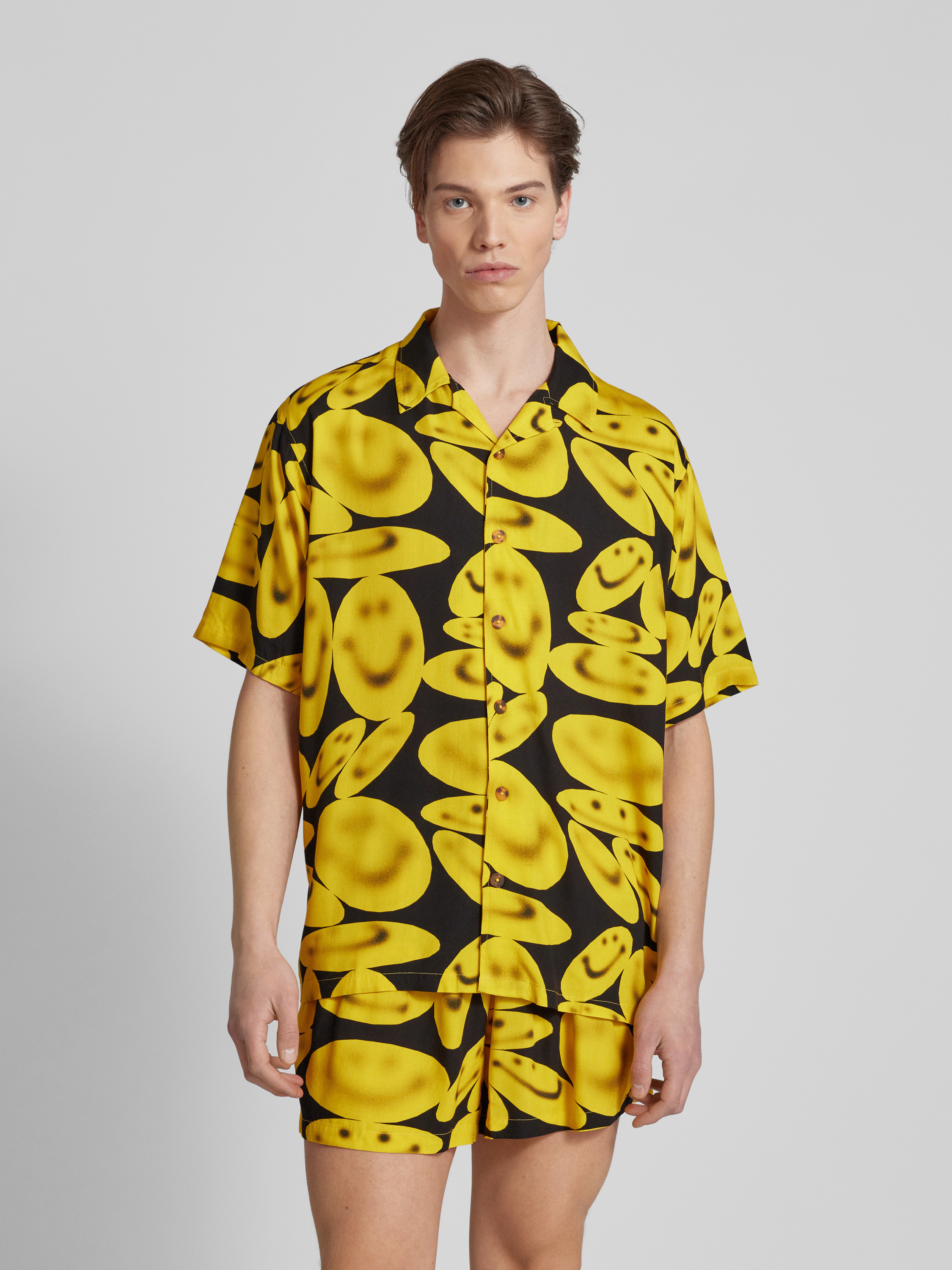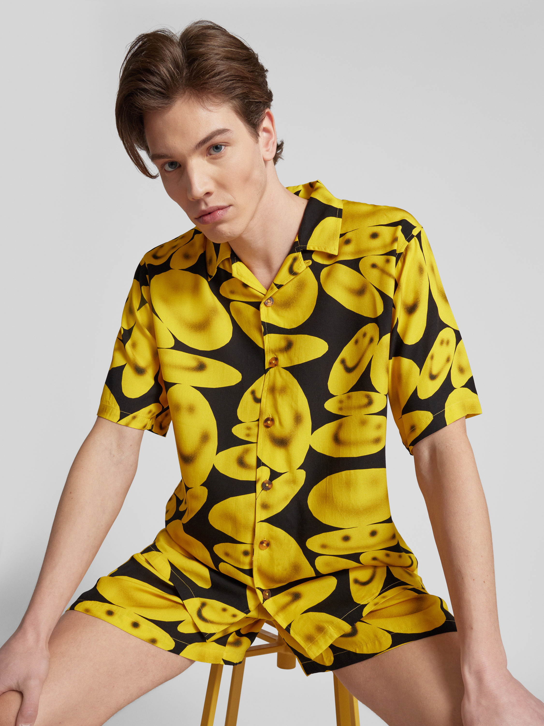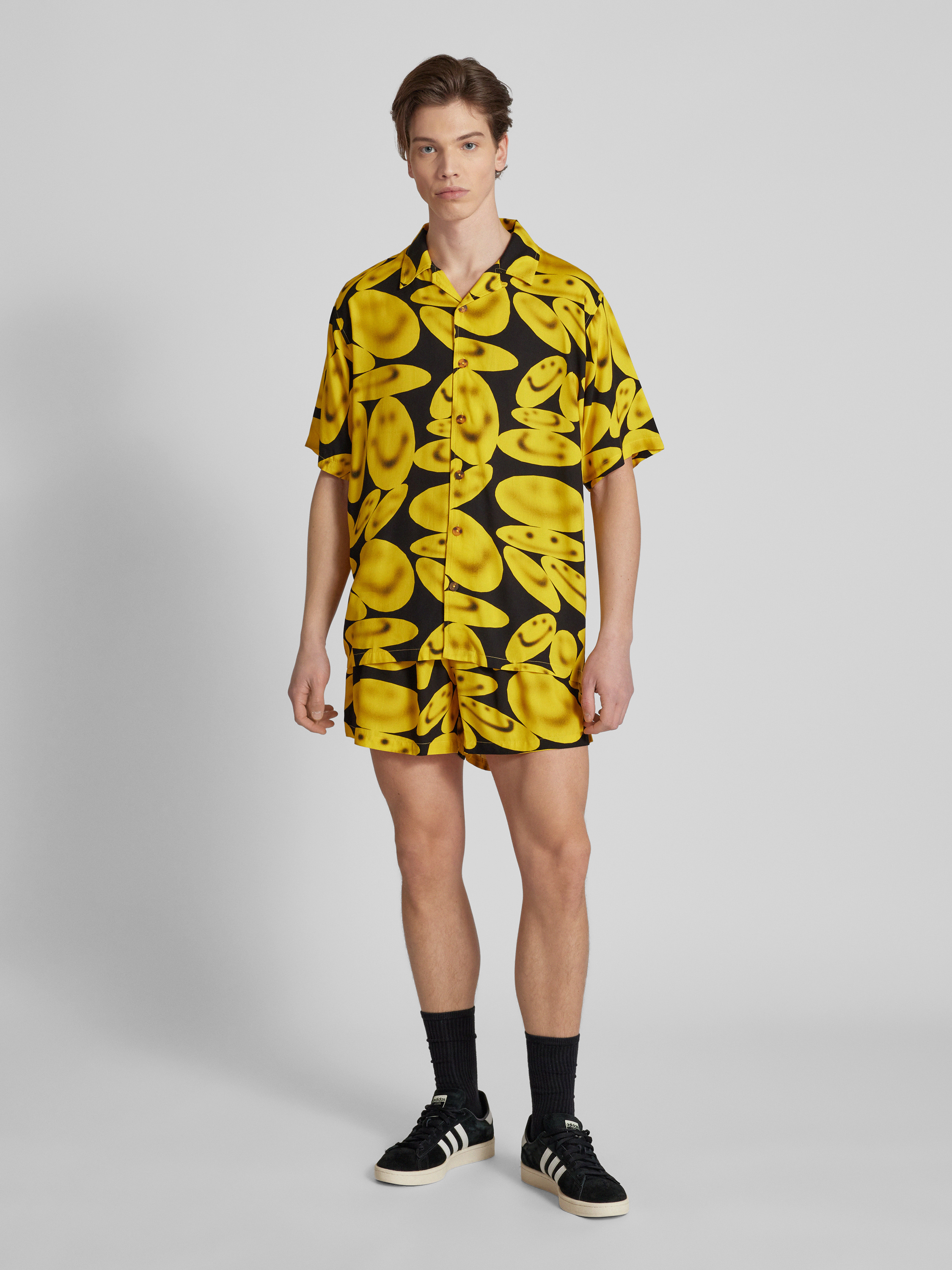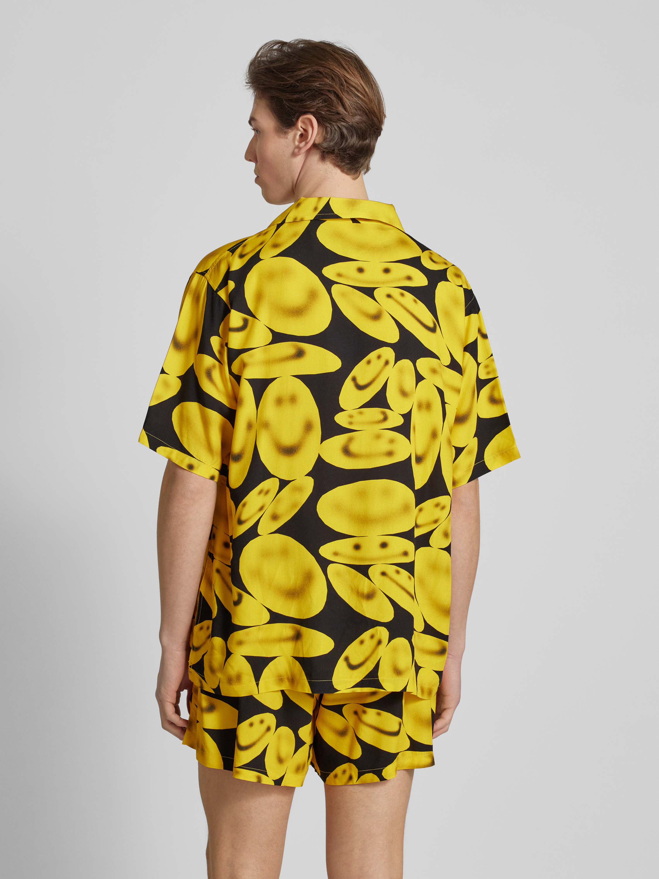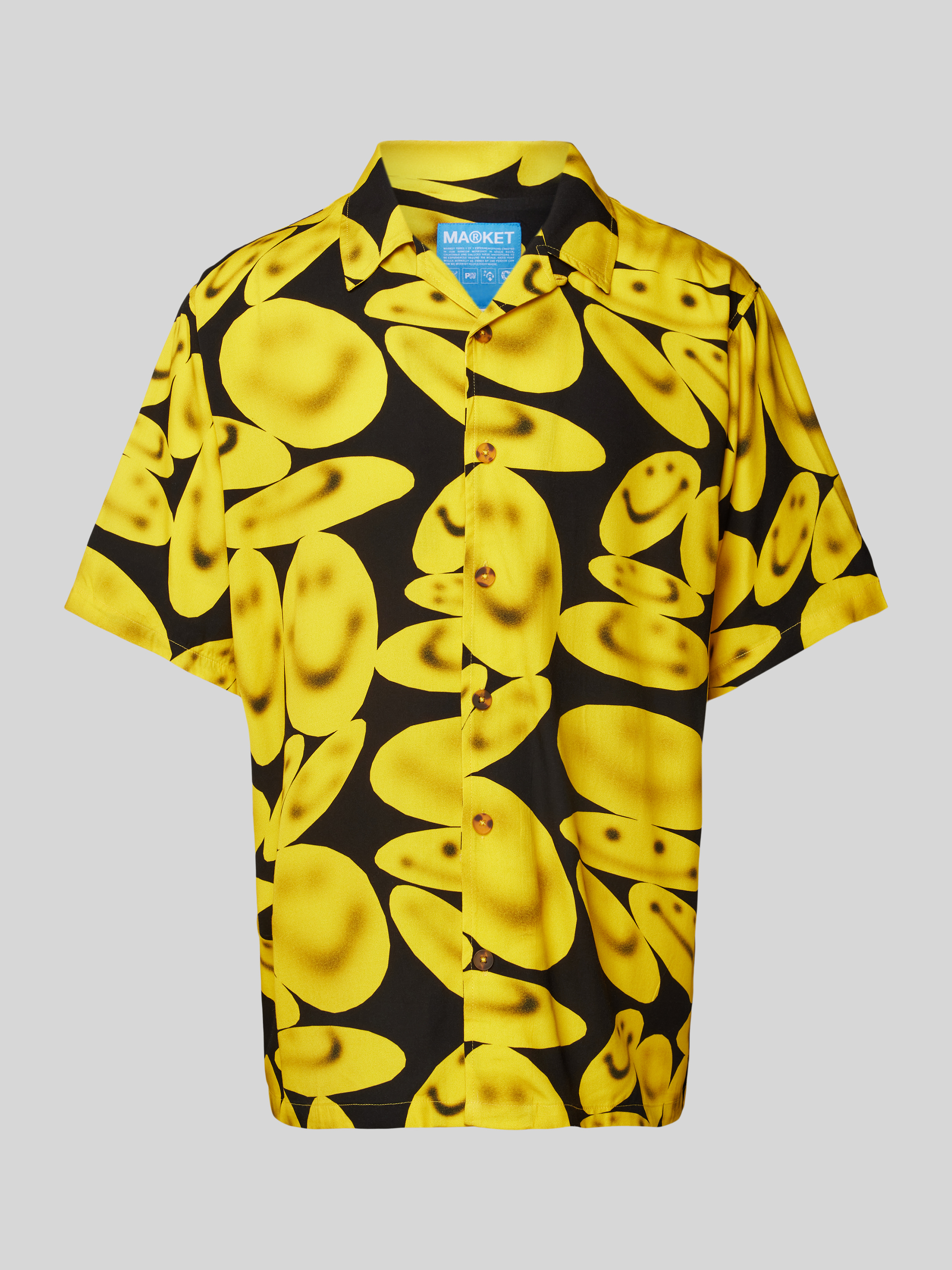 Das Herren Freizeithemd von MARKET, Modell 'Smiley', besticht durch seinen entspannten Relaxed Fit und einen modernen Reverskragen. Aus reinem Rayon gefertigt, bietet es ein angenehmes Tragegefühl. Das markante Allover-Muster verleiht dem Hemd eine besondere Note und sorgt für Abwechslung.